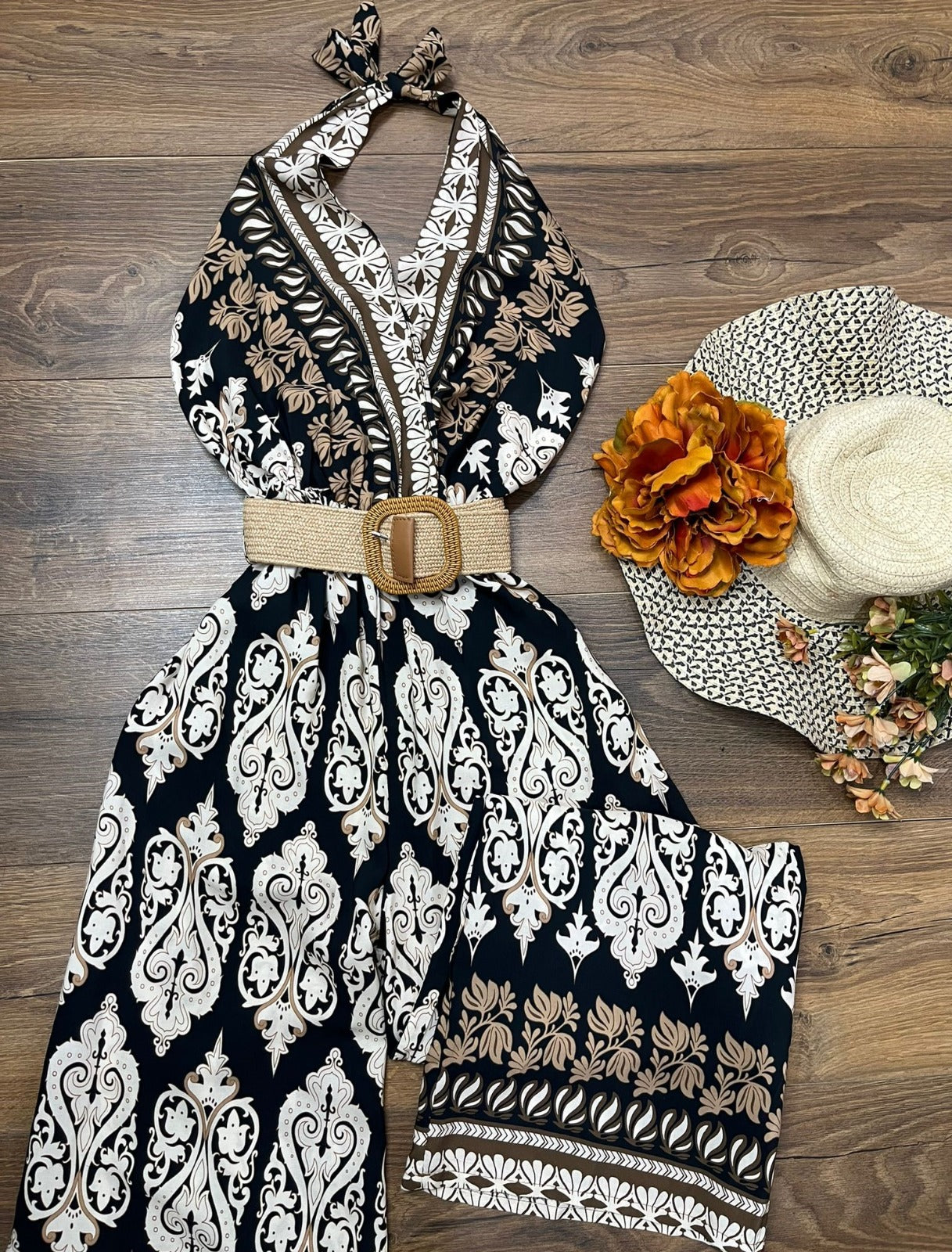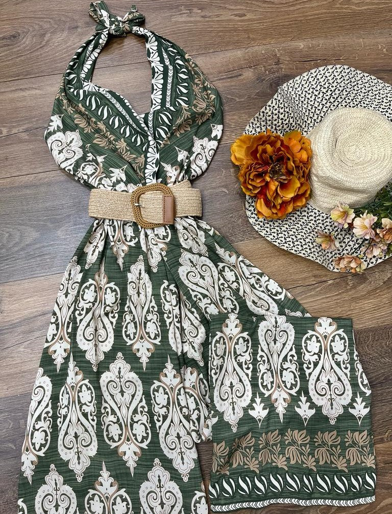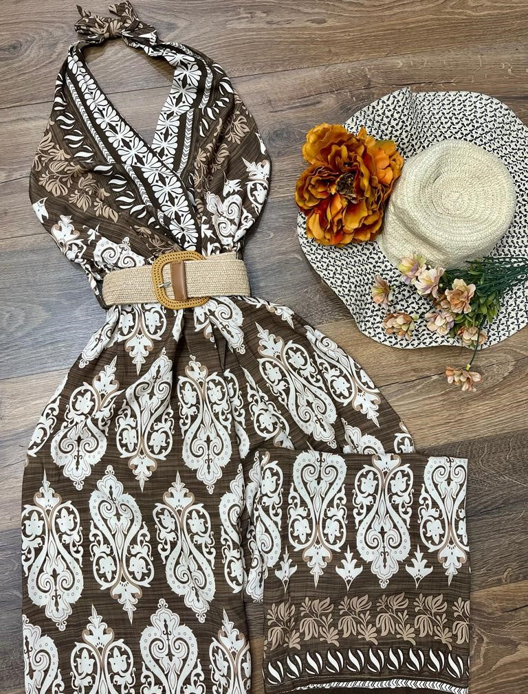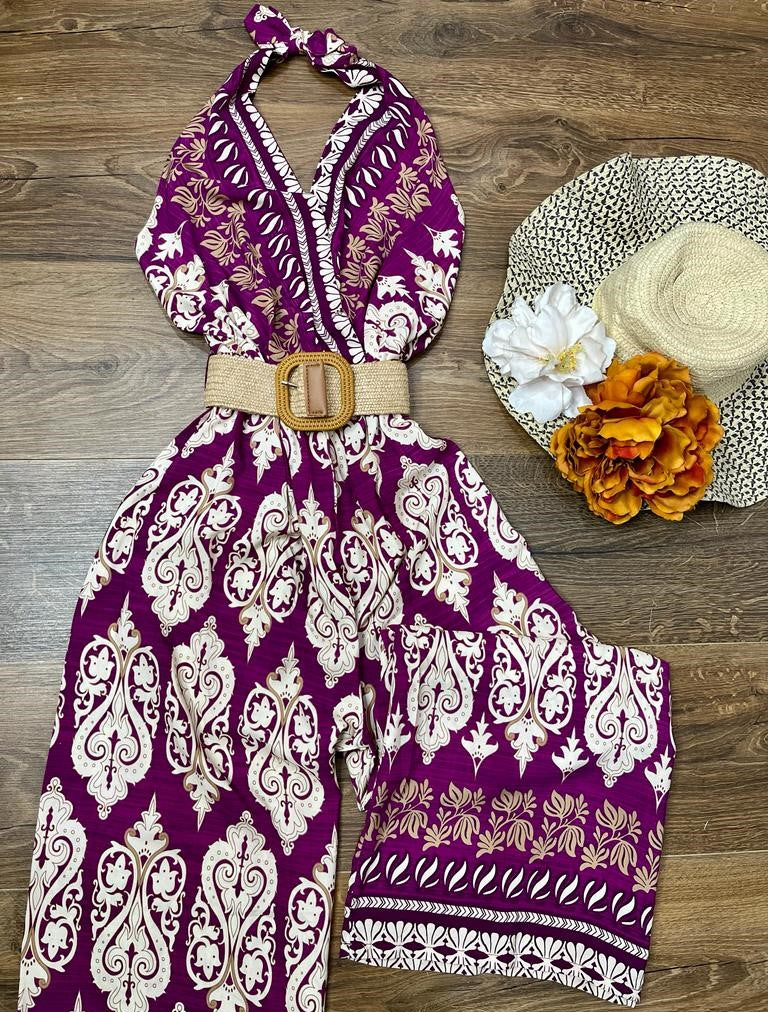 Tuta in viscosa con fantasia astratta, allacciatura al collo, fascia elastica sul retro, pantalone palazzo e cintura inclusa. Fabbricato in Italia.