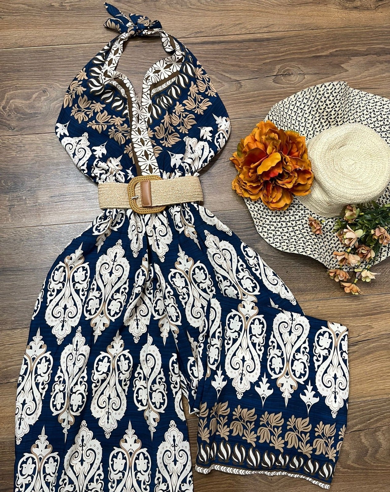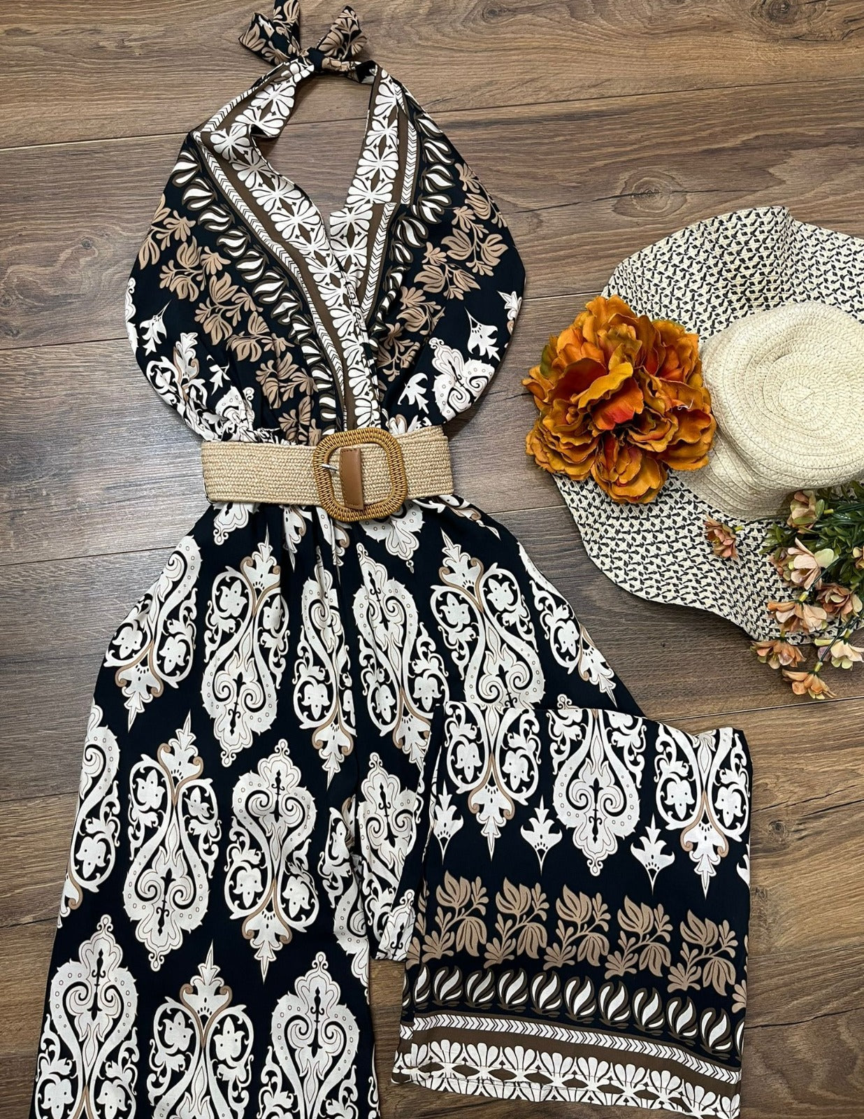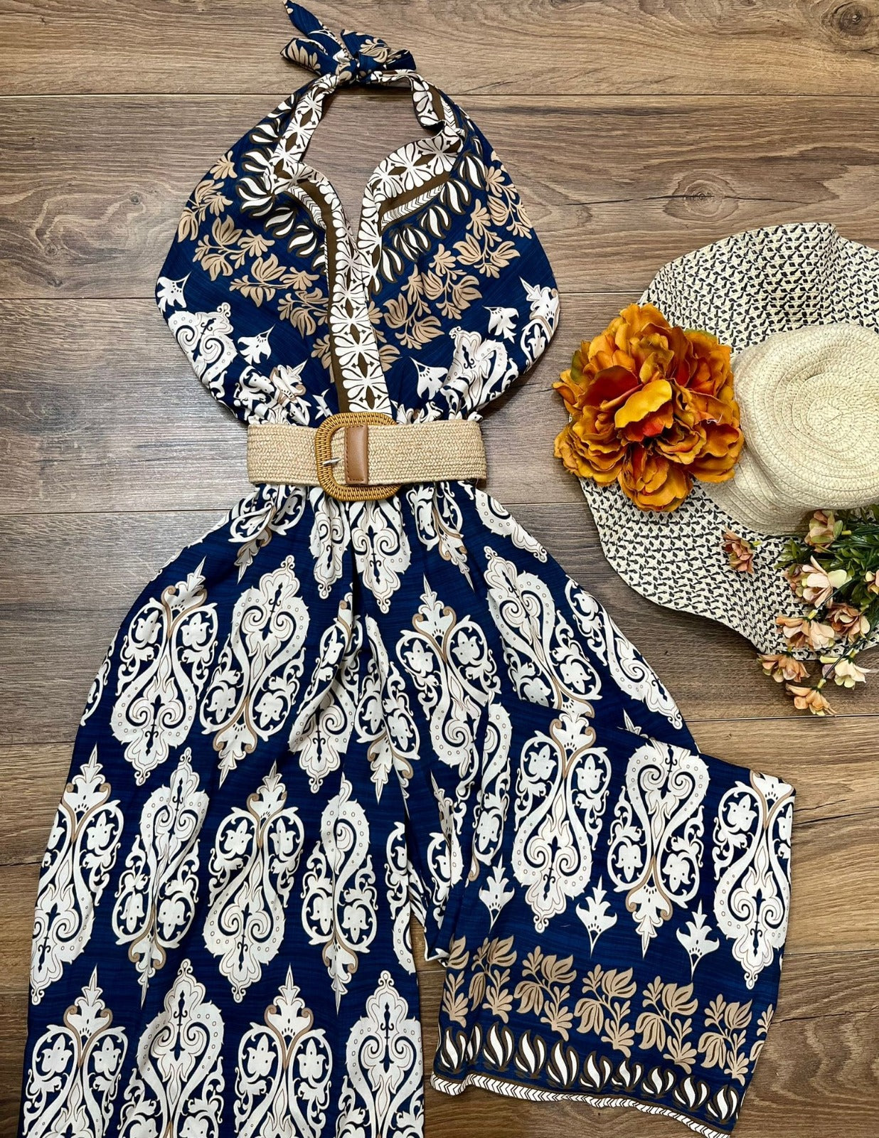 Tuta in viscosa con fantasia astratta, allacciatura al collo, fascia elastica sul retro, pantalone palazzo e cintura inclusa. Fabbricato in Italia.