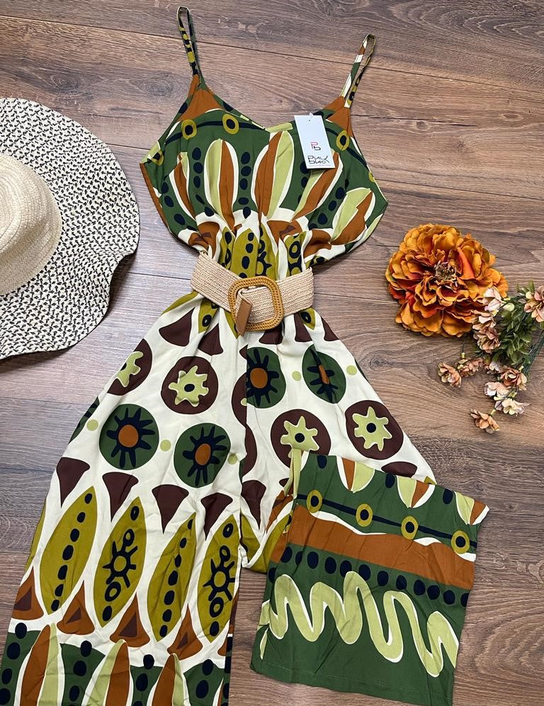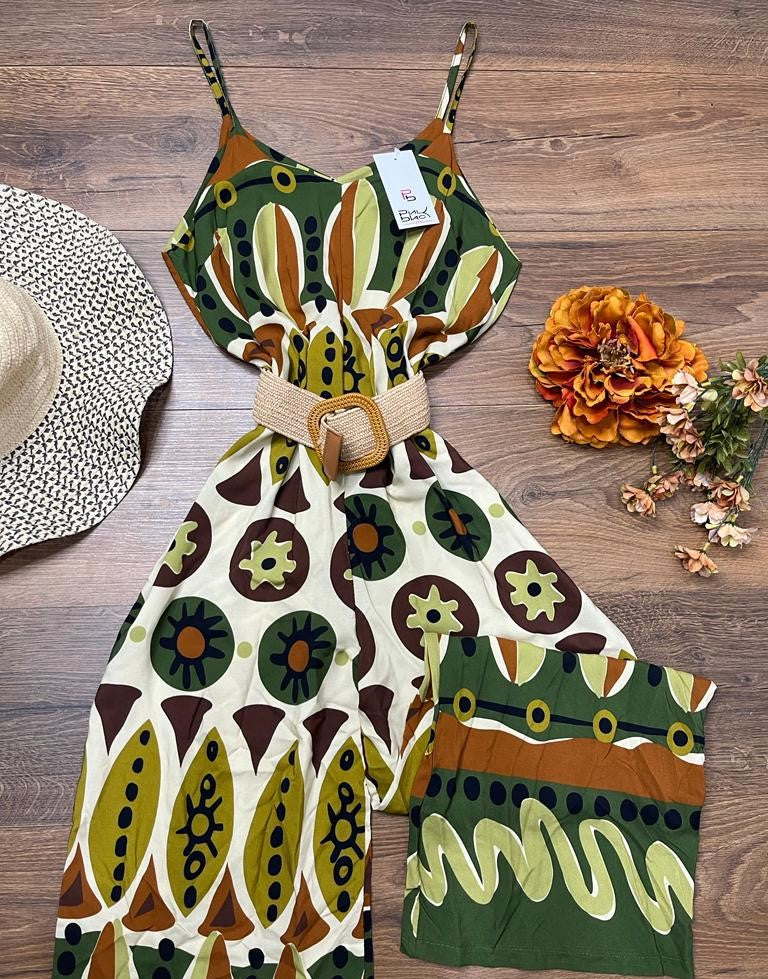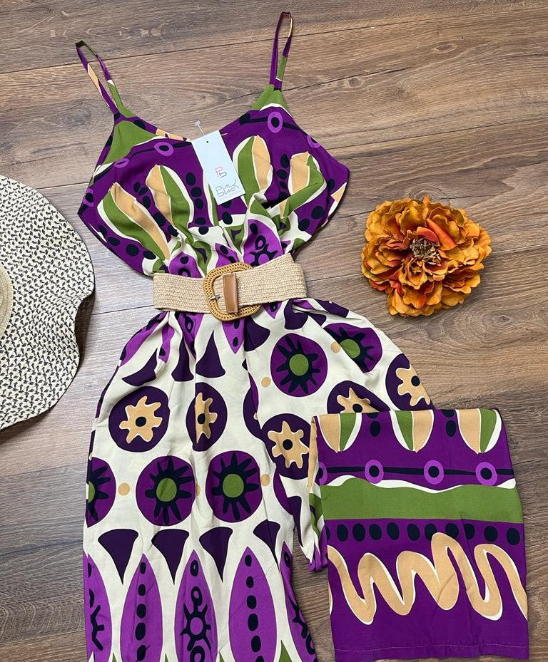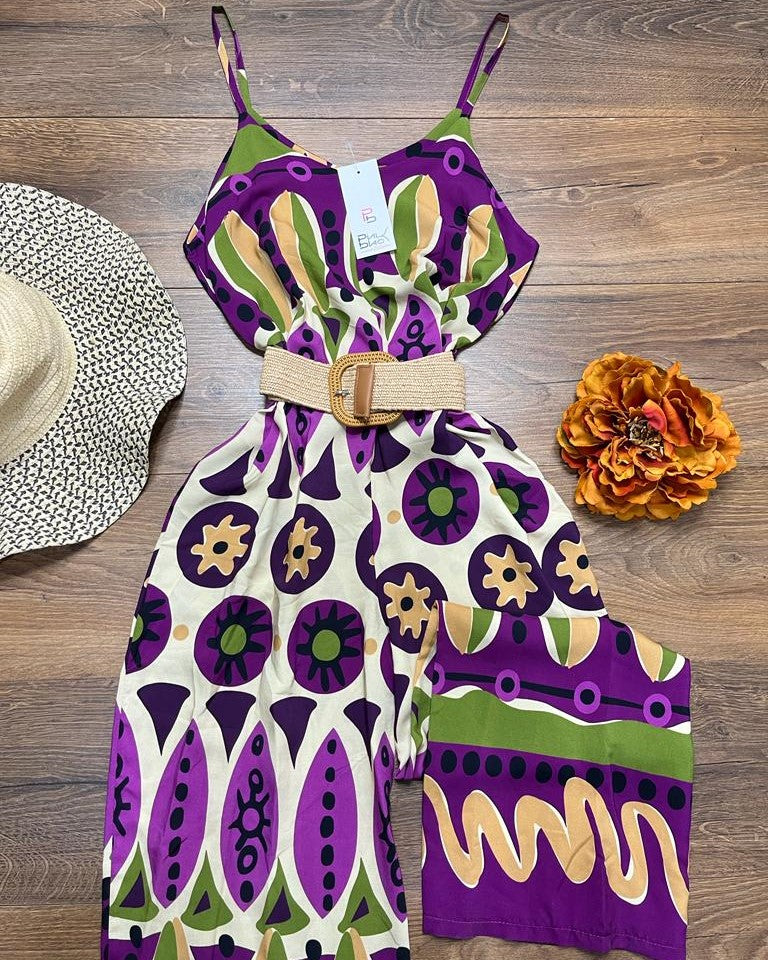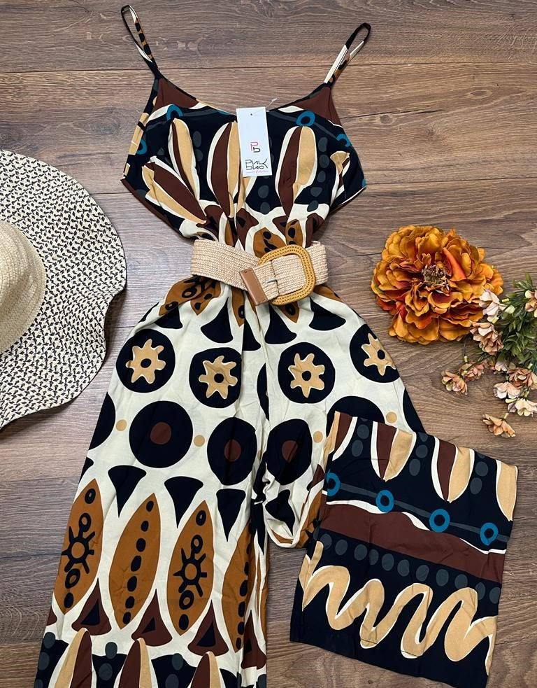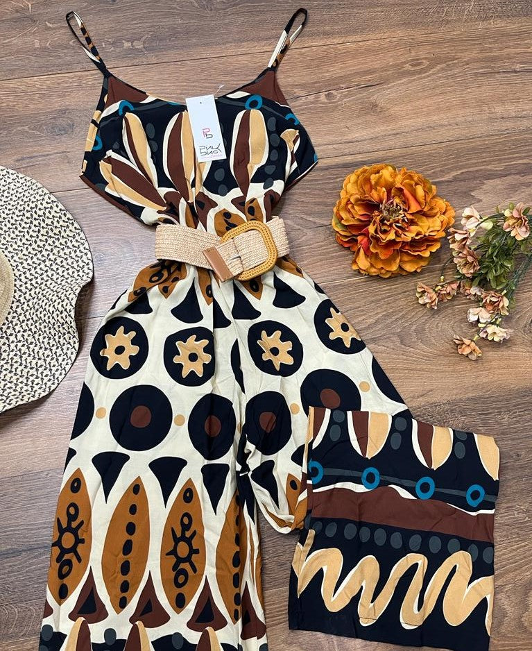 Tuta in viscosa con fantasia astratta, pantalone palazzo e cintura inclusa. Fabbricato in Italia.