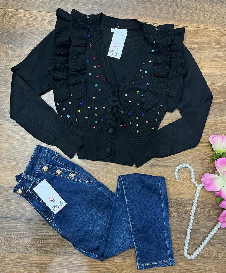 Cardigan in viscosa con volant e strass multicolor. Fabbricato all'estero.