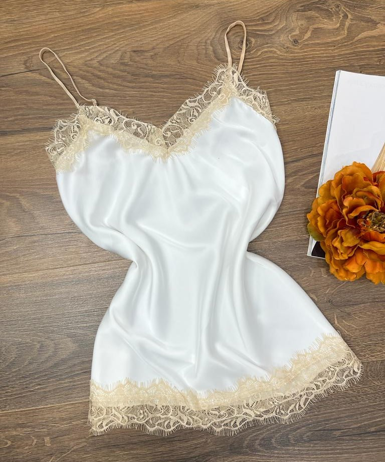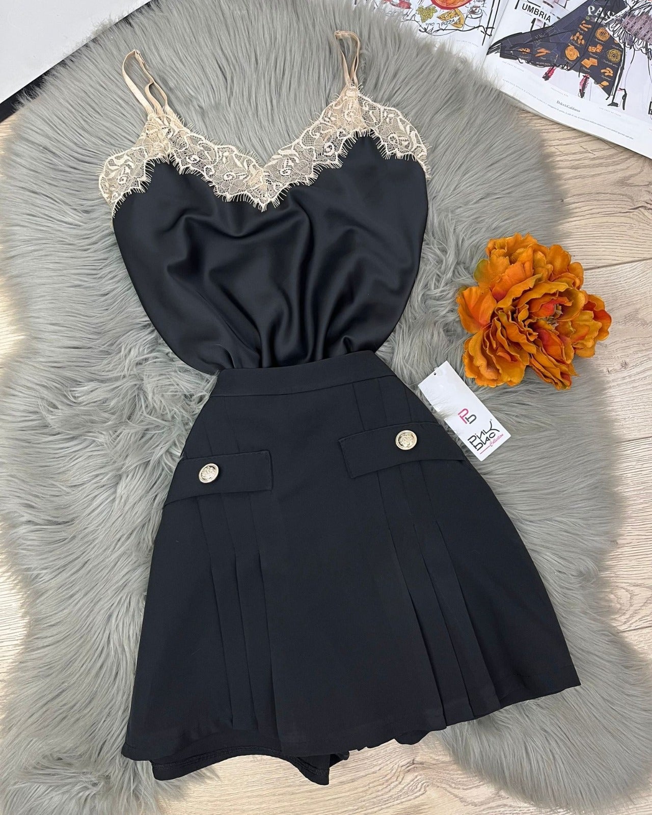 Top effetto raso con ricamo in pizzo e spalline regolabili. Fabbricato in Italia.