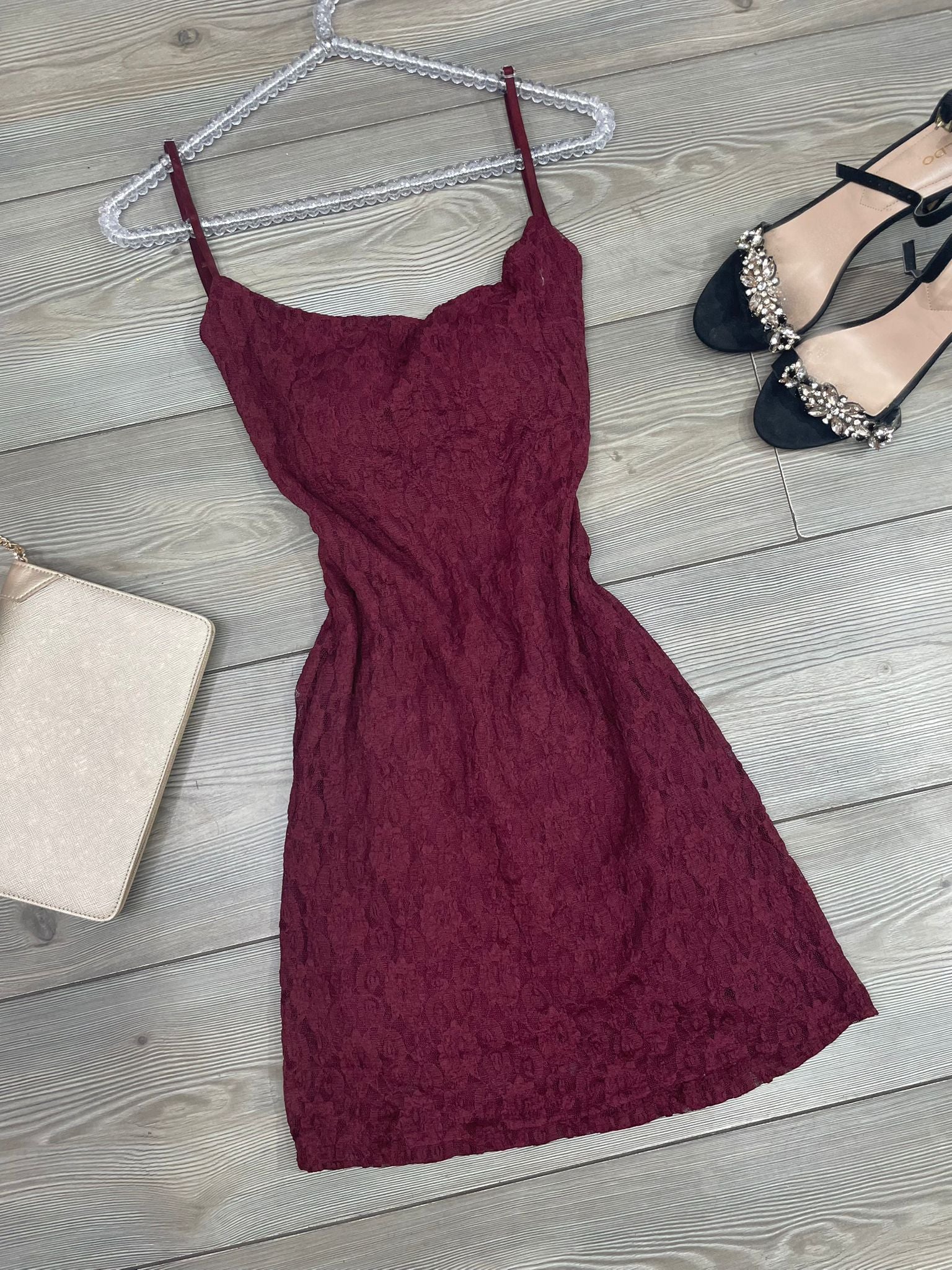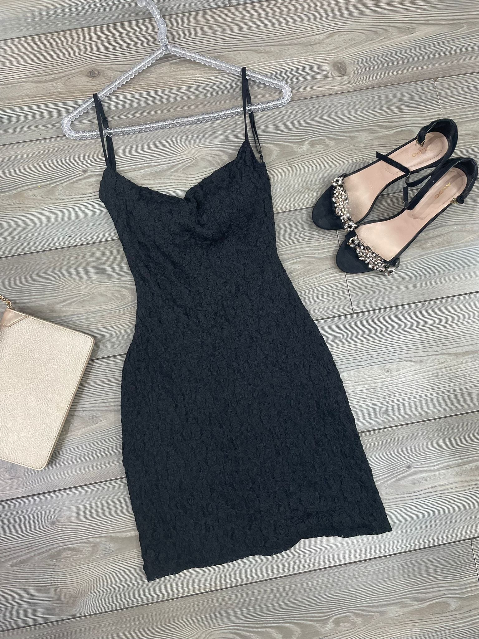 Abito corto effetto pizzo, vestibilità aderente,spalline regoalbili e scollatura sulla schiena