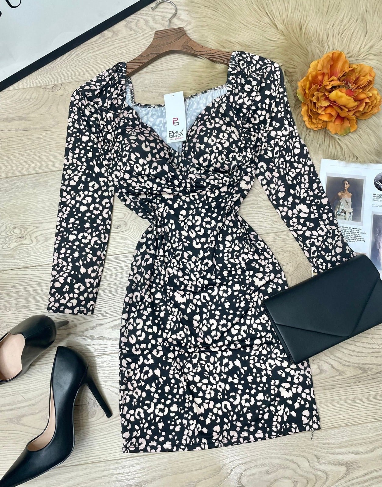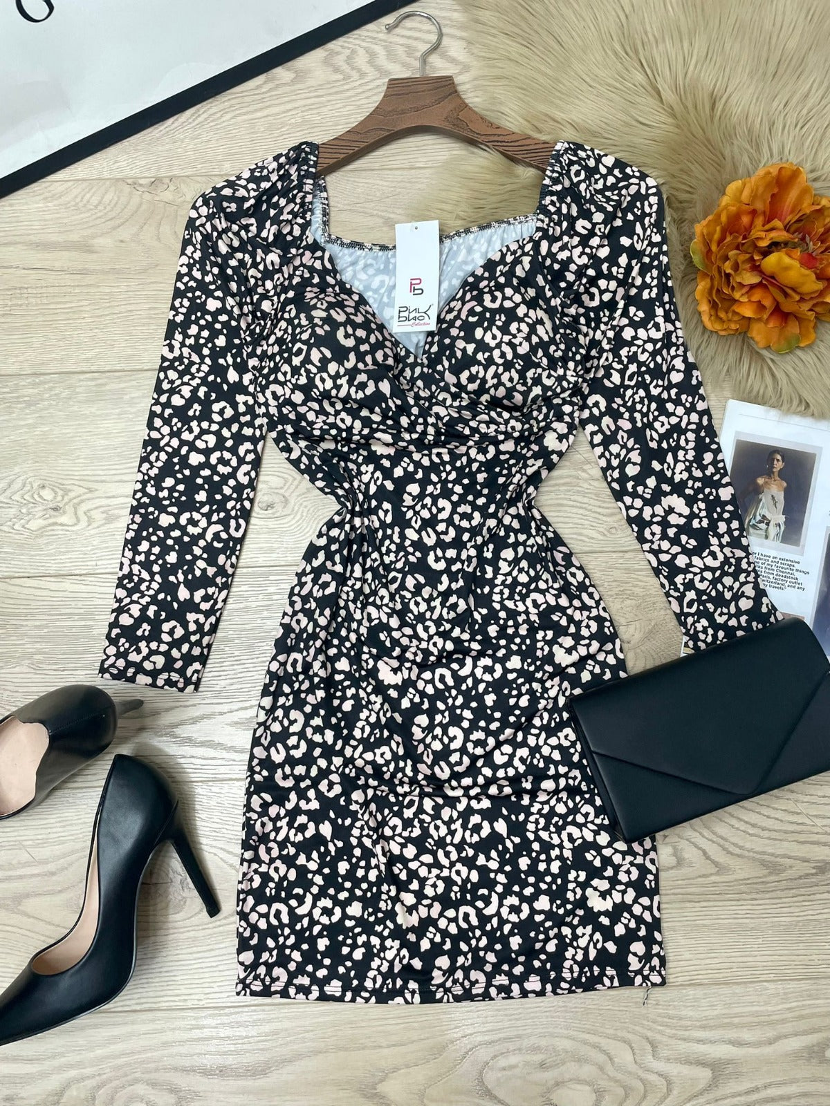 Abito in leggero tessuto strutturato con fantasia astatta, coppe preformate e manica lunga. Fabbricato in Italia.