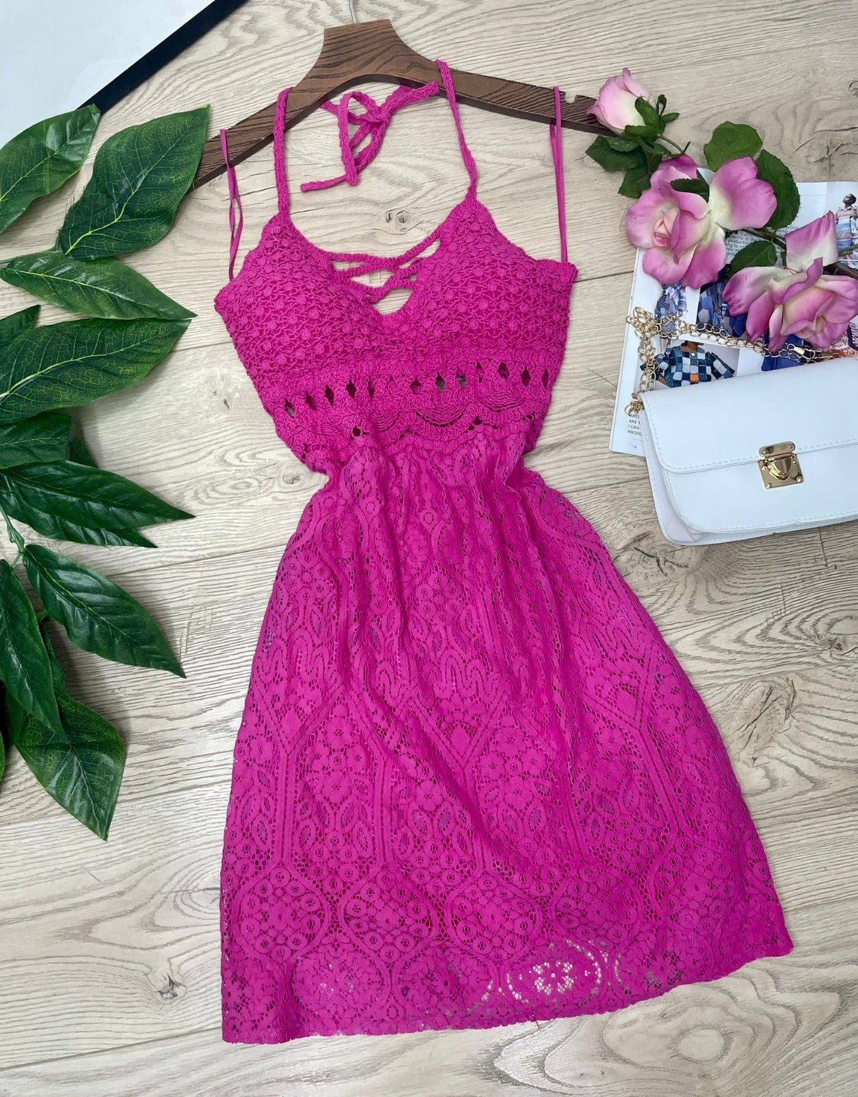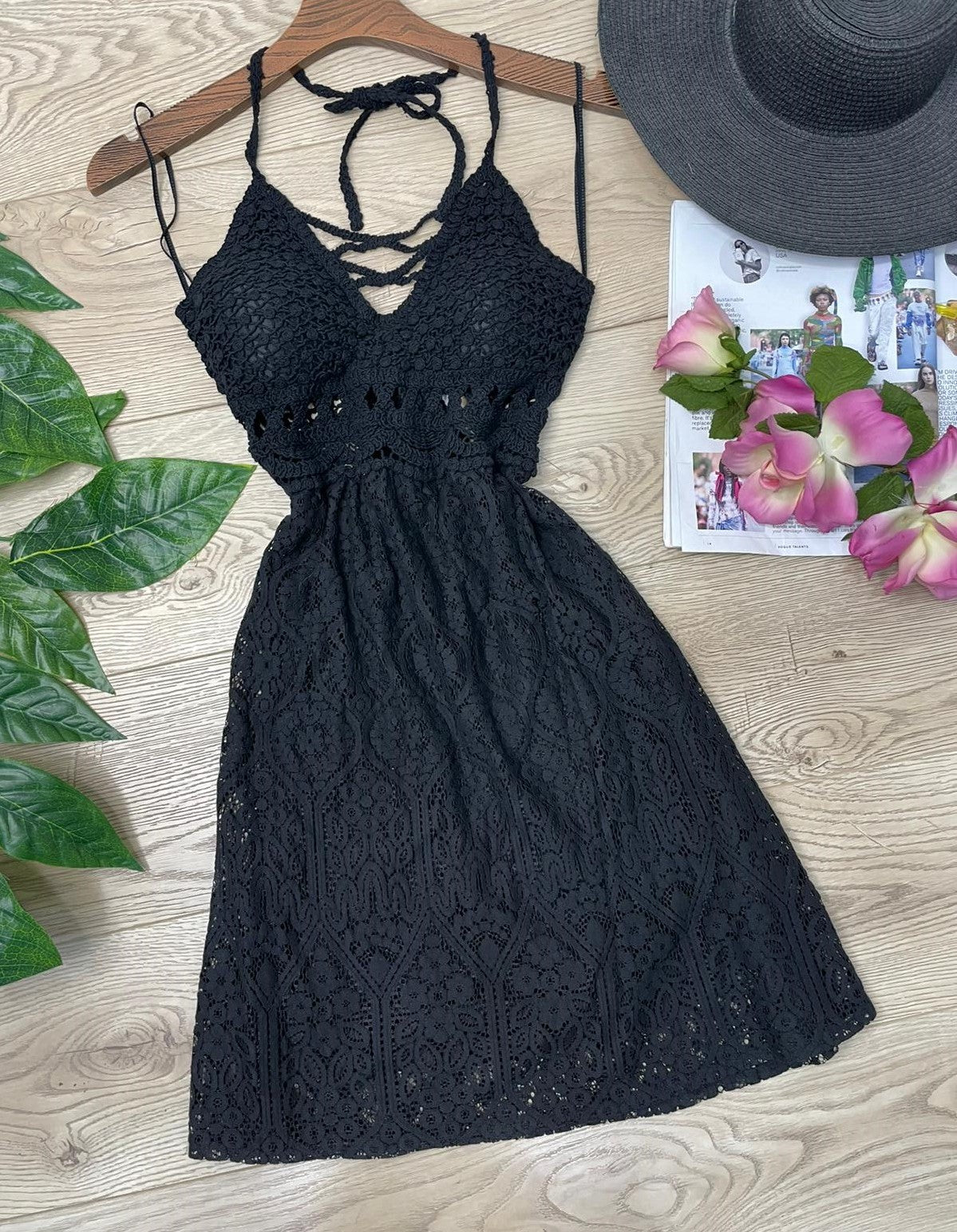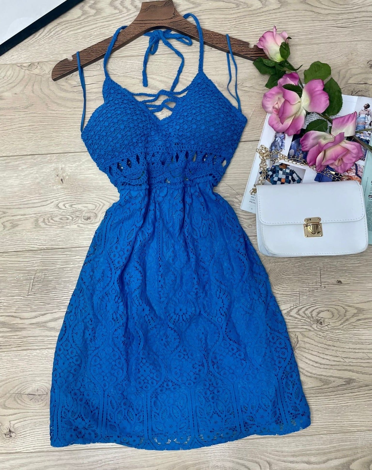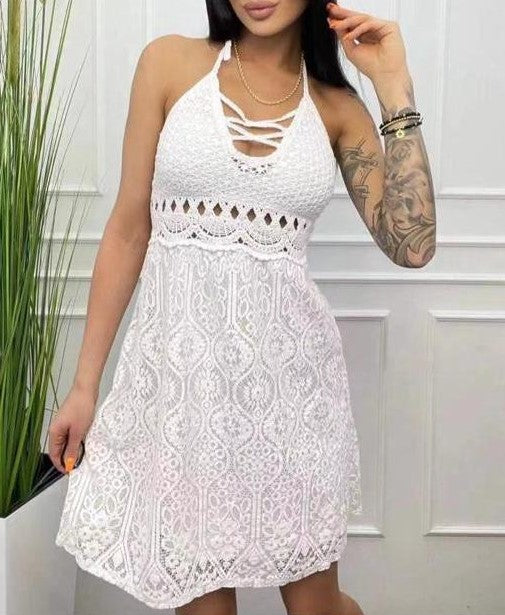 Abito con ricamo in pizzo e macramè, allacciatura al collo e sulla schiena, coppe preformate ed elastico sul retro. Fabbricato in Italia.