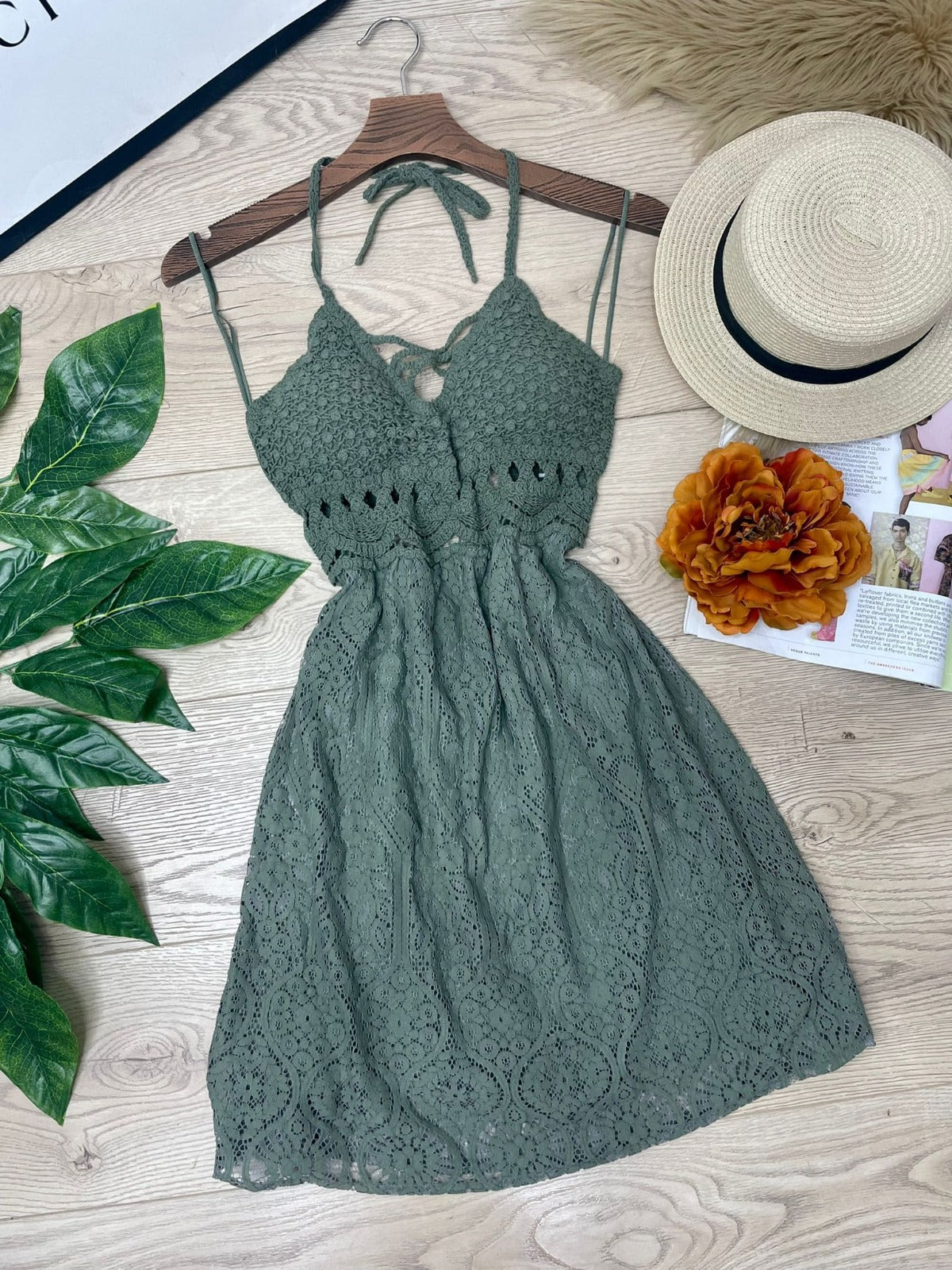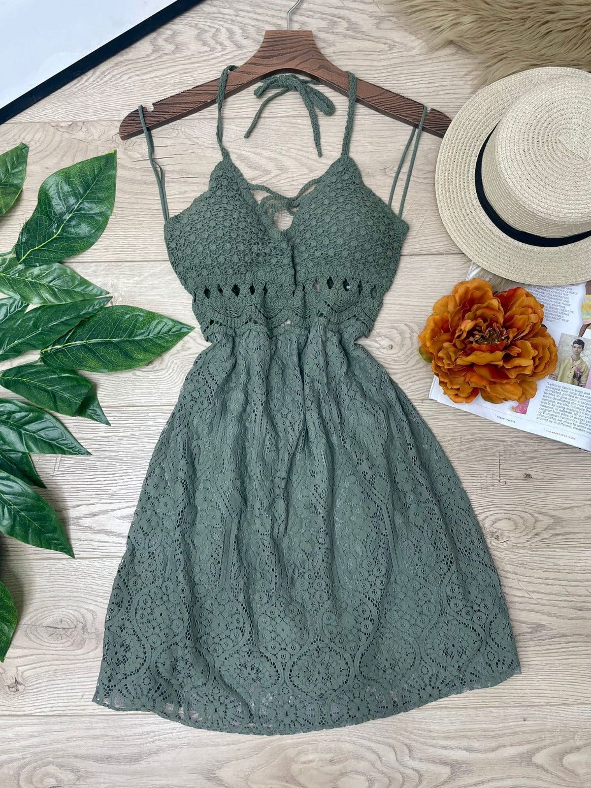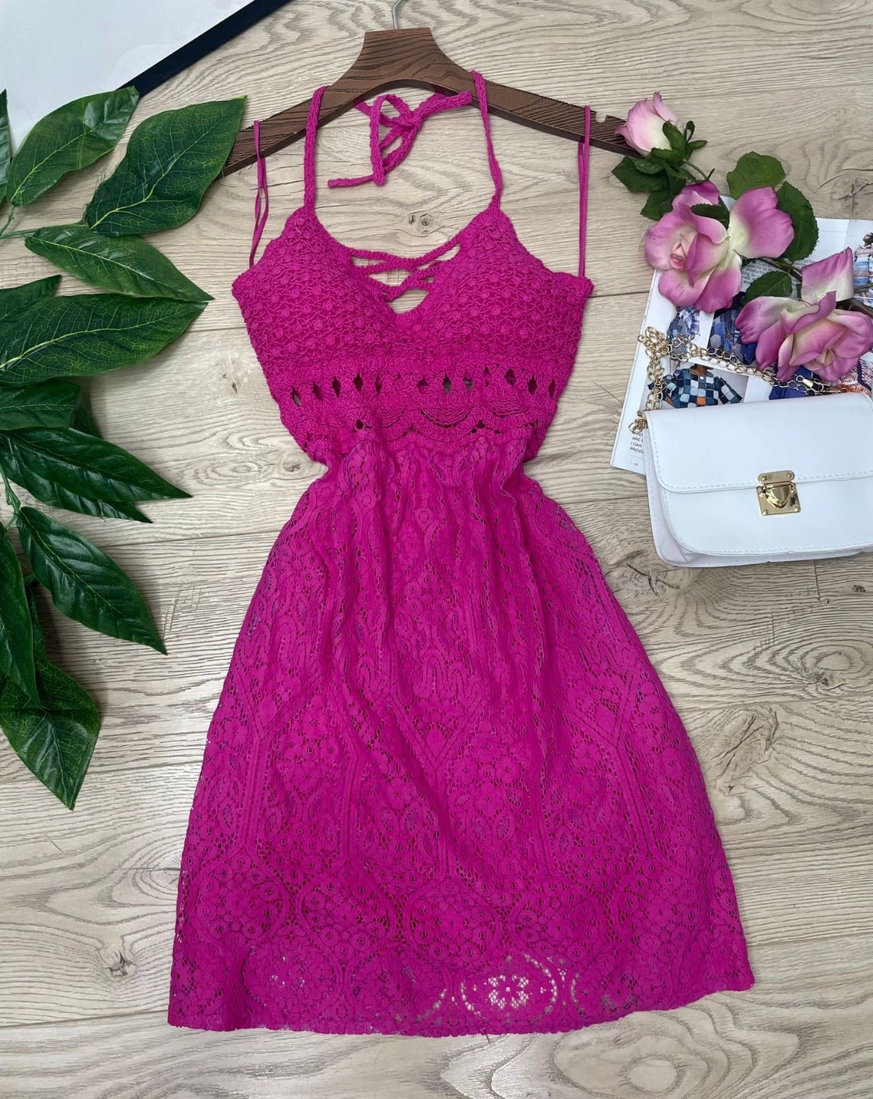 Abito con ricamo in pizzo e macramè, allacciatura al collo e sulla schiena, coppe preformate ed elastico sul retro. Fabbricato in Italia.