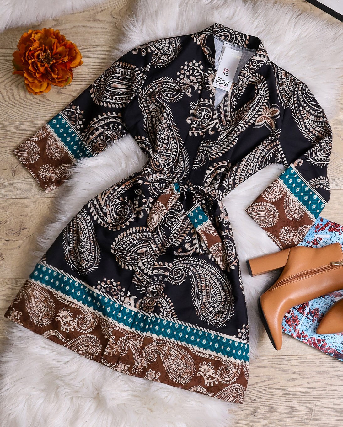 Abito in tessuto strutturato con fantasia astratta e cintura inclusa. Fabbricato in Italia.