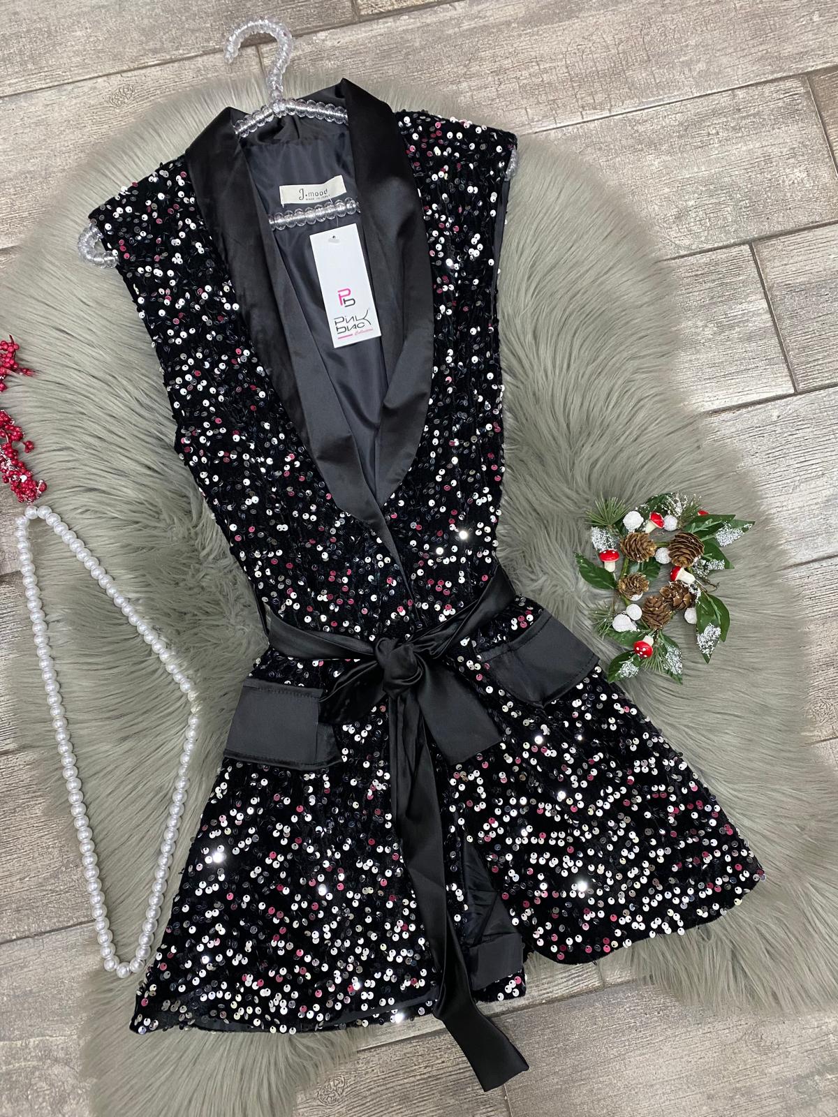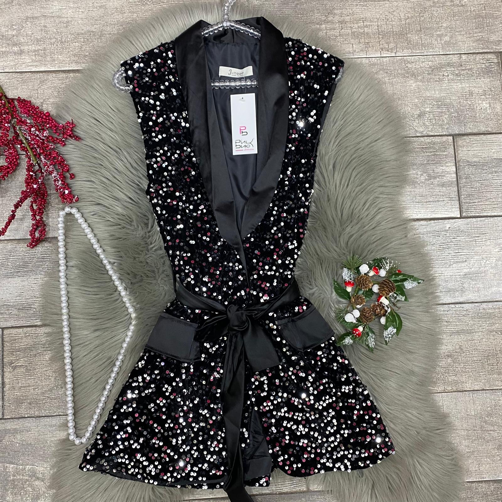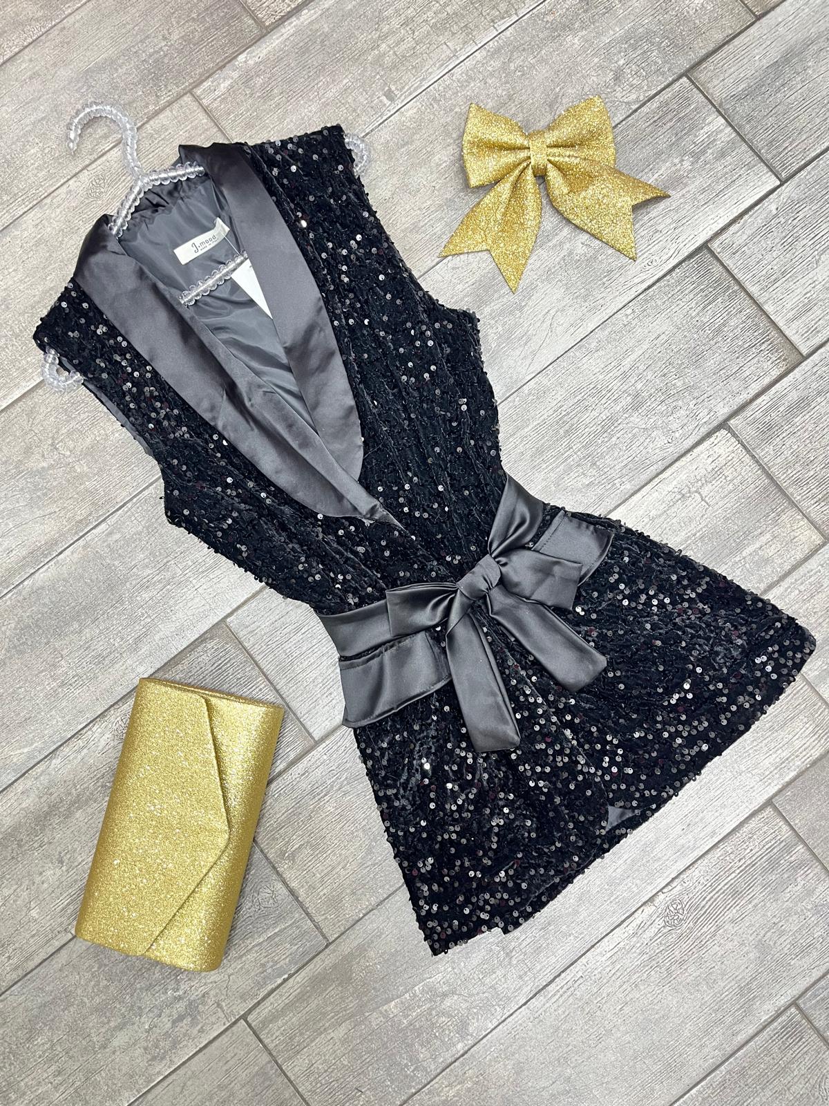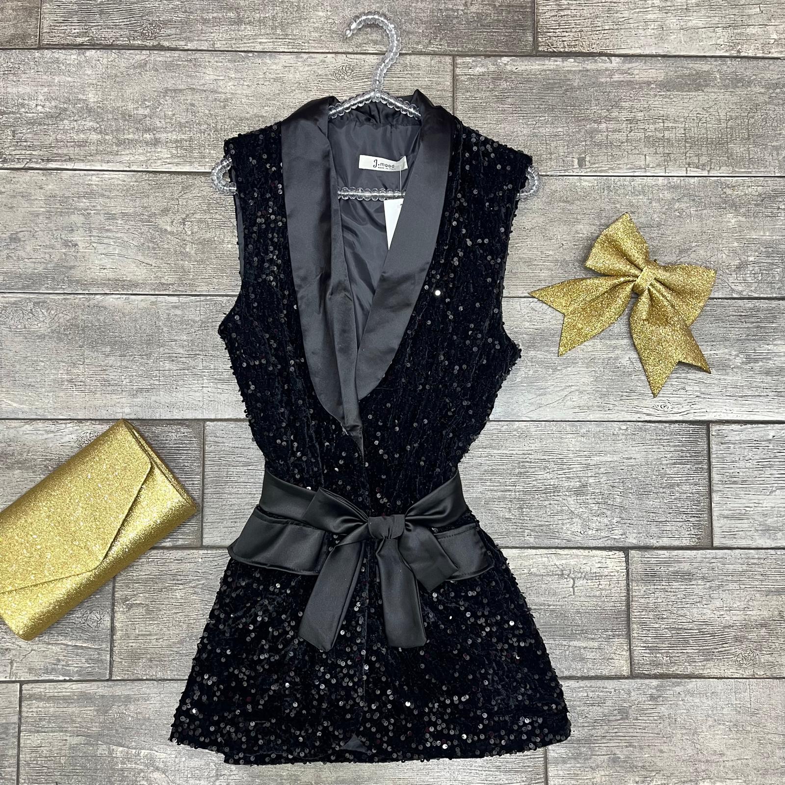 Abito con paillettes ,collo a scialle in raso ,cintura effetto raso inclusa ,e tasche laterali estetiche