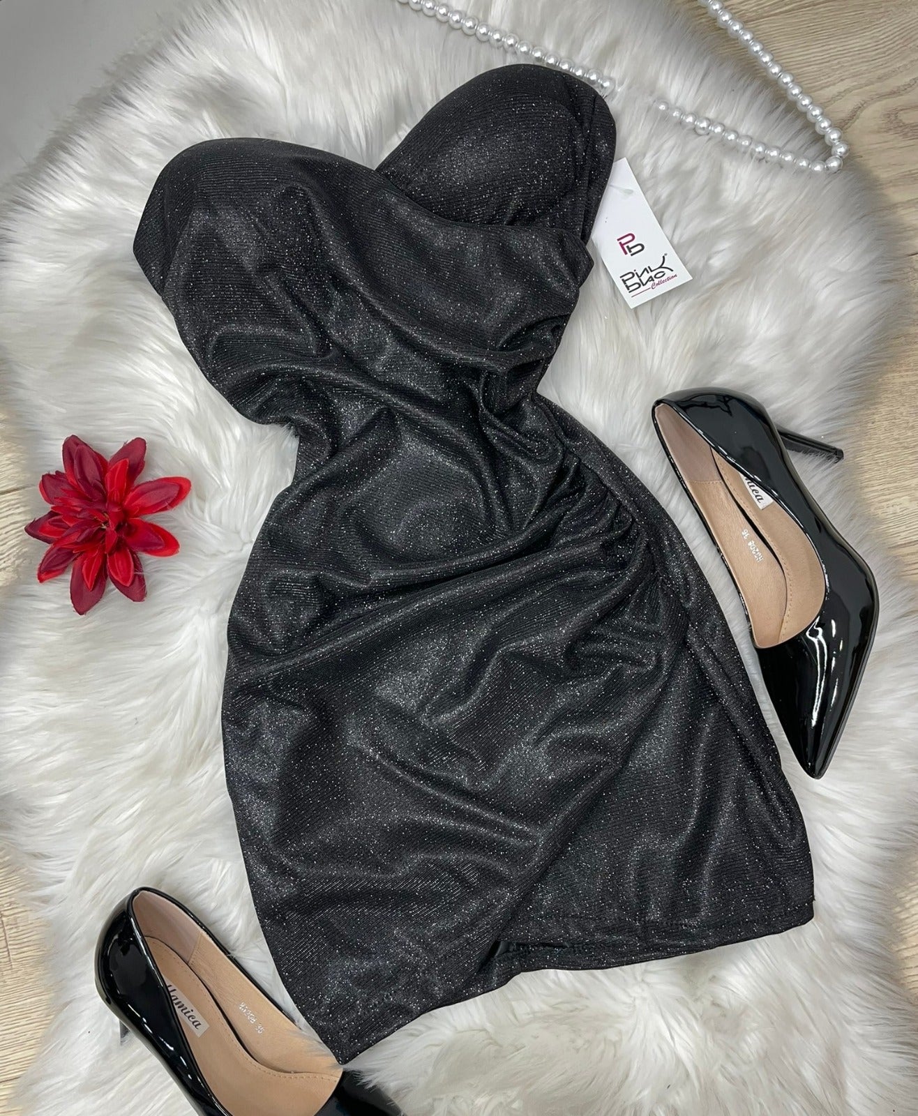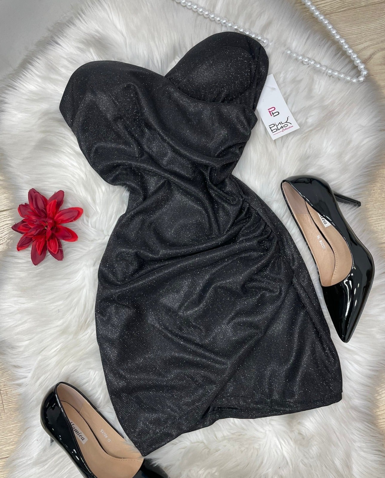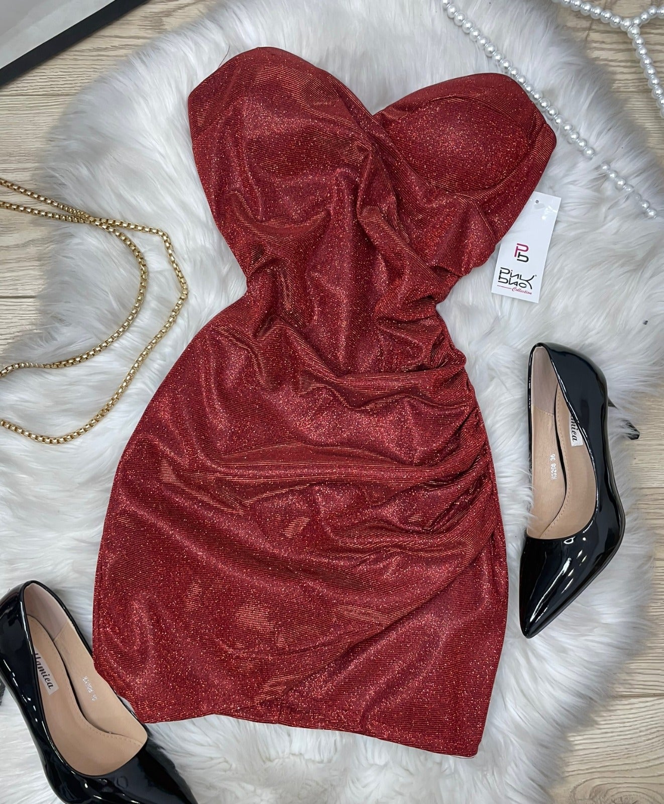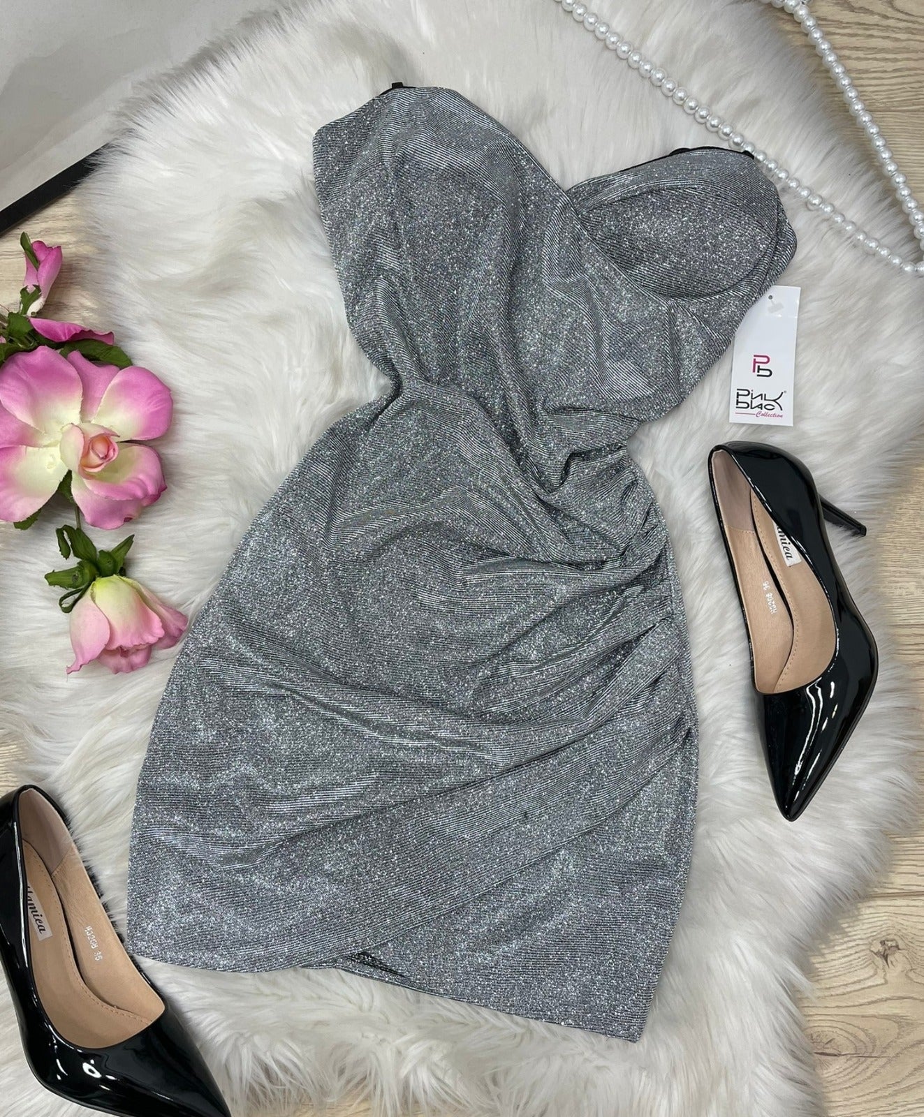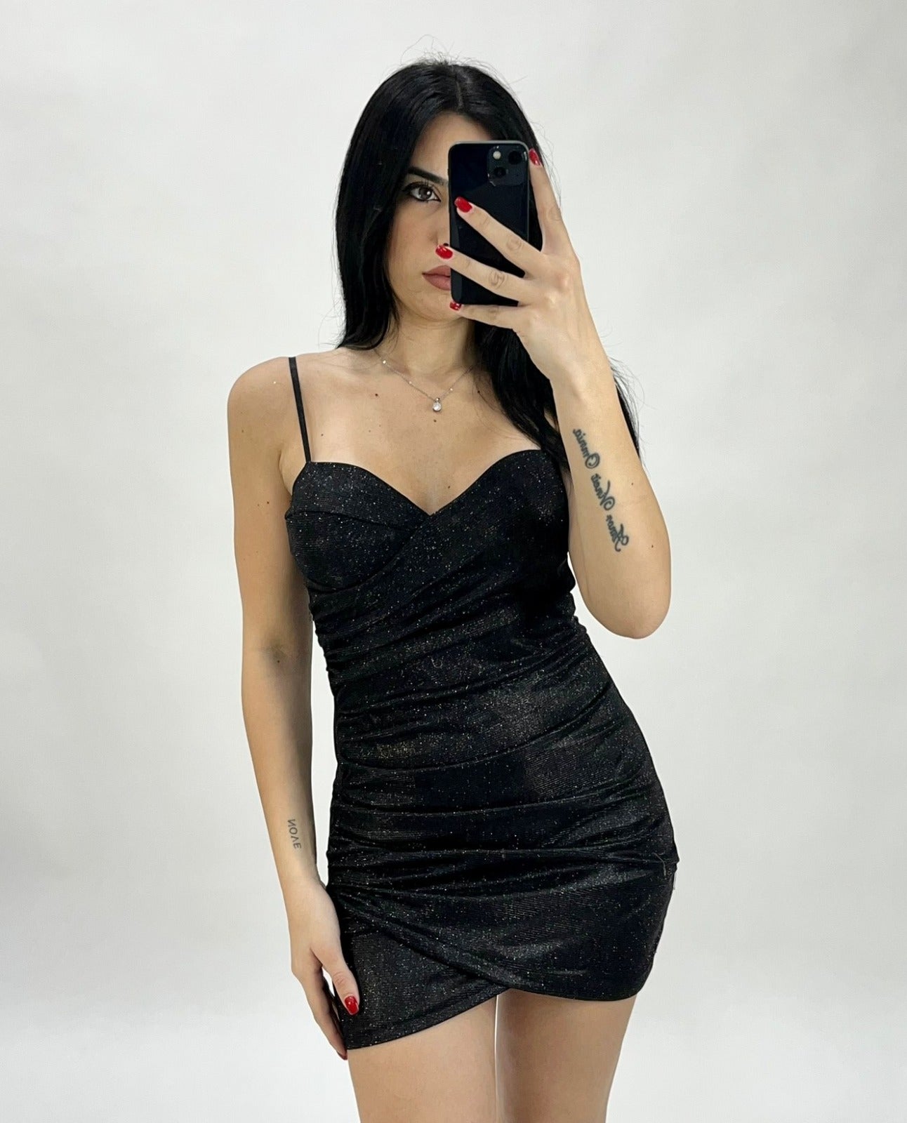 Abito in lurex con coppe preformate, spalline regolabili, drappeggio laterale, gonna a portafoglio e chiusura con cerniera. Fabbricato in Italia.