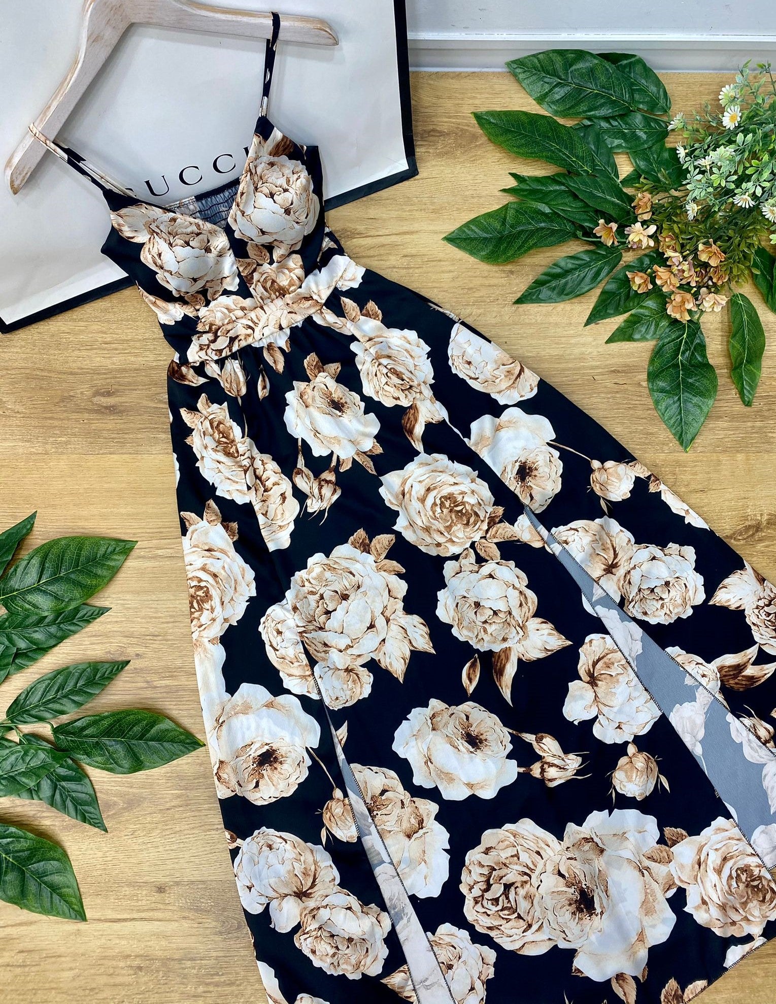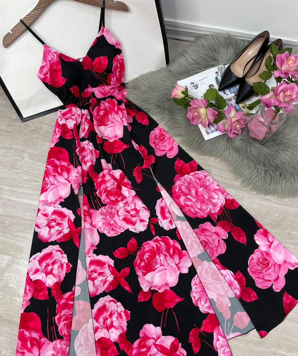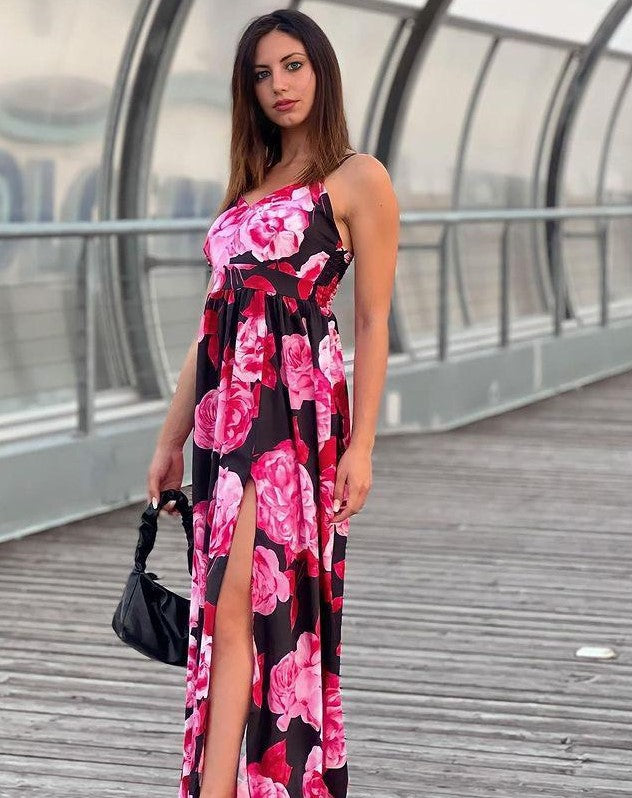 Abito in leggero tessuto strutturato con fantasia floreale, fascia elastica sul retro e gonna con spacchi laterali. Fabbricato in Italia.