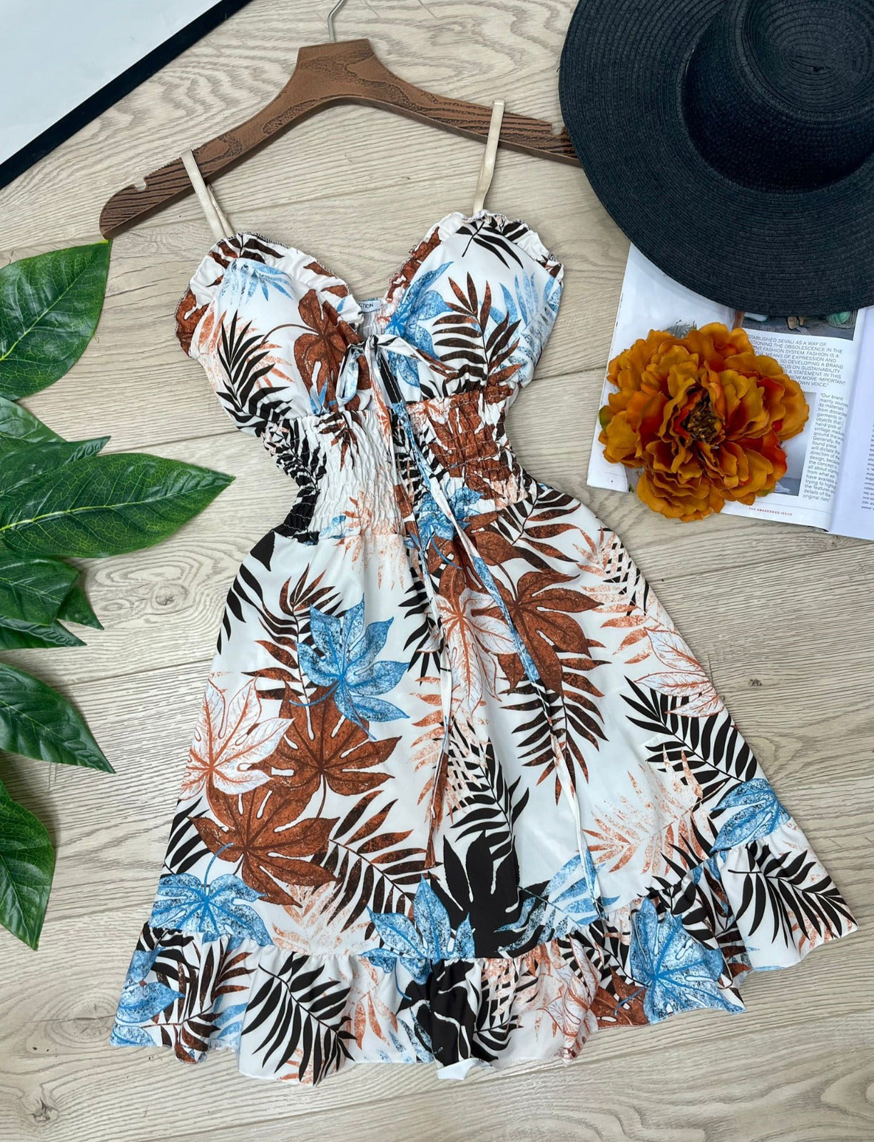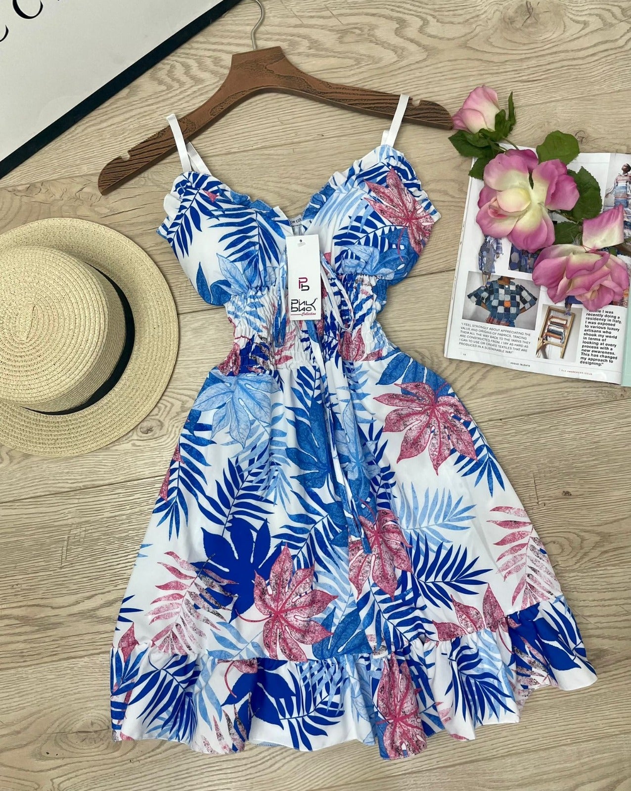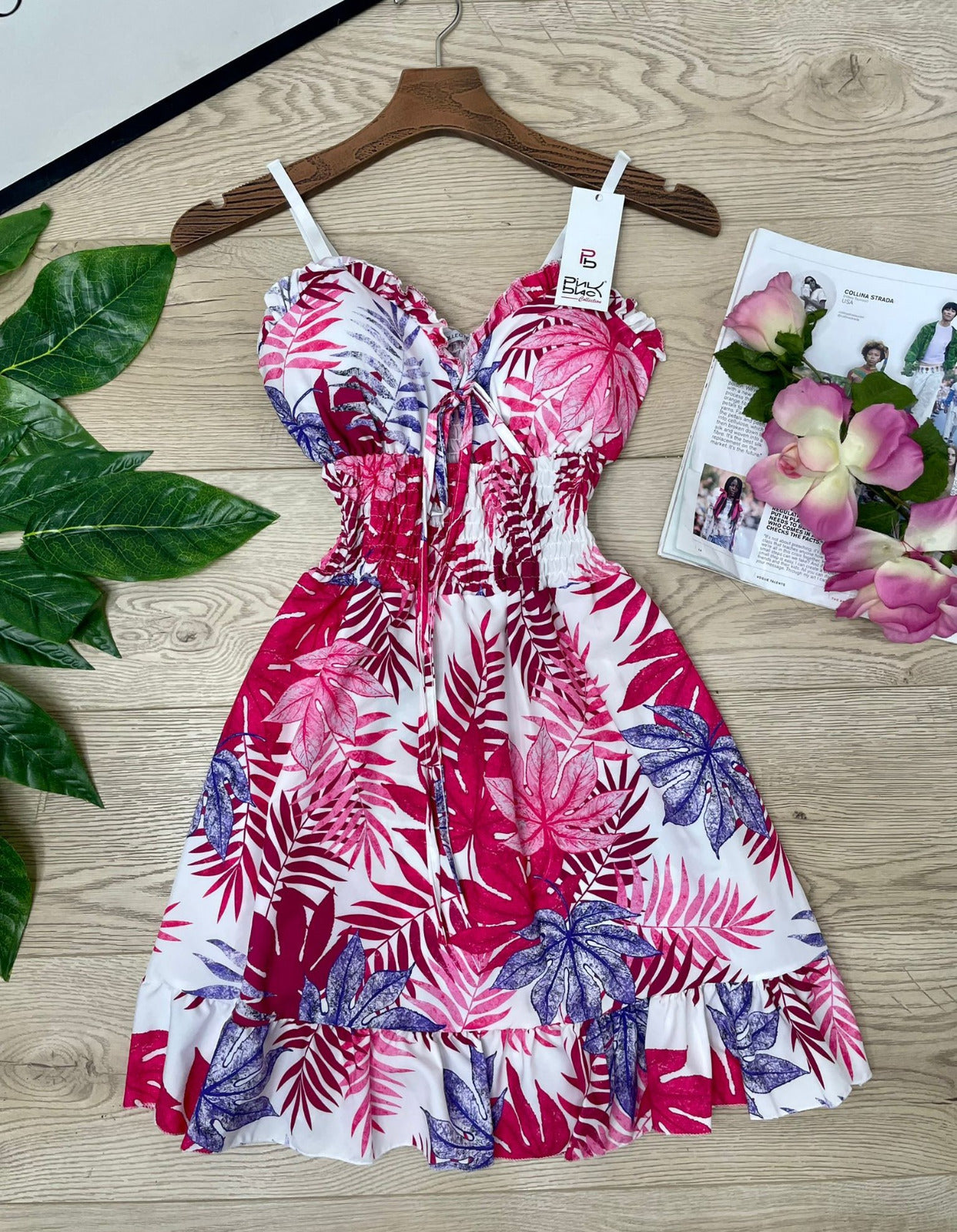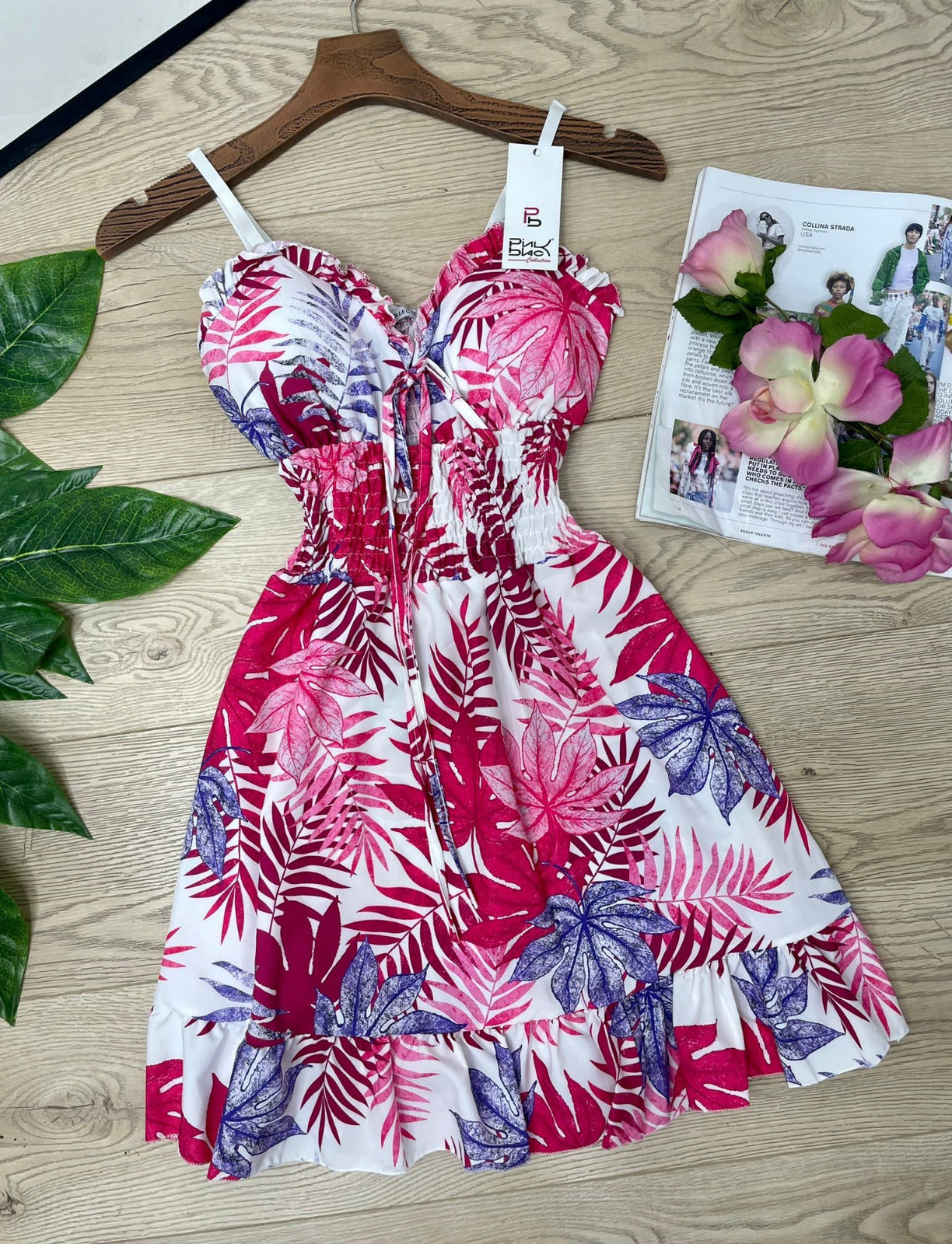 Abito in leggero tessuto strutturato con fantasia floreale, coppe preformate, spalline regolabili, fascia elastica in vita e volant. Fabbricato in Italia.