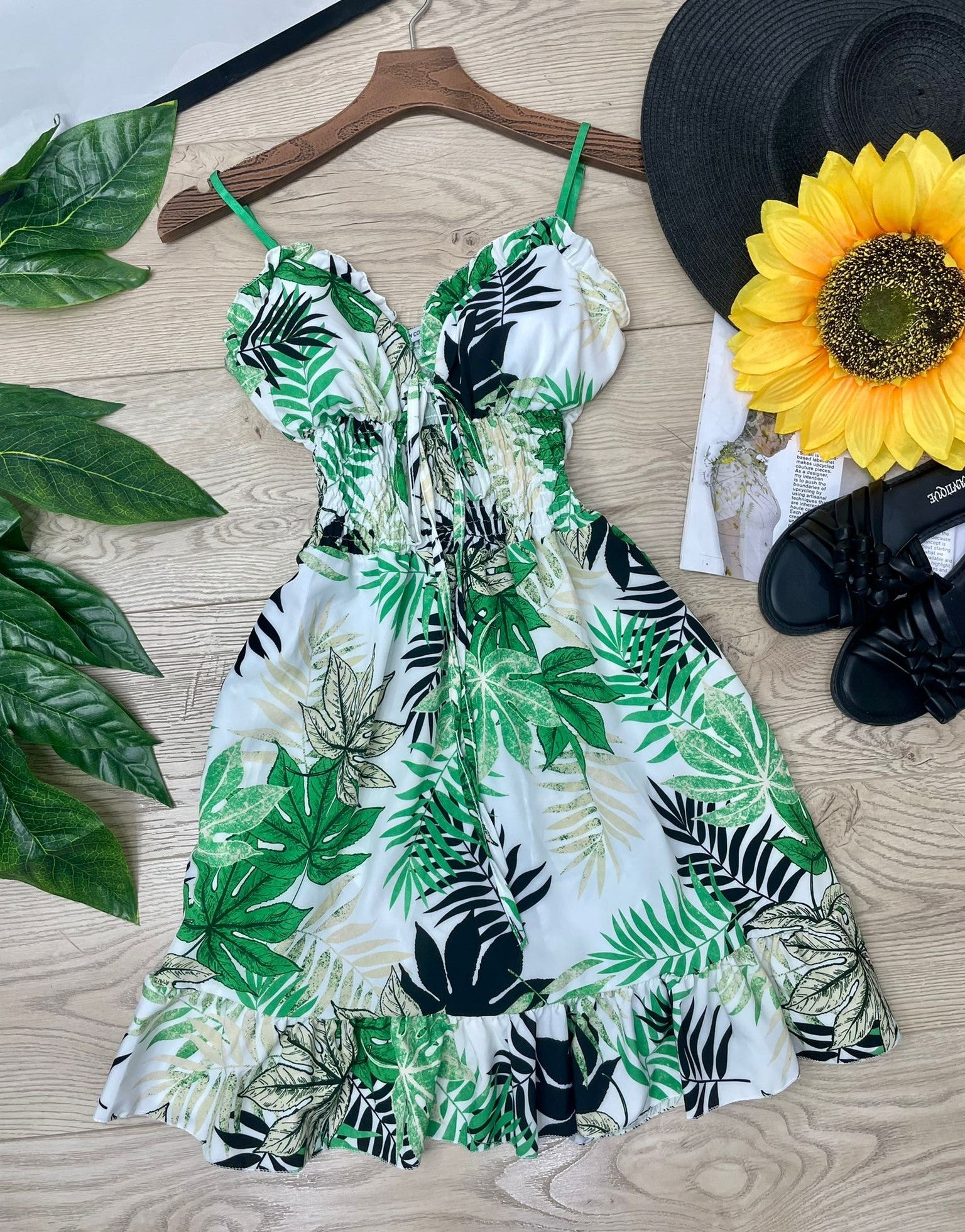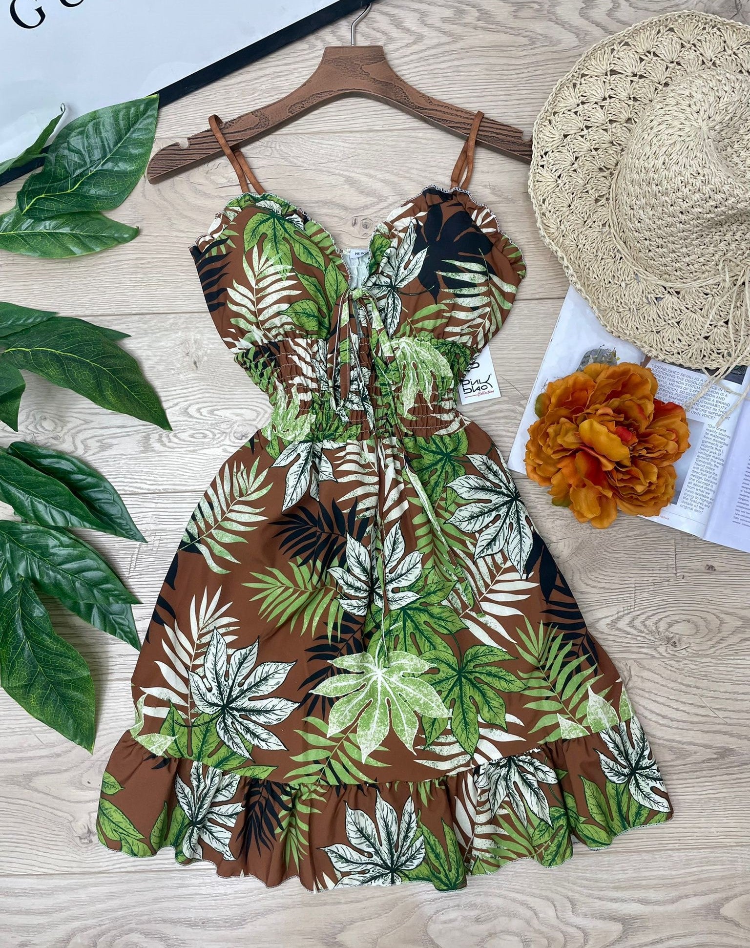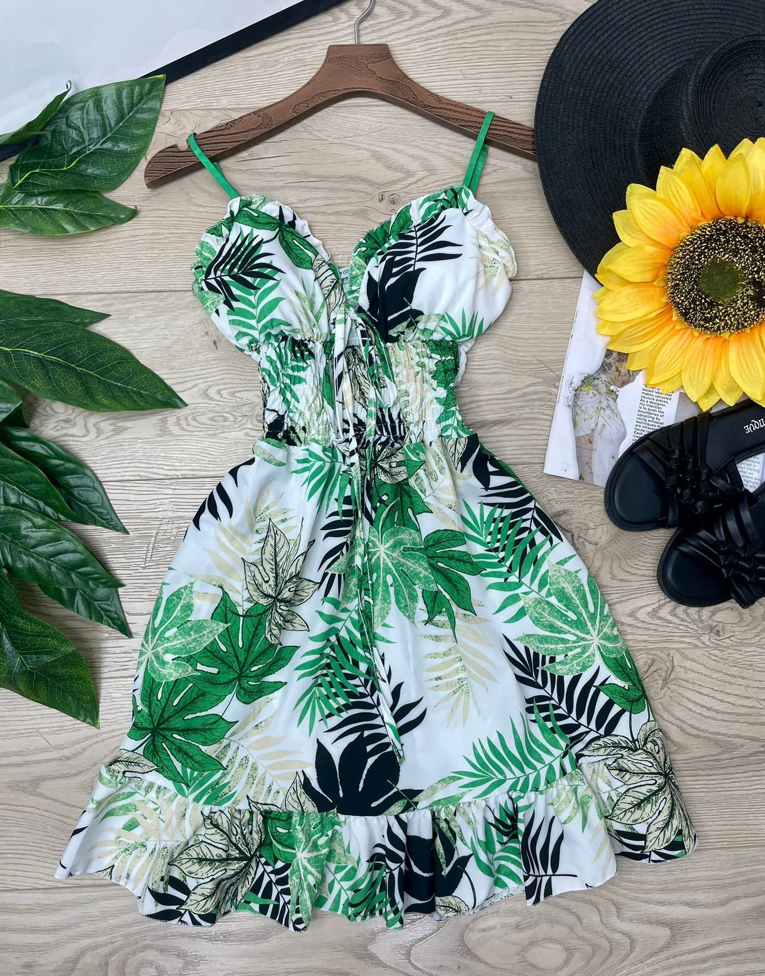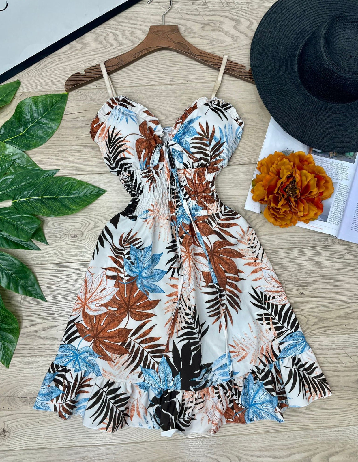 Abito in leggero tessuto strutturato con fantasia floreale, coppe preformate, spalline regolabili, fascia elastica in vita e volant. Fabbricato in Italia.