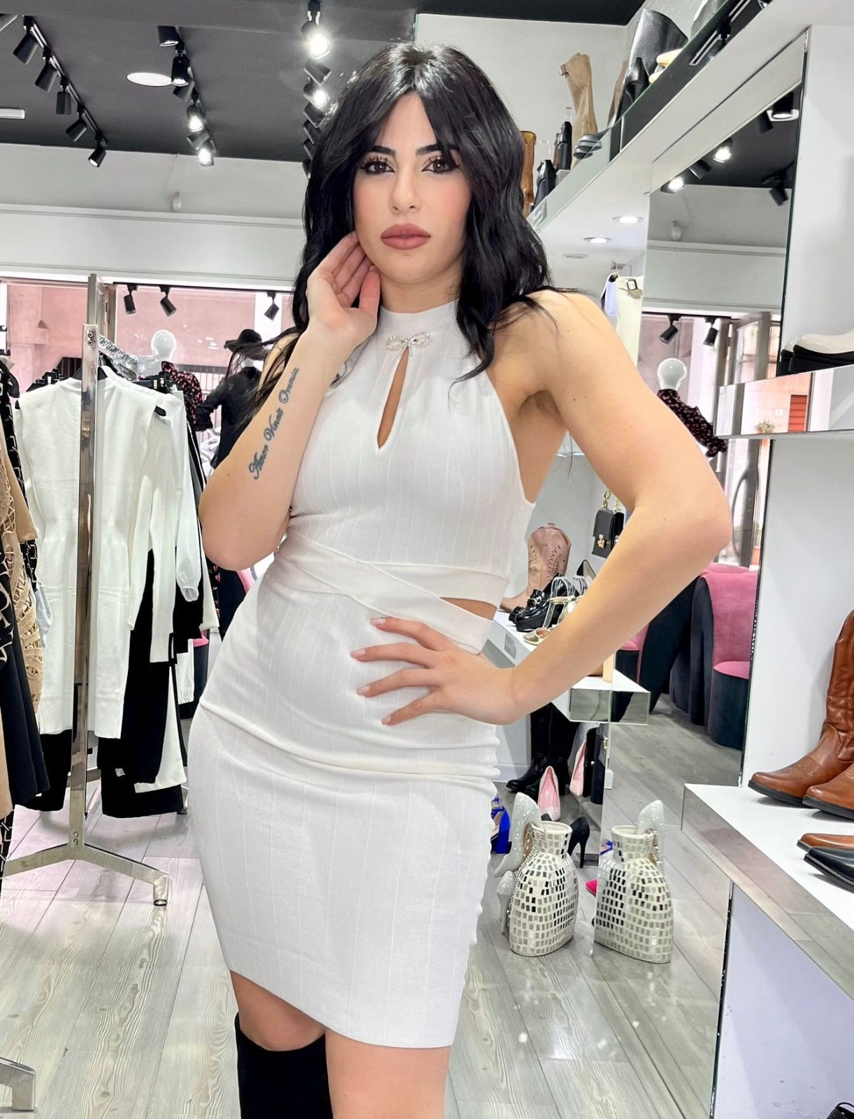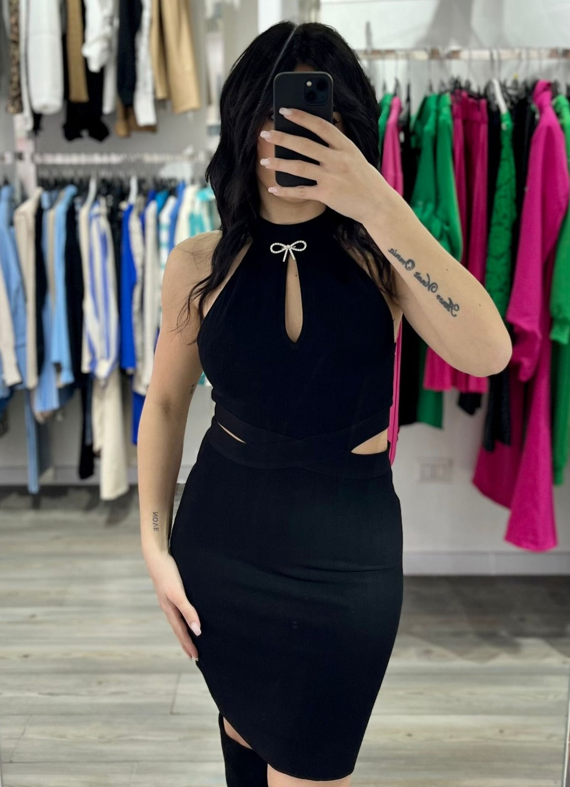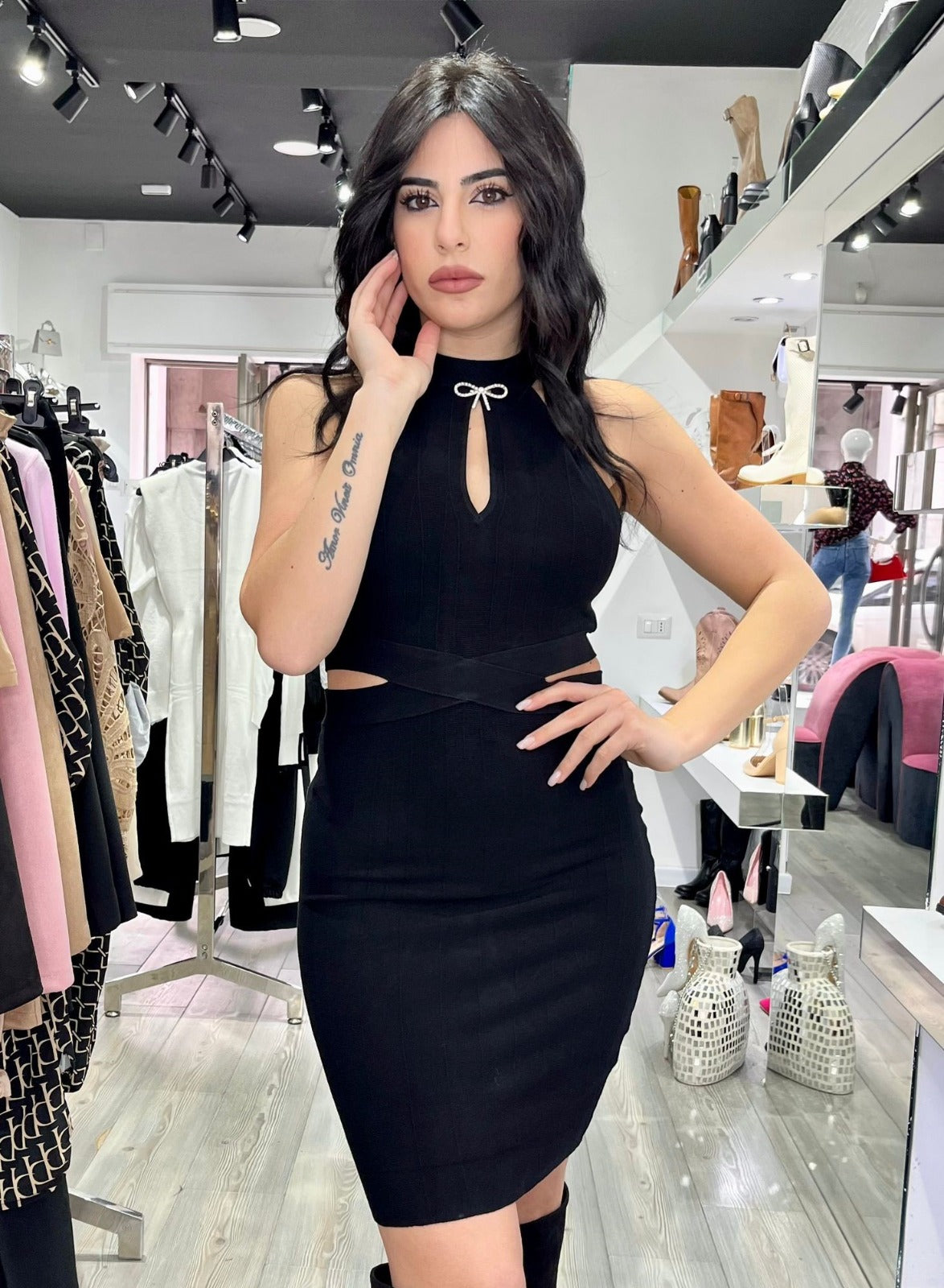 Abito in viscosa cut-out con apertura centrale, spilla con strass e chiusura con cerniera sul retro. Fabbricatoall'estero.