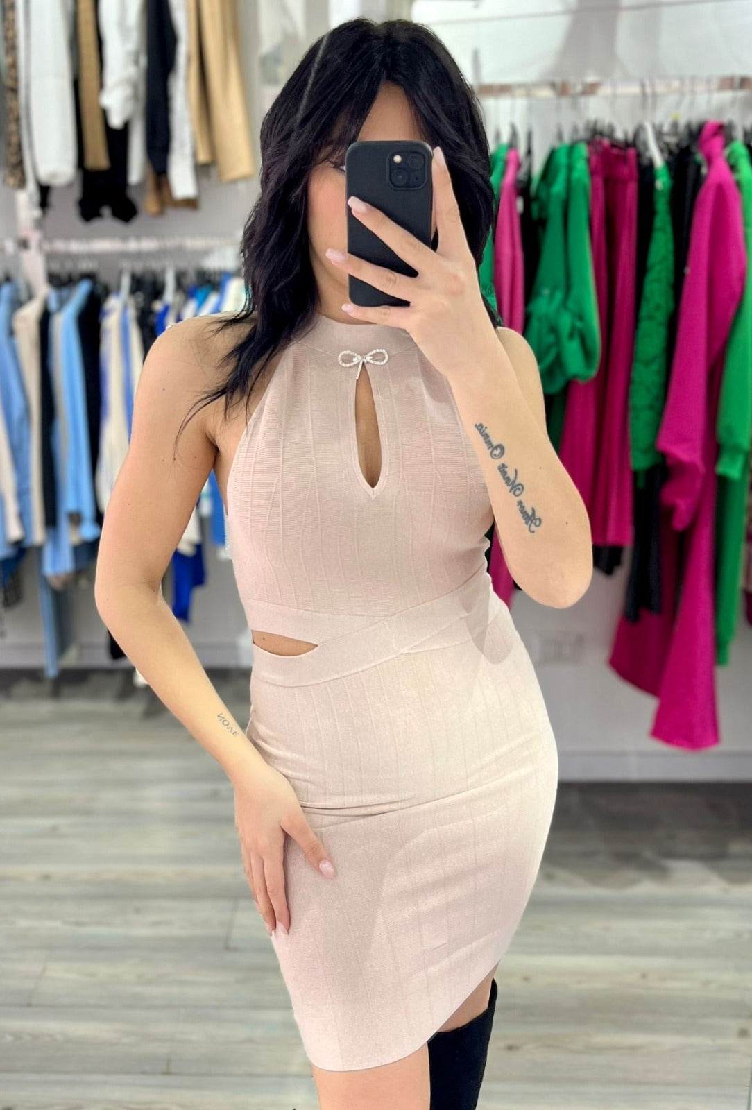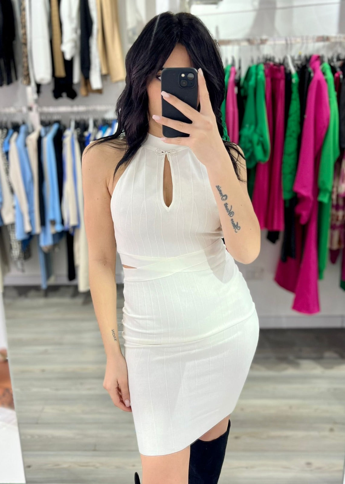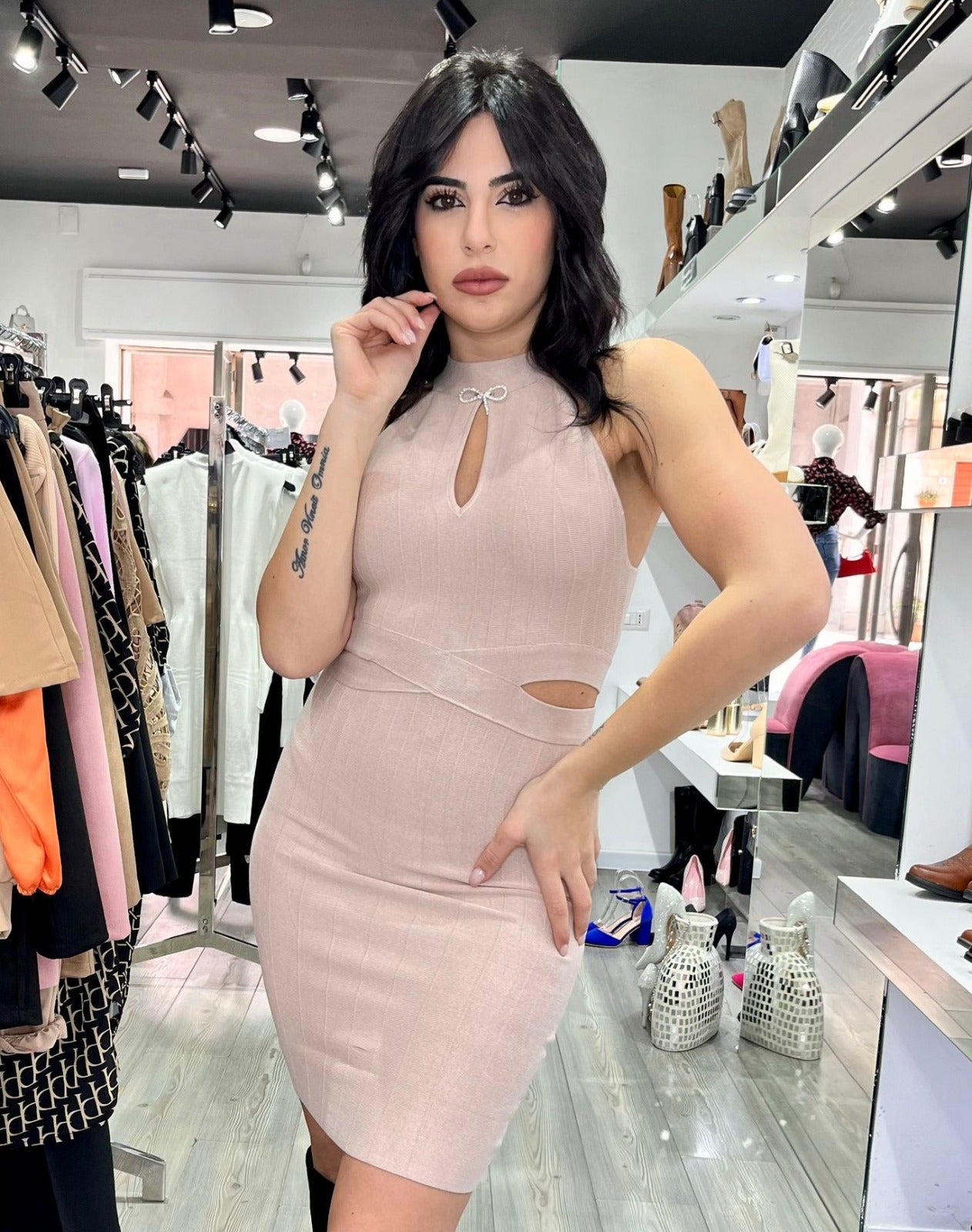 Abito in viscosa cut-out con apertura centrale, spilla con strass e chiusura con cerniera sul retro. Fabbricatoall'estero.