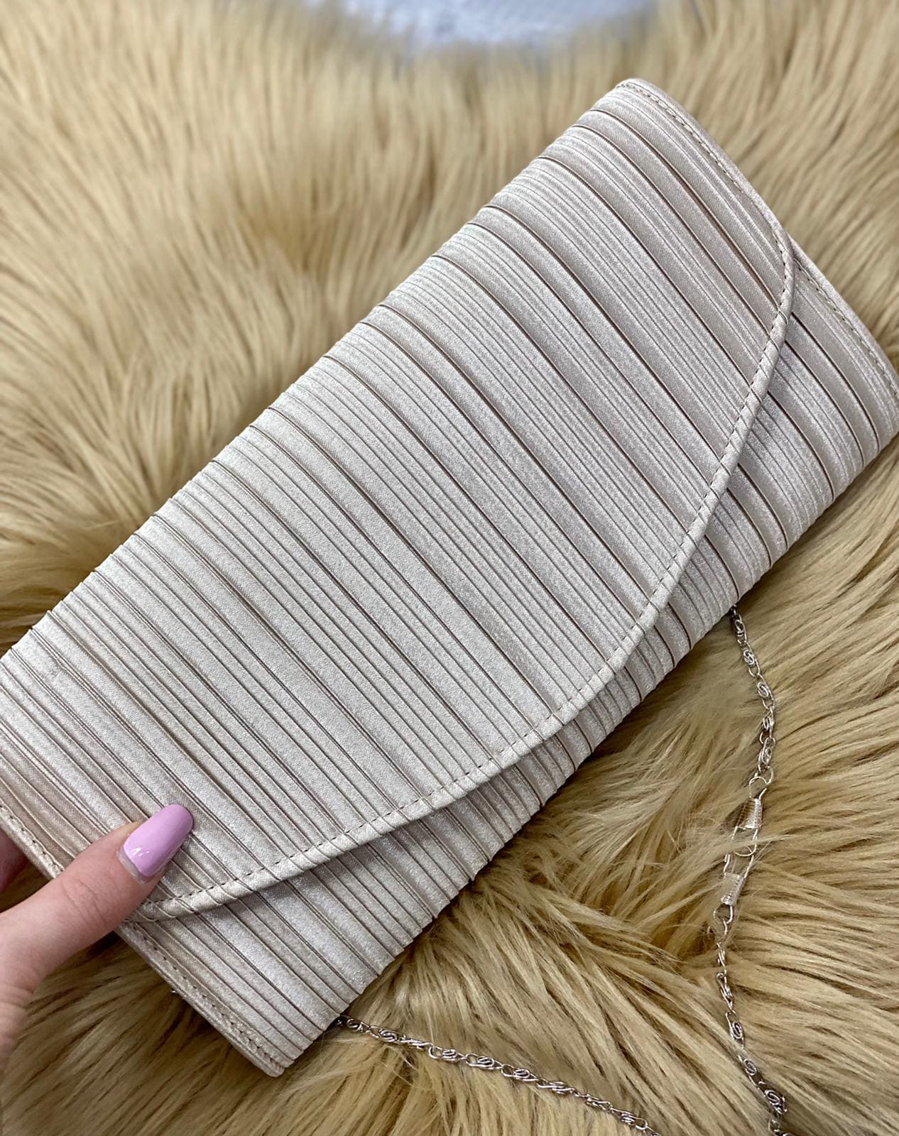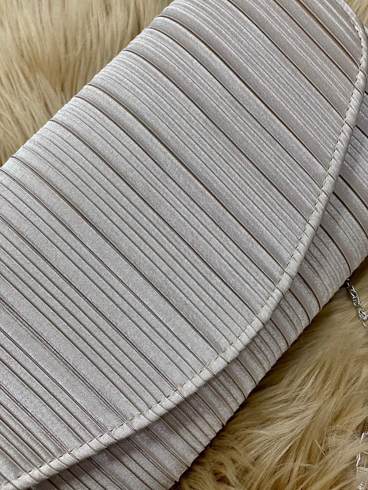 Pochette rettangolare in tessuto con tracolla in catena removibile.