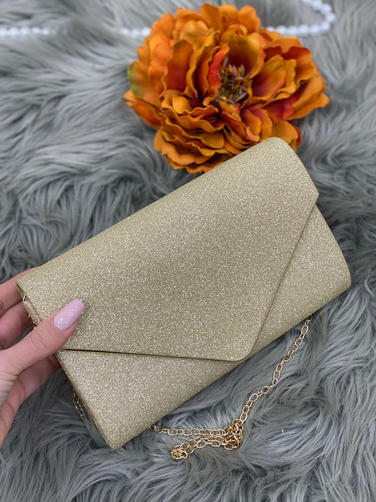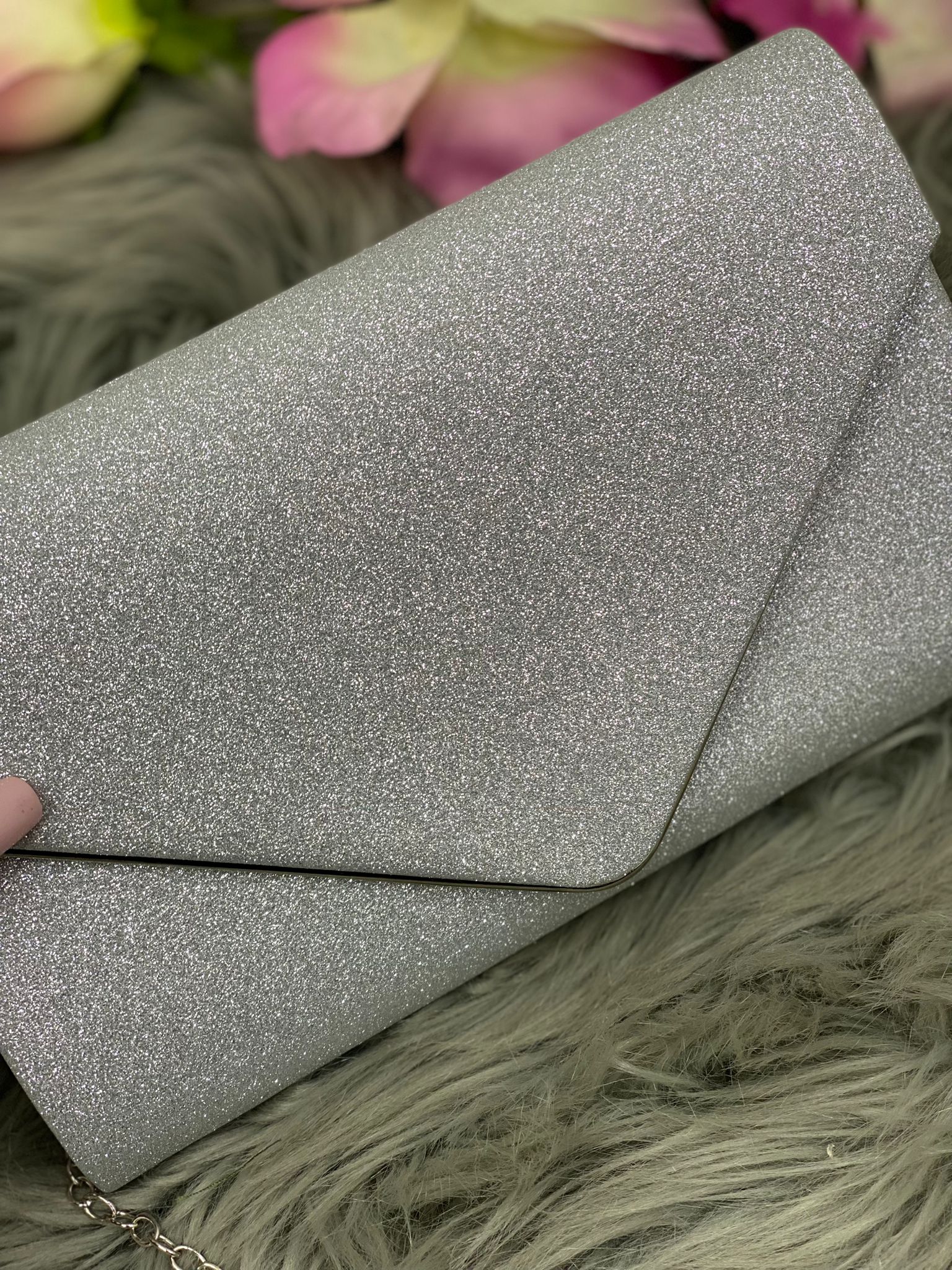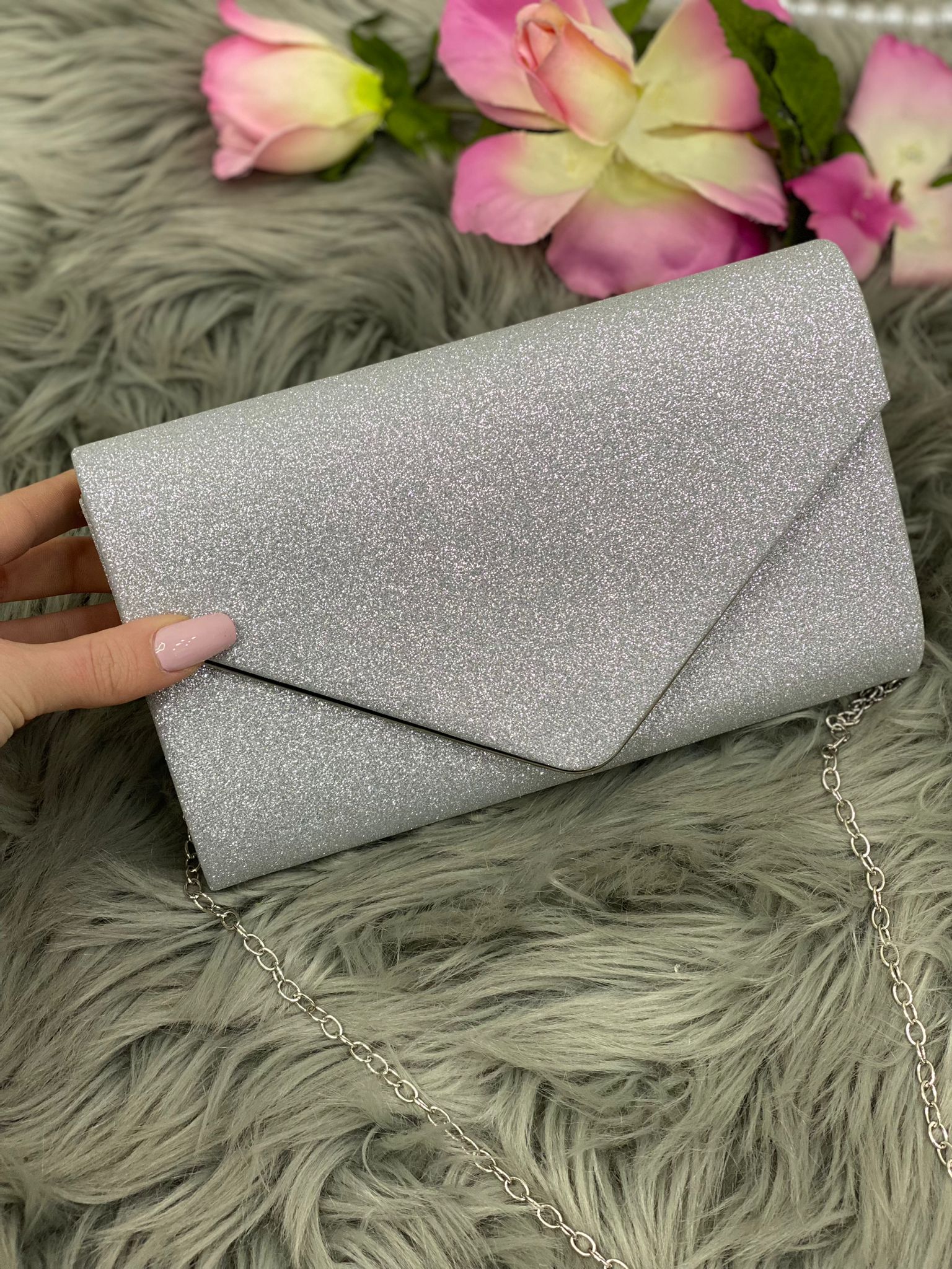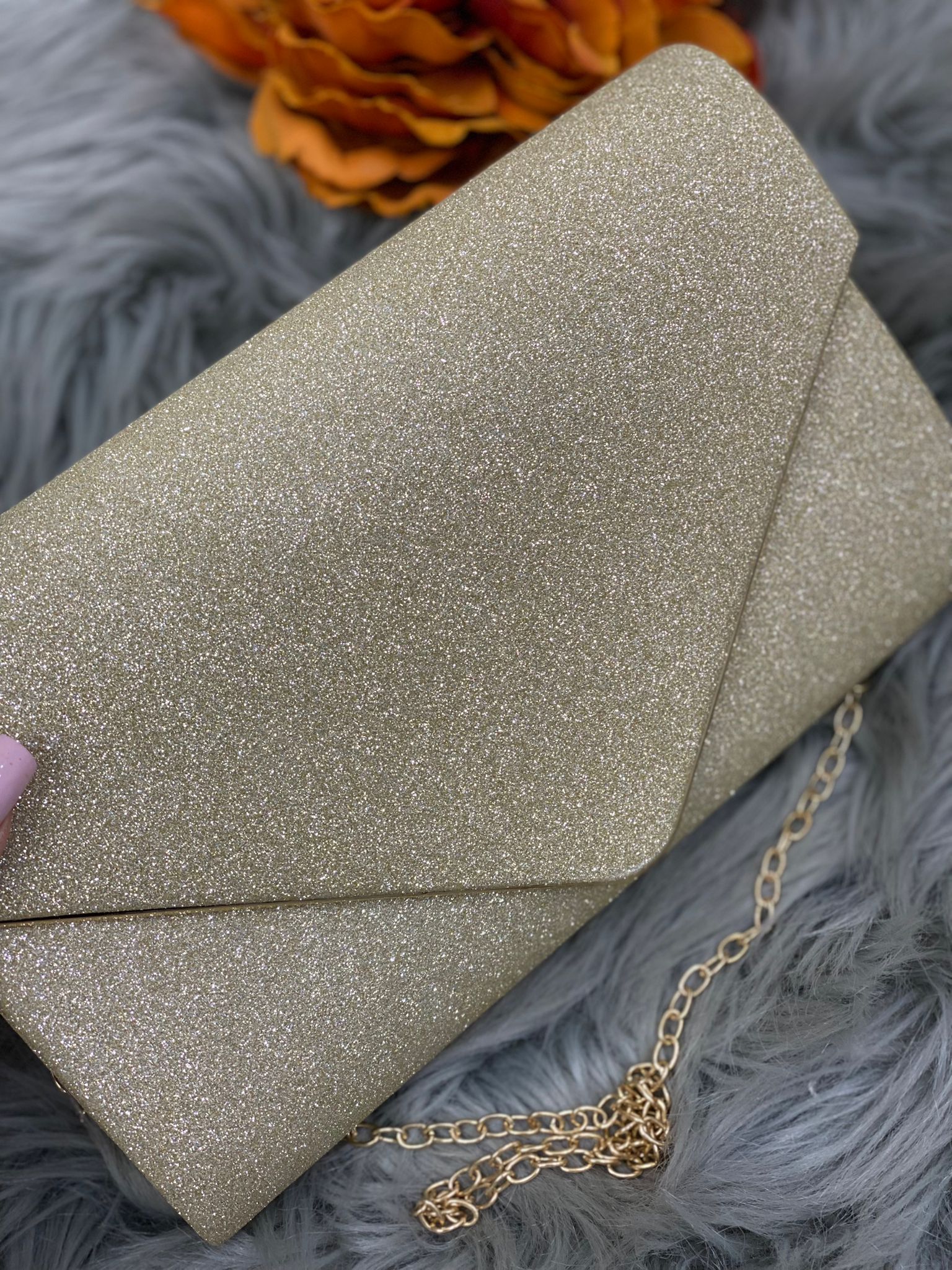 Pochette rettangolare glitterata, tracolla in catena removibile e chiusura magnetica.