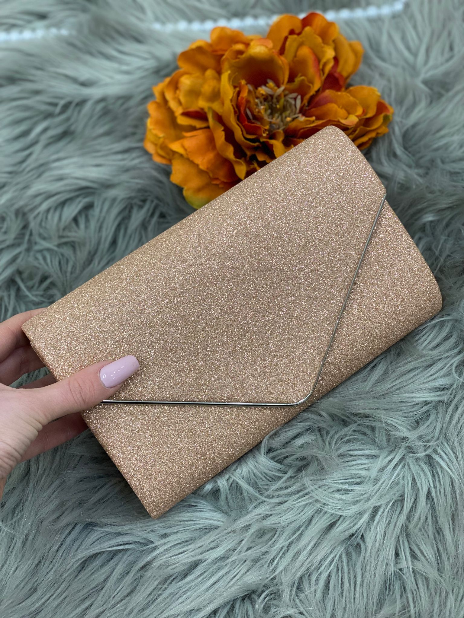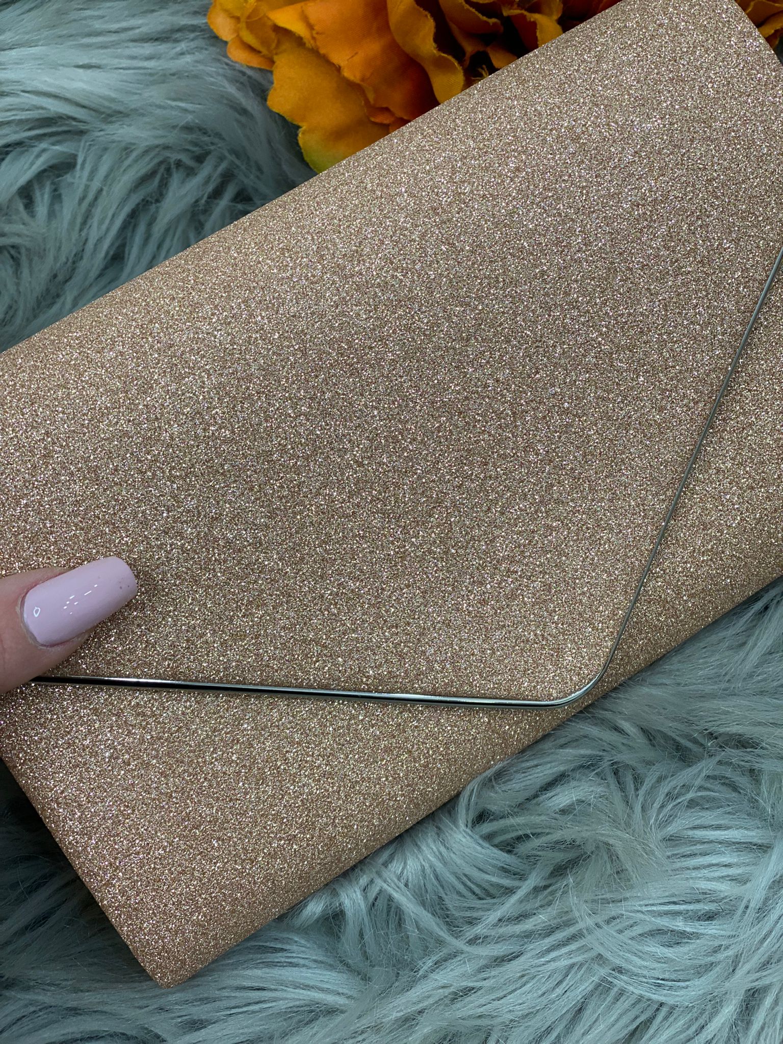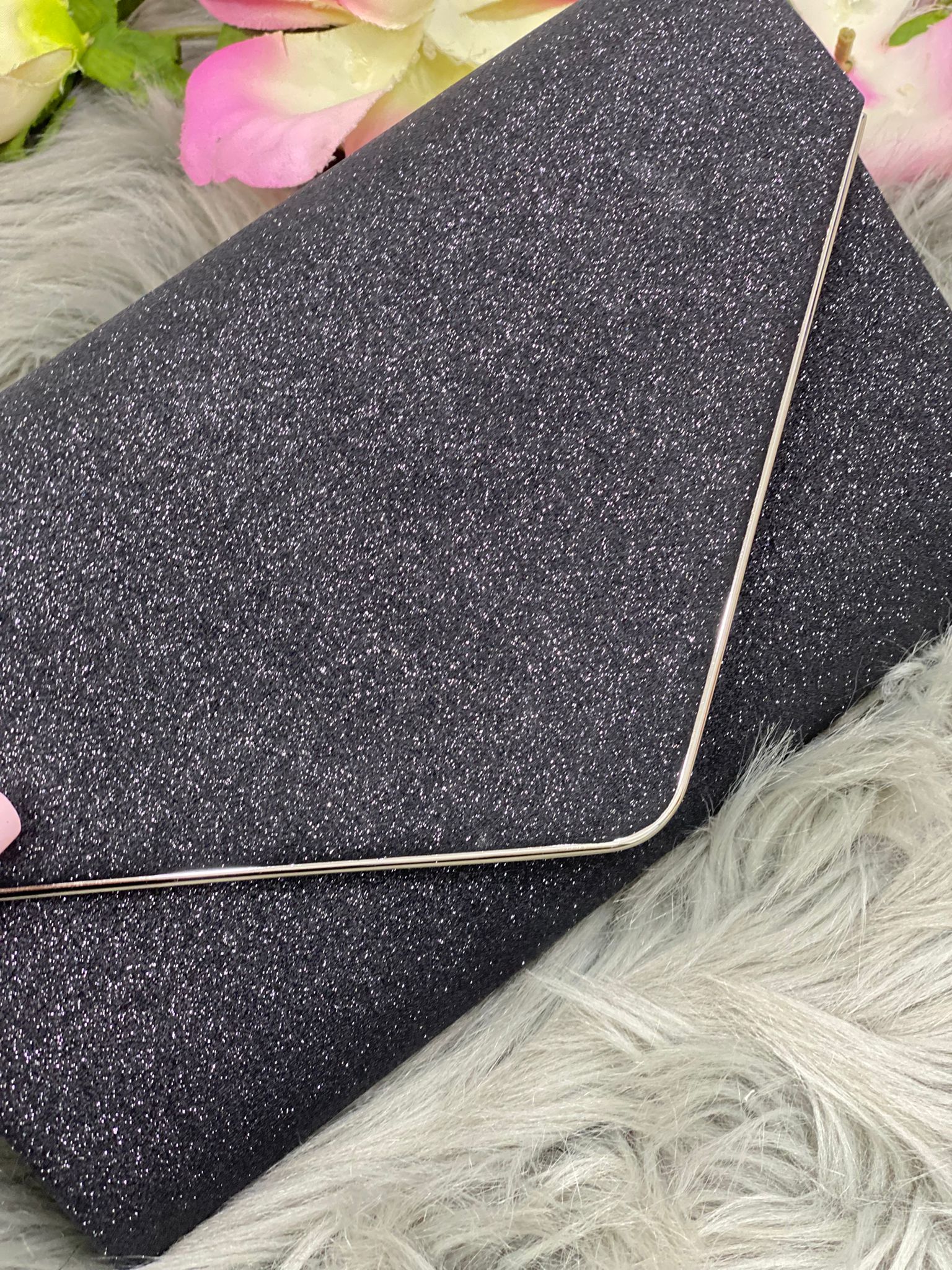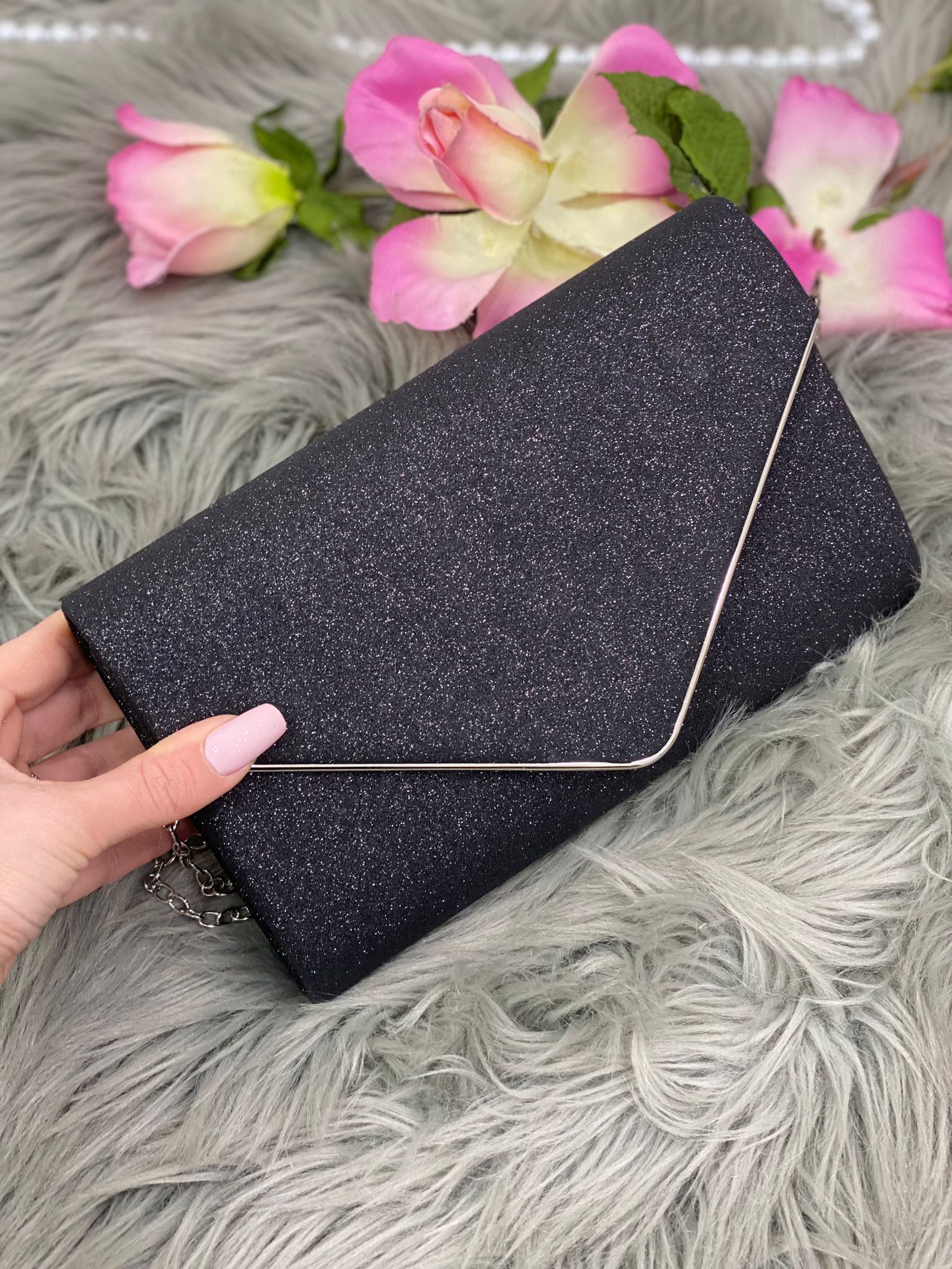 Pochette rettangolare glitterata, tracolla in catena removibile e chiusura magnetica.