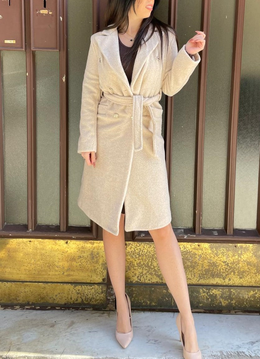 Cappotto in panno con chiusura a doppio petto , bottoni dorati e cintura in tessuto inclusa