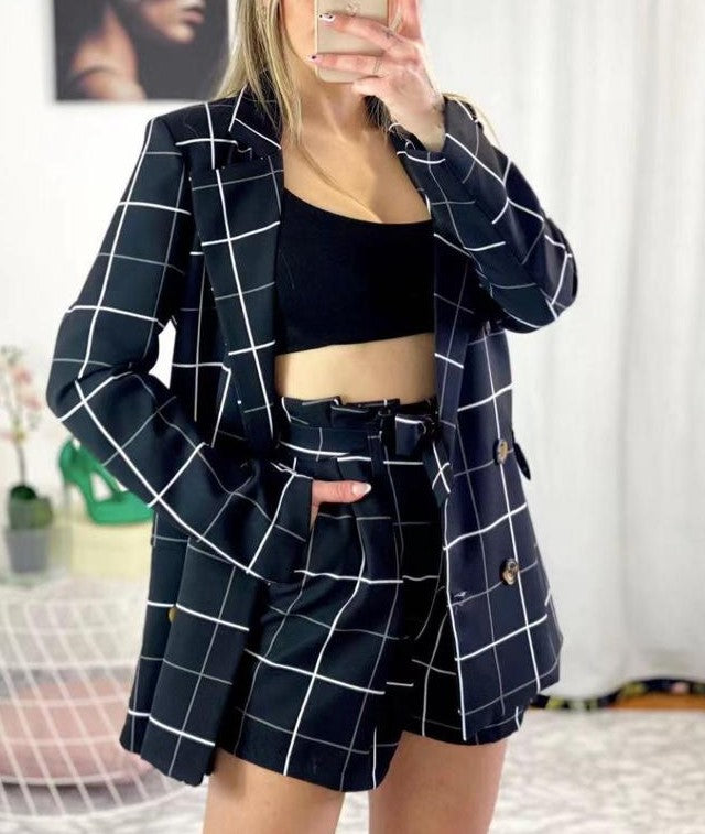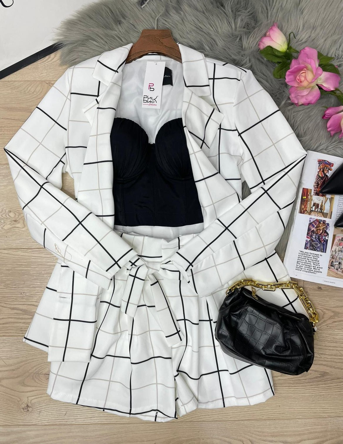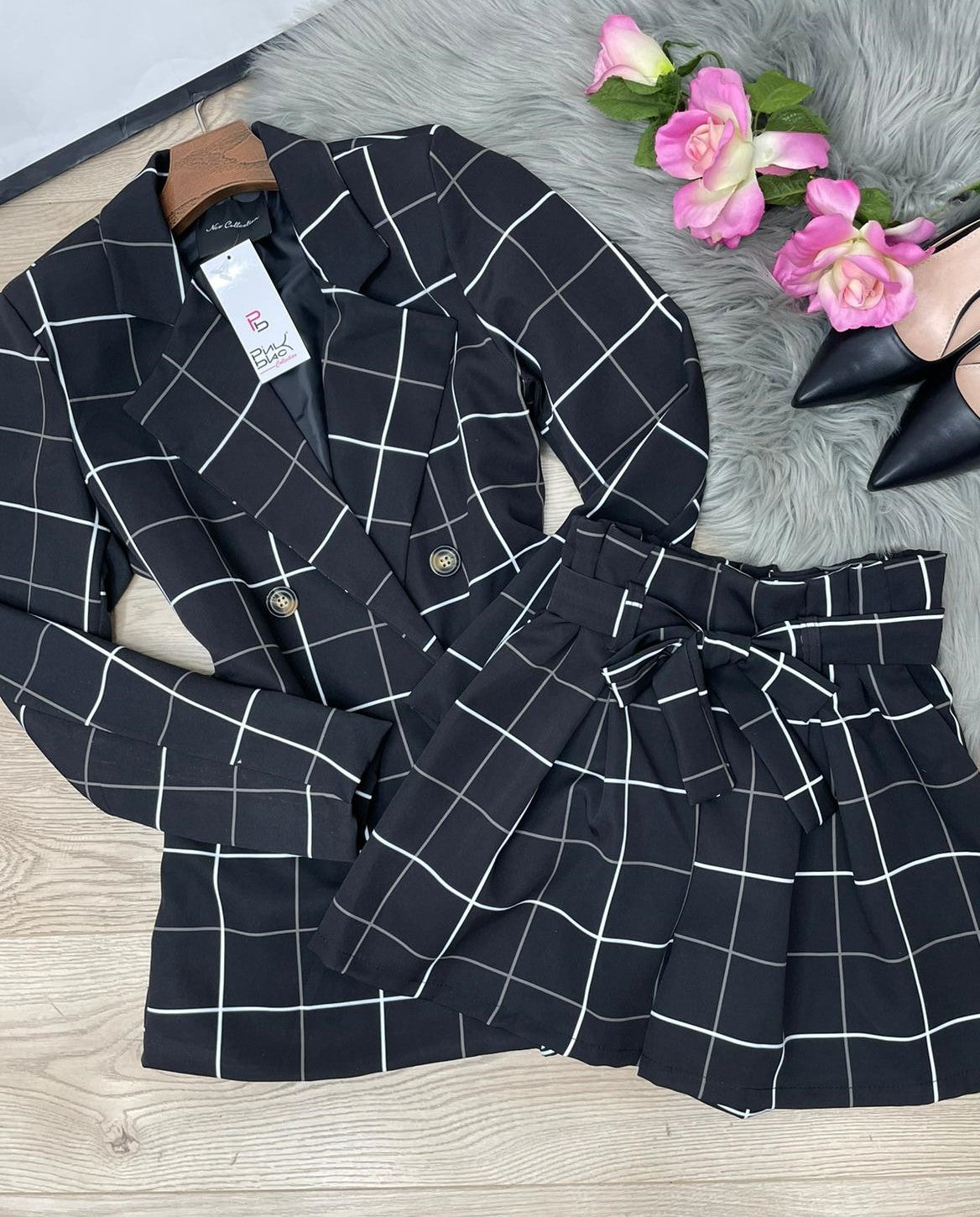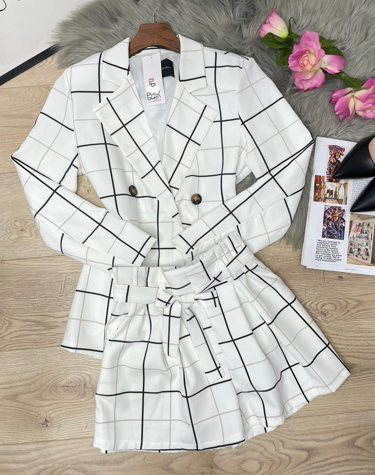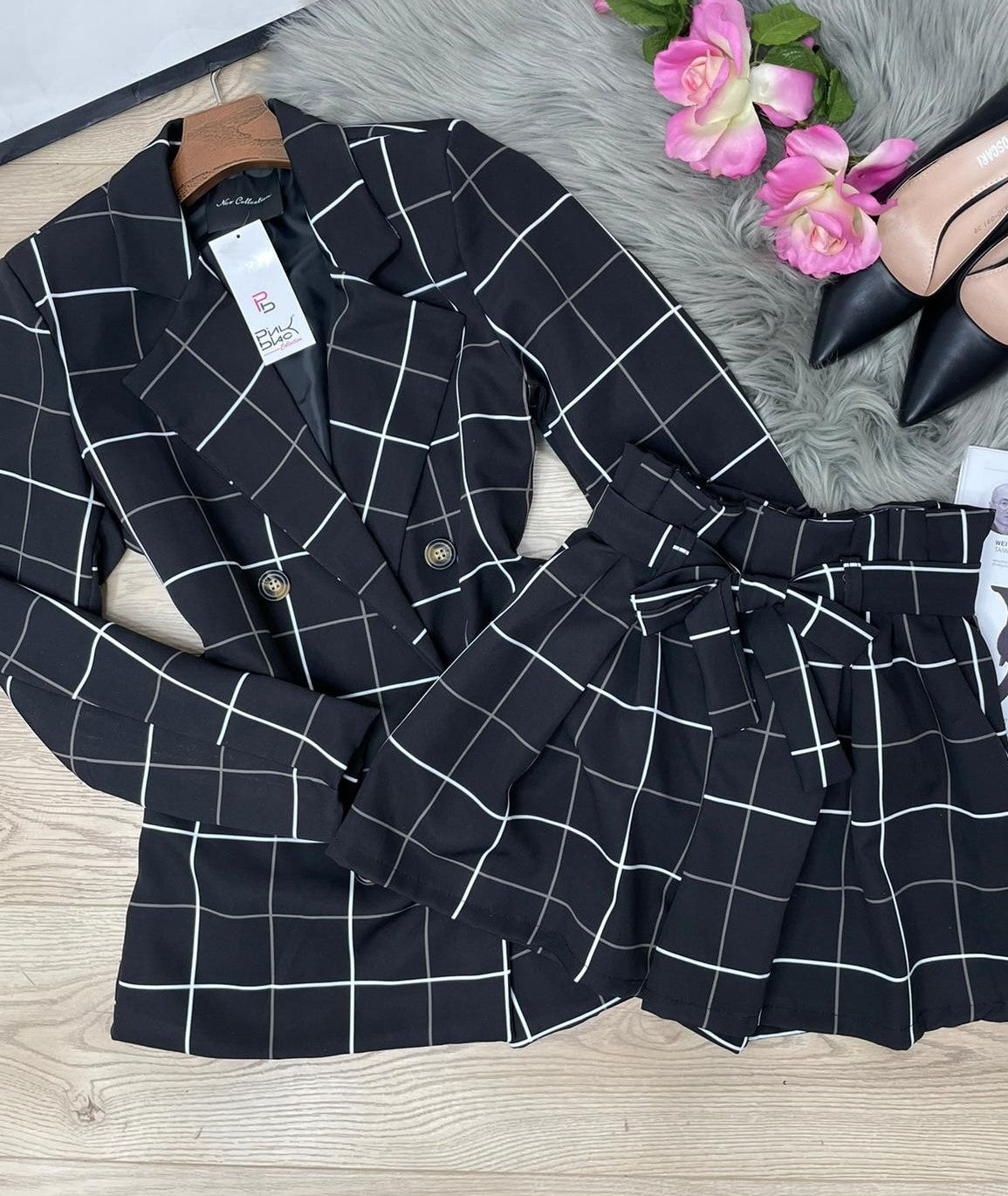 Completo in tessuto scuba crepe con design a quadri. Giacca con spalline interne imbottite e pantalone con elastico in vita e tasche laterali. Fabbricato in Italia.
