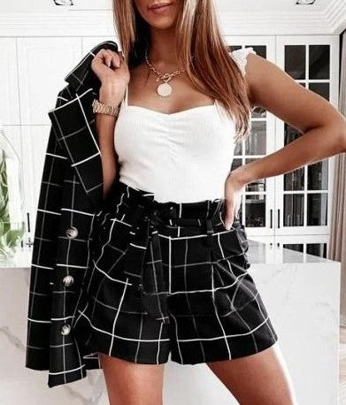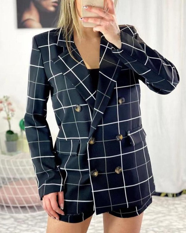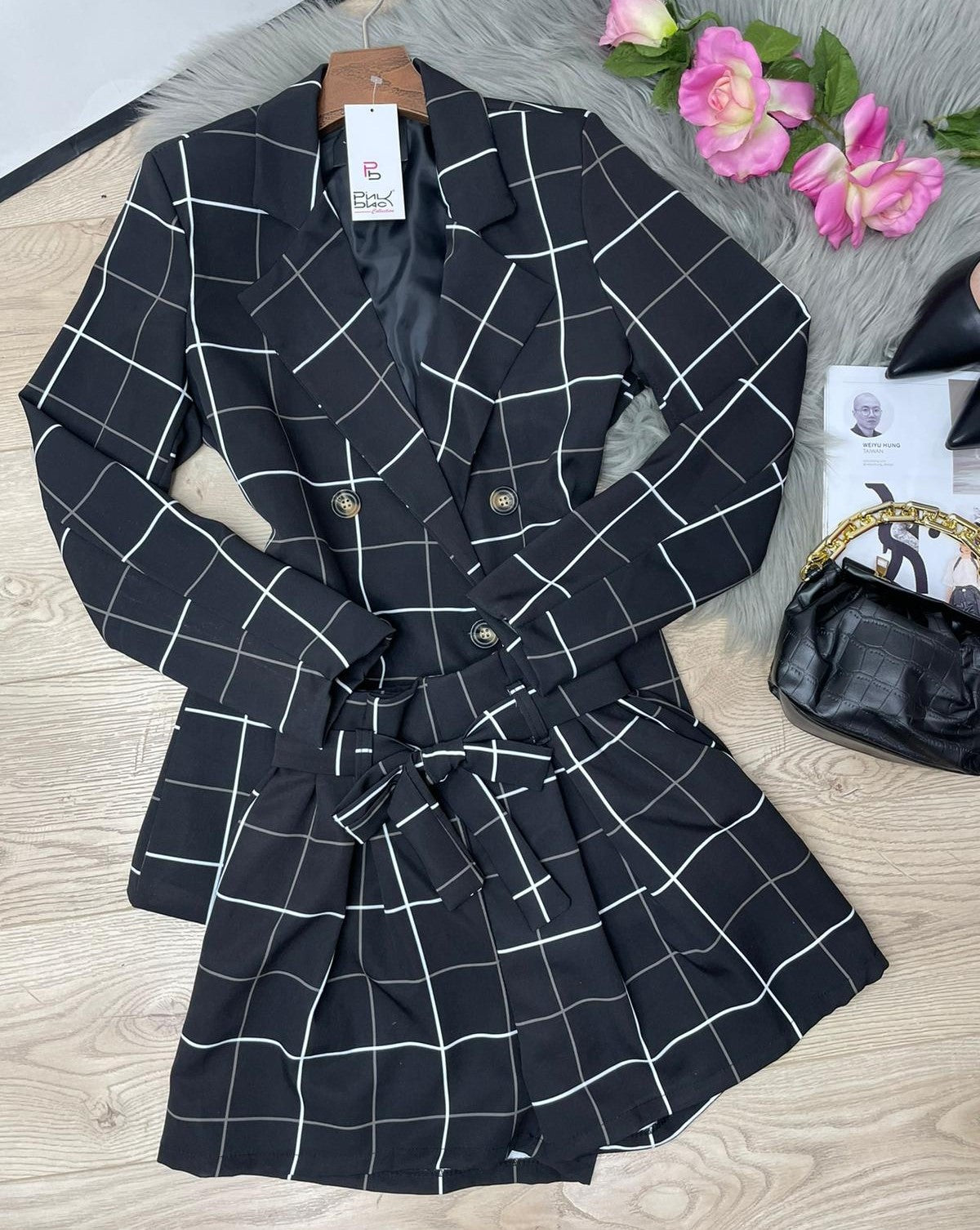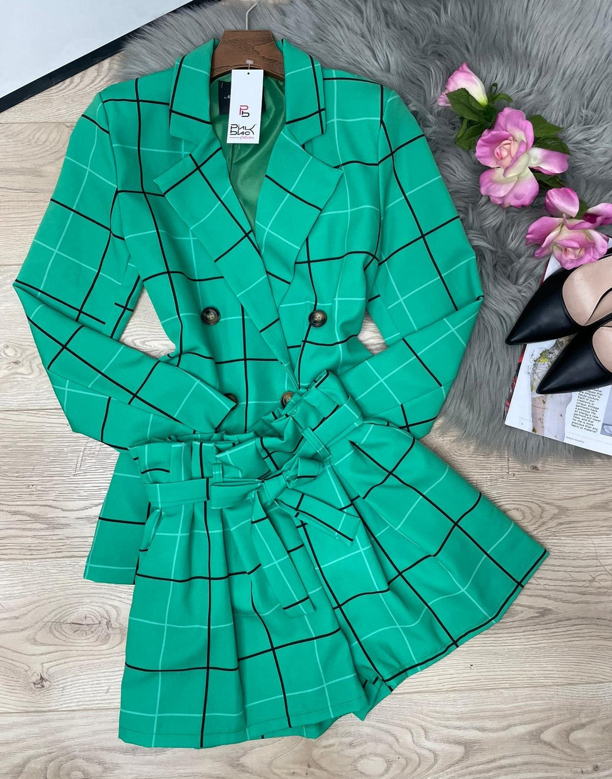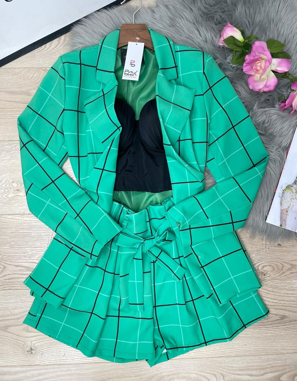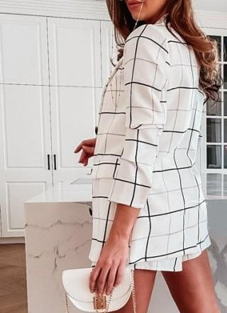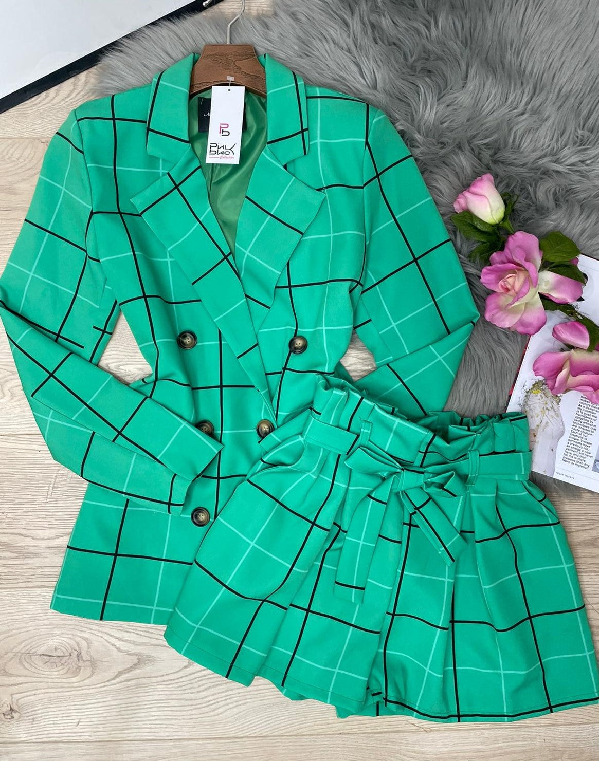 Completo in tessuto scuba crepe con design a quadri. Giacca con spalline interne imbottite e pantalone con elastico in vita e tasche laterali. Fabbricato in Italia.