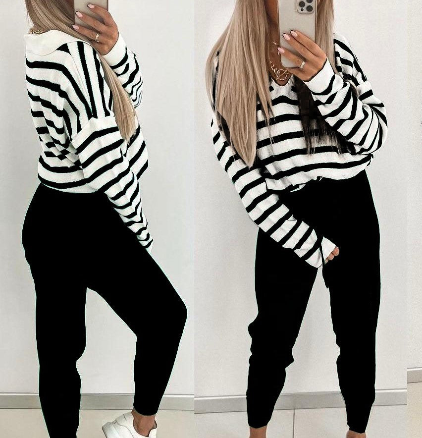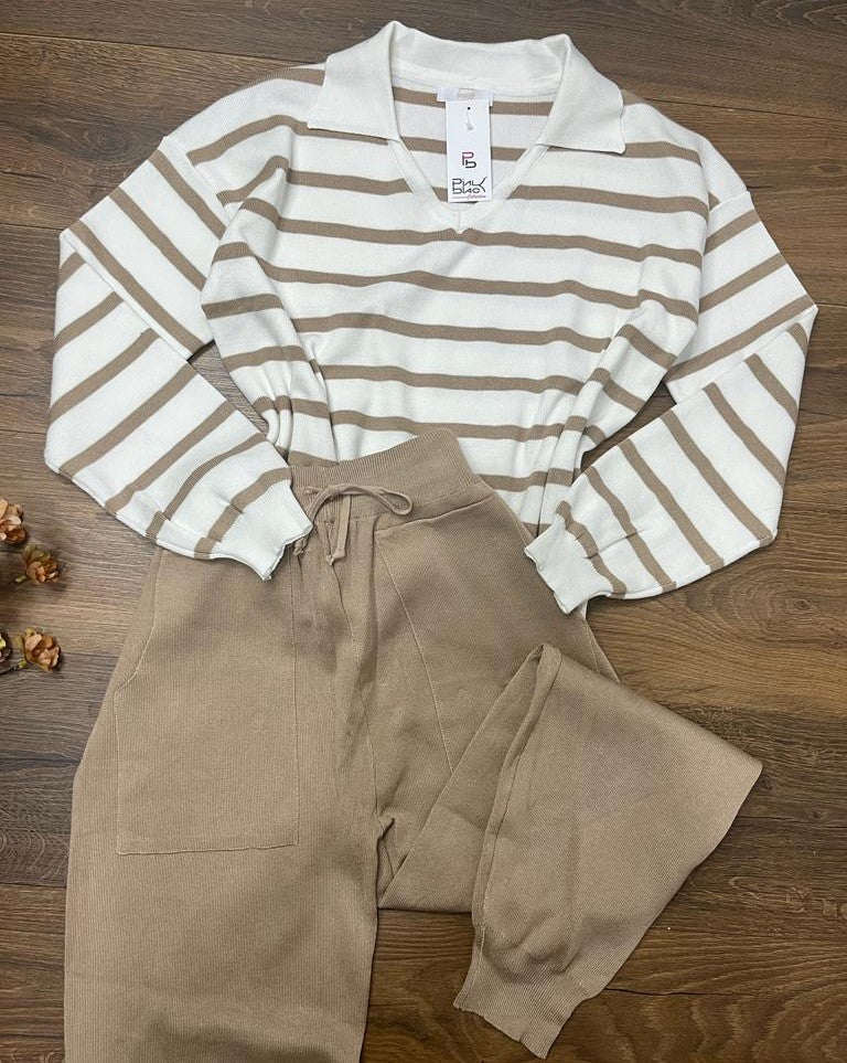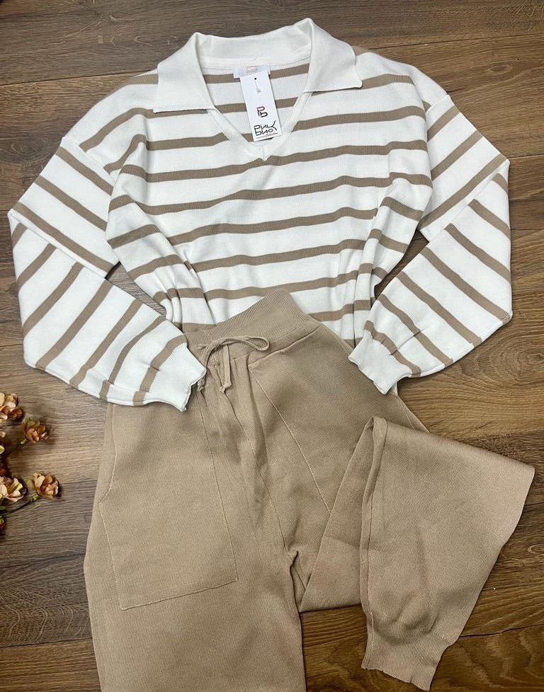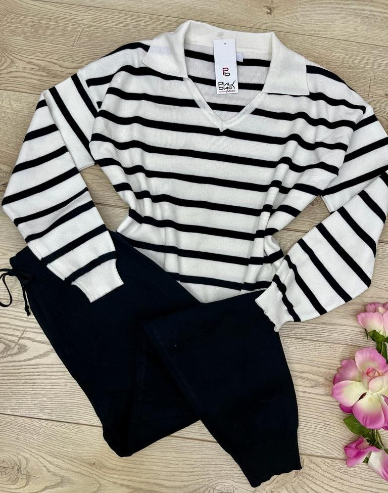 Completo in viscosa con design a righe, colletto nella maglia e pantalone con fascia elastica in vita. Fabbricato in Italia.