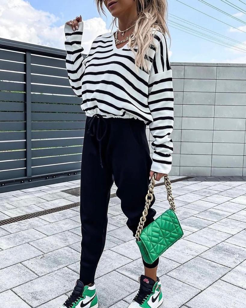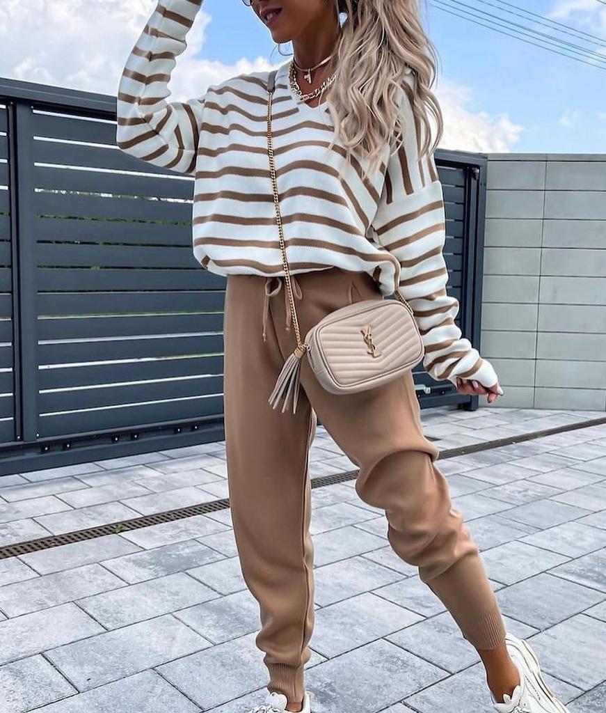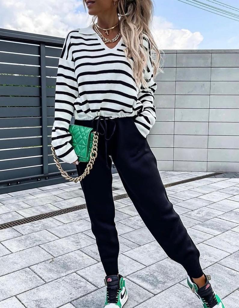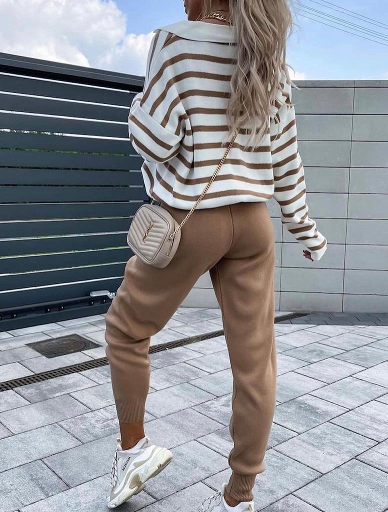 Completo in viscosa con design a righe, colletto nella maglia e pantalone con fascia elastica in vita. Fabbricato in Italia.