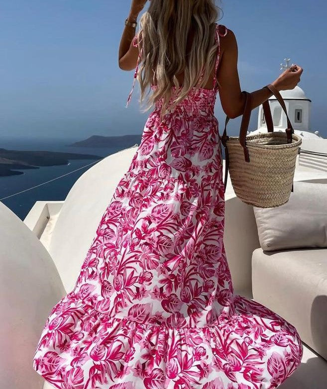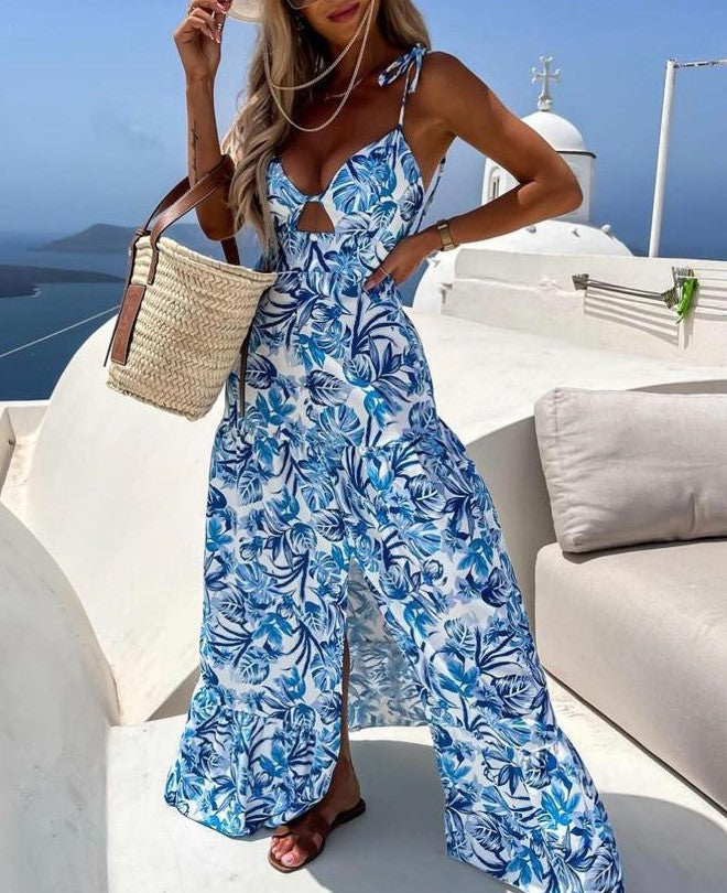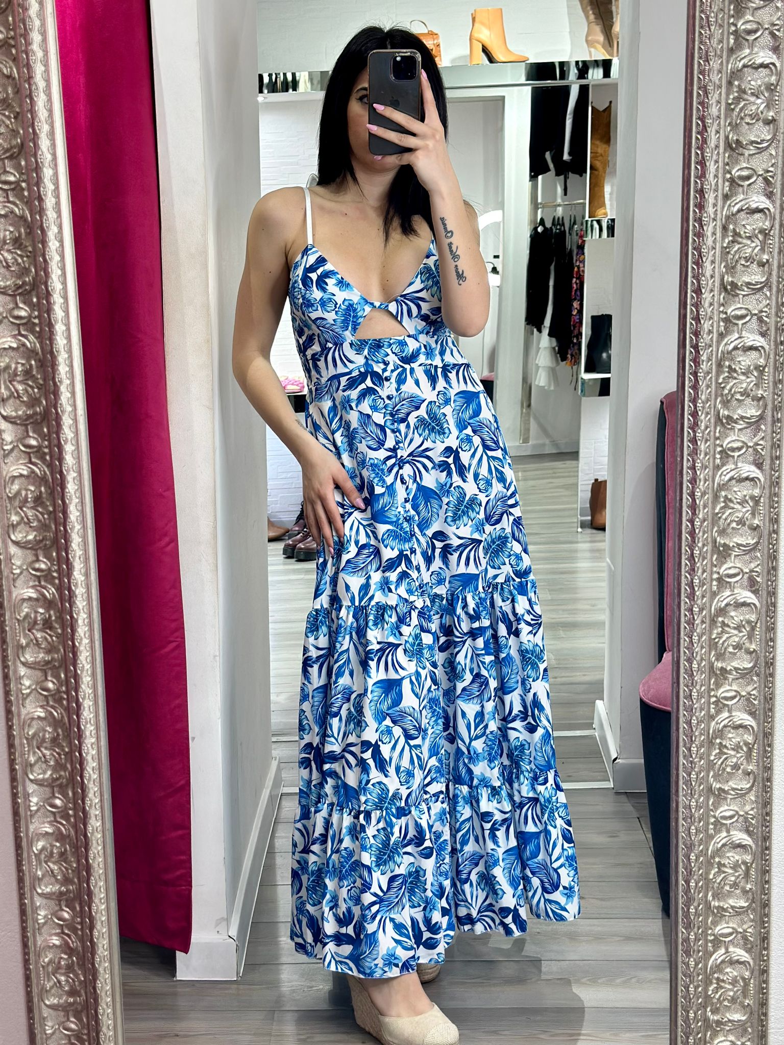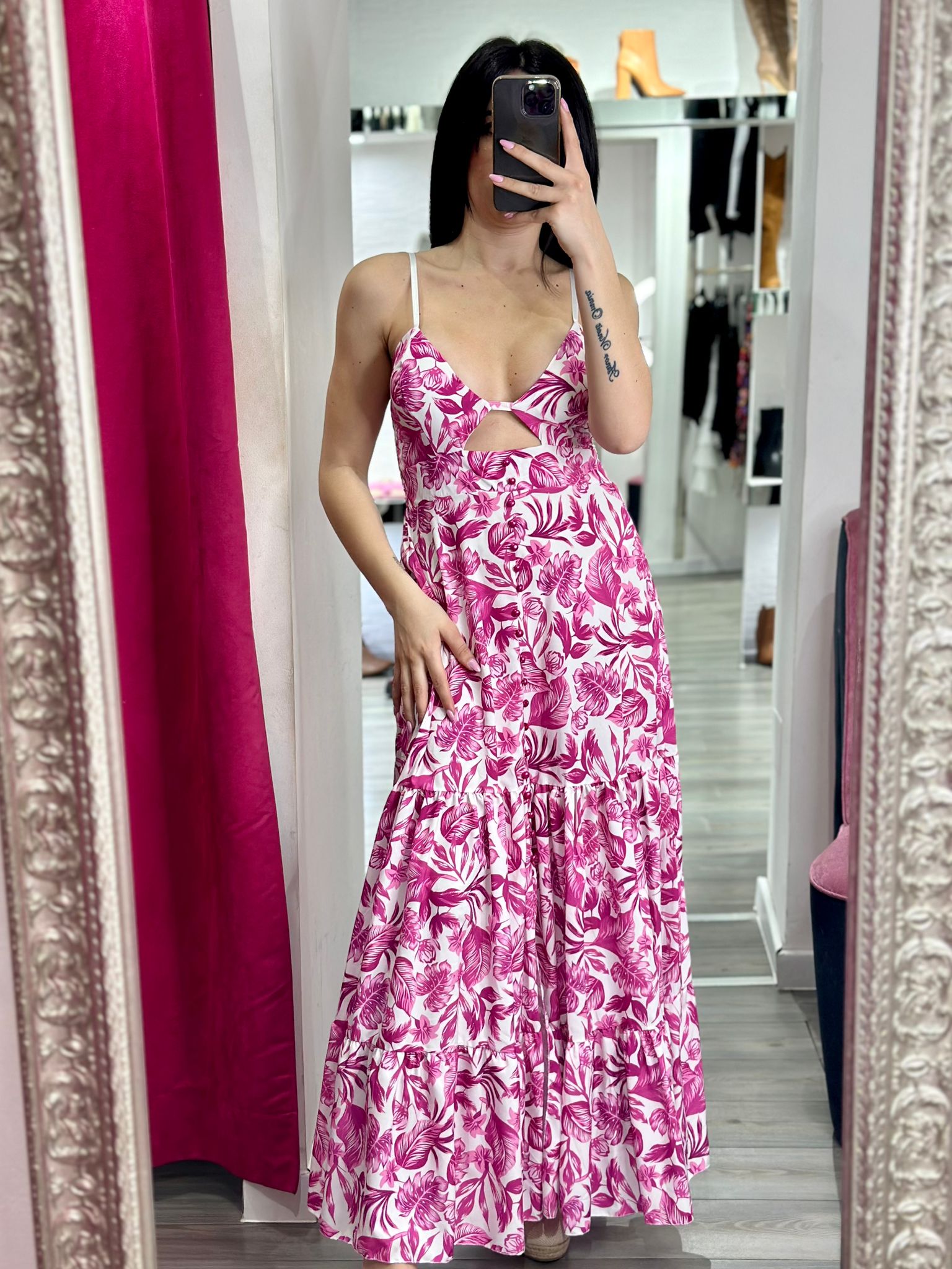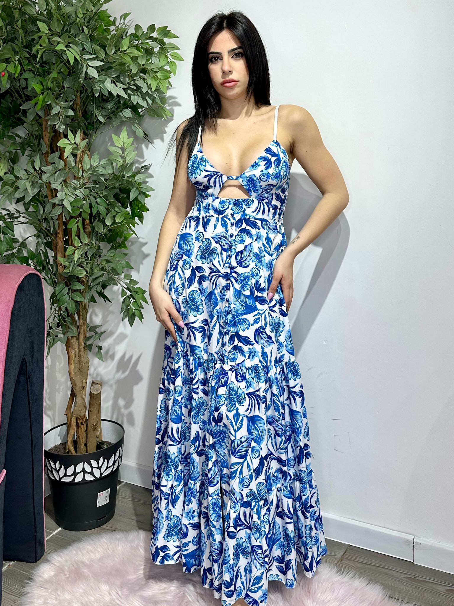 Abito lungo in leggero tessuto strutturato con fantasia floreale, coppe preformate, spalline con allacciatura, fascia elastica sul retro, bottoni e spacco. Fabbricato in Italia.