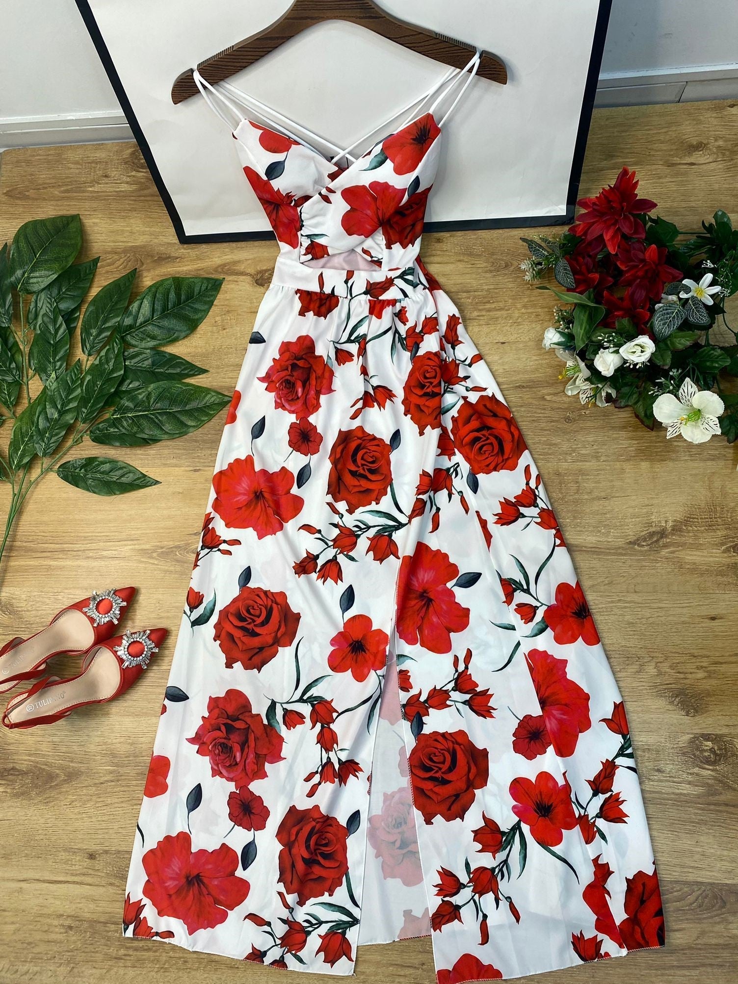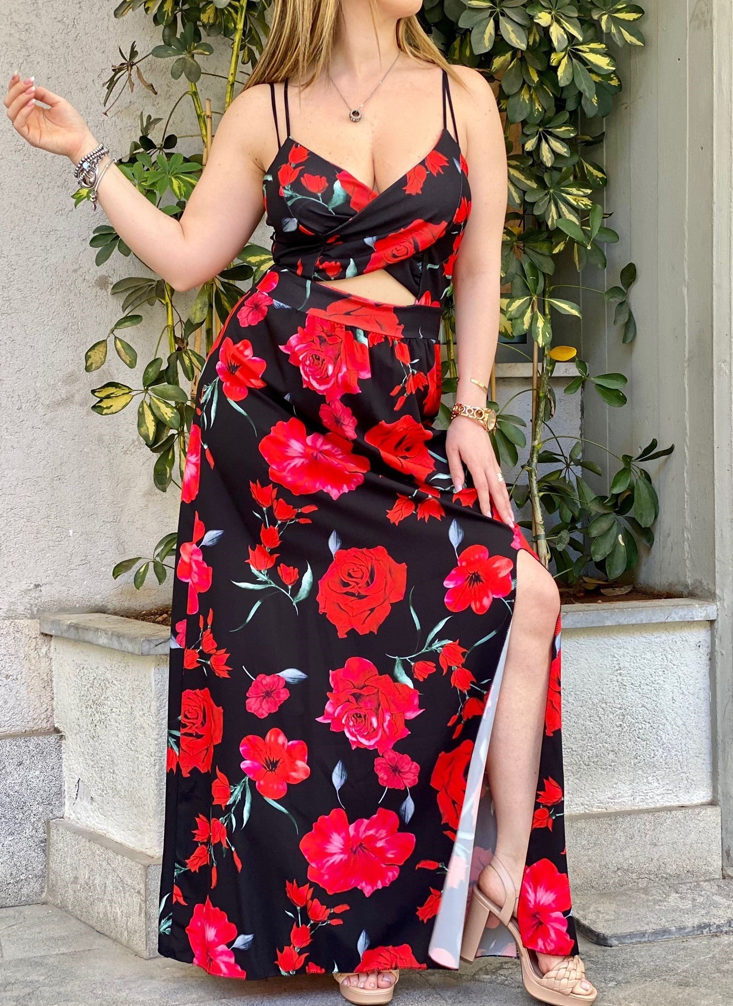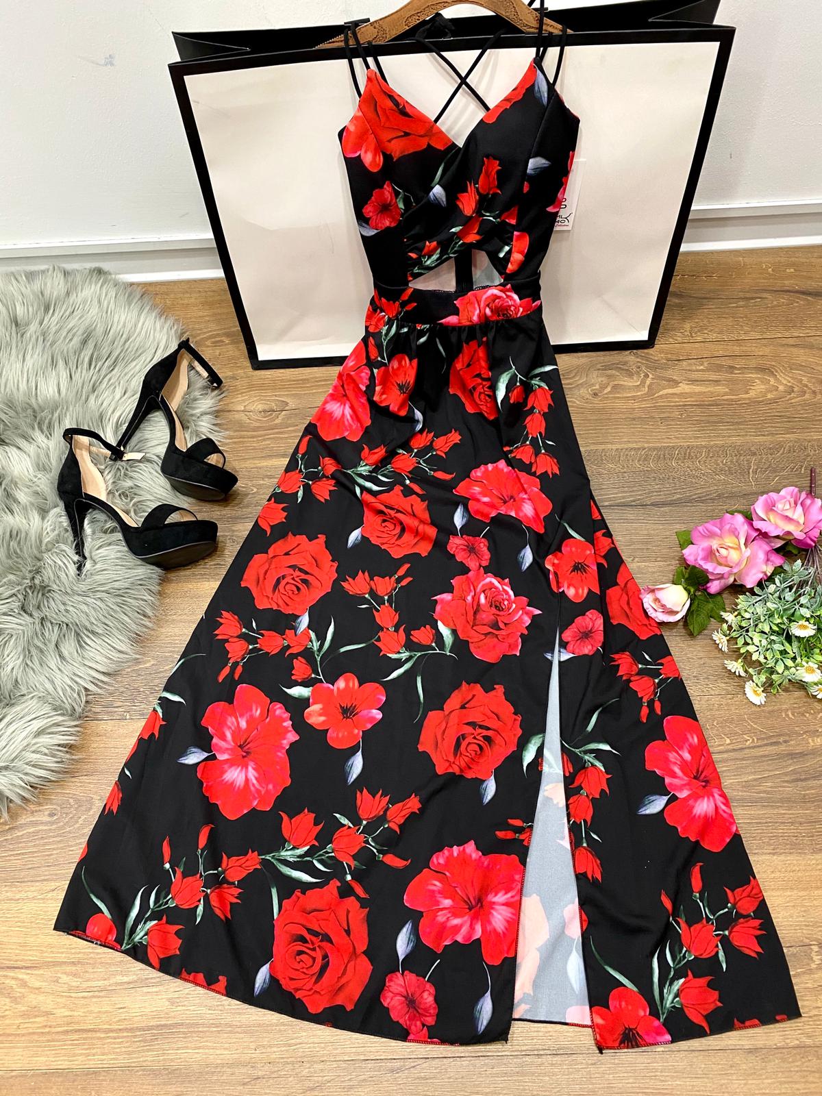 Abito in tessuto scuba crepe nel corpetto e leggero tessuto strutturato nella gonna con fantasia floreale, apertura centrale, elastico in vita, spacco laterale e chiusura con cerniera. Fabbricato in Italia.