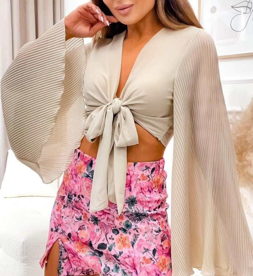 Maglia in raso con allacciatura a fiocco e manica a campana. Fabbricato in Italia.