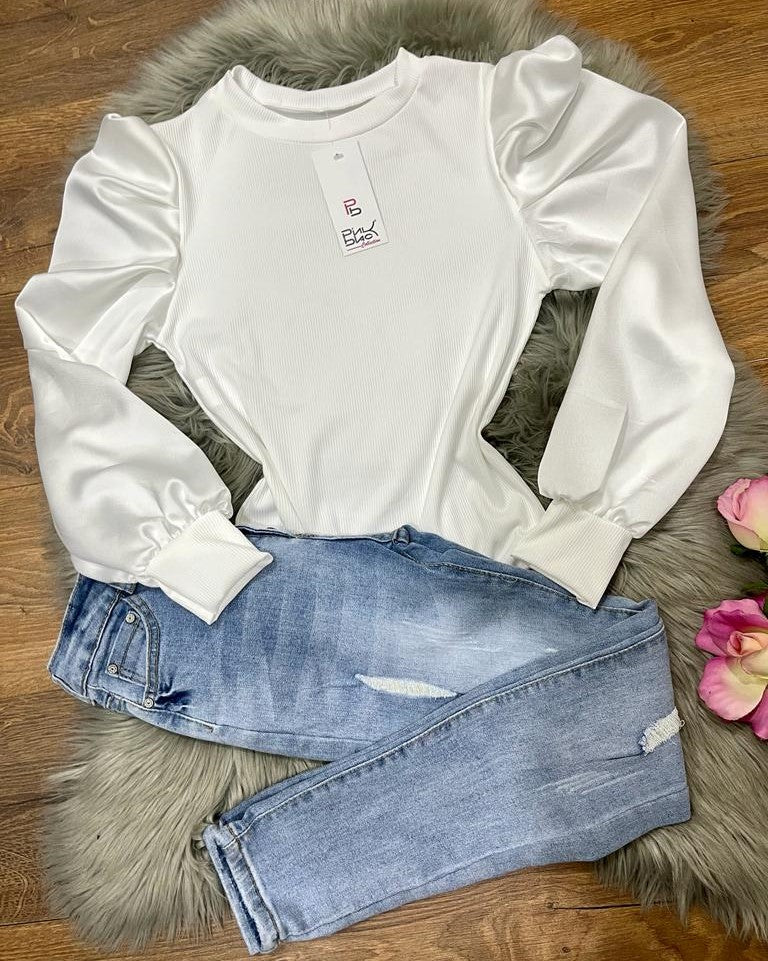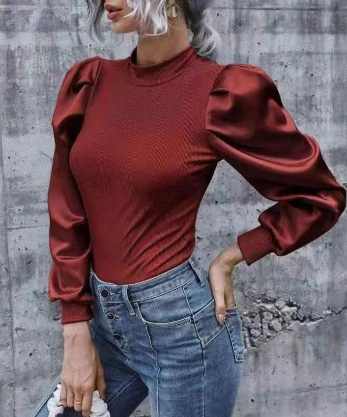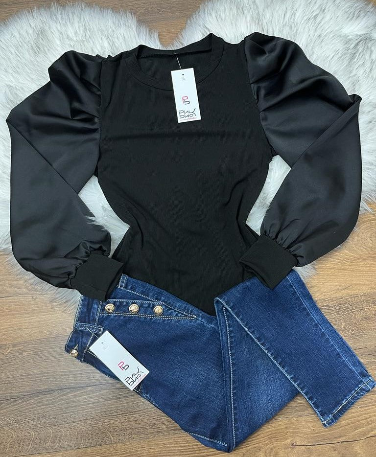 Maglia a costine con manica in raso a palloncino. Fabbricato in Italia.