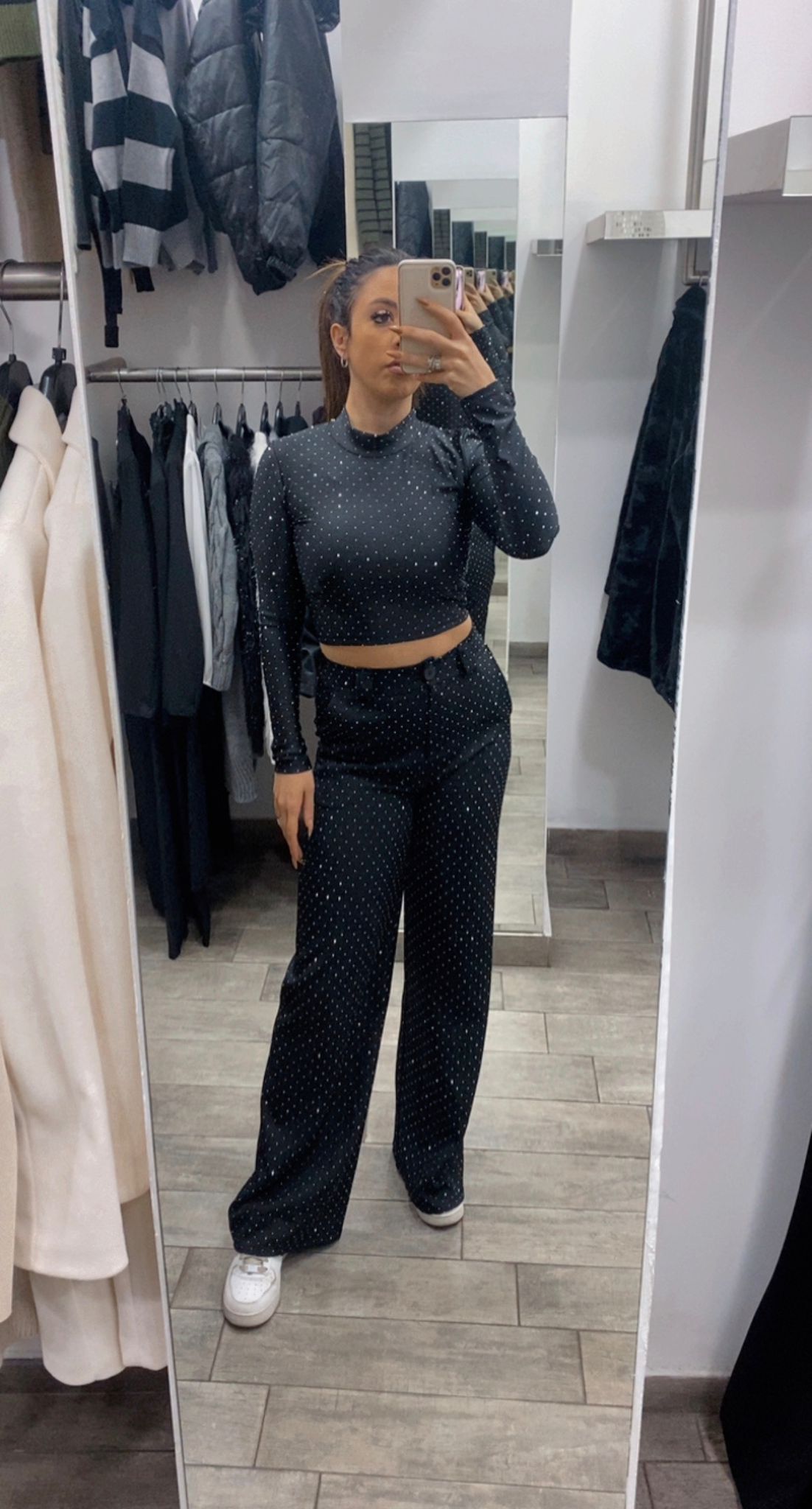 Maglia in raso a manica lunga con applicazioni di dettagli argento in rilievo Fabbricato in Italia.