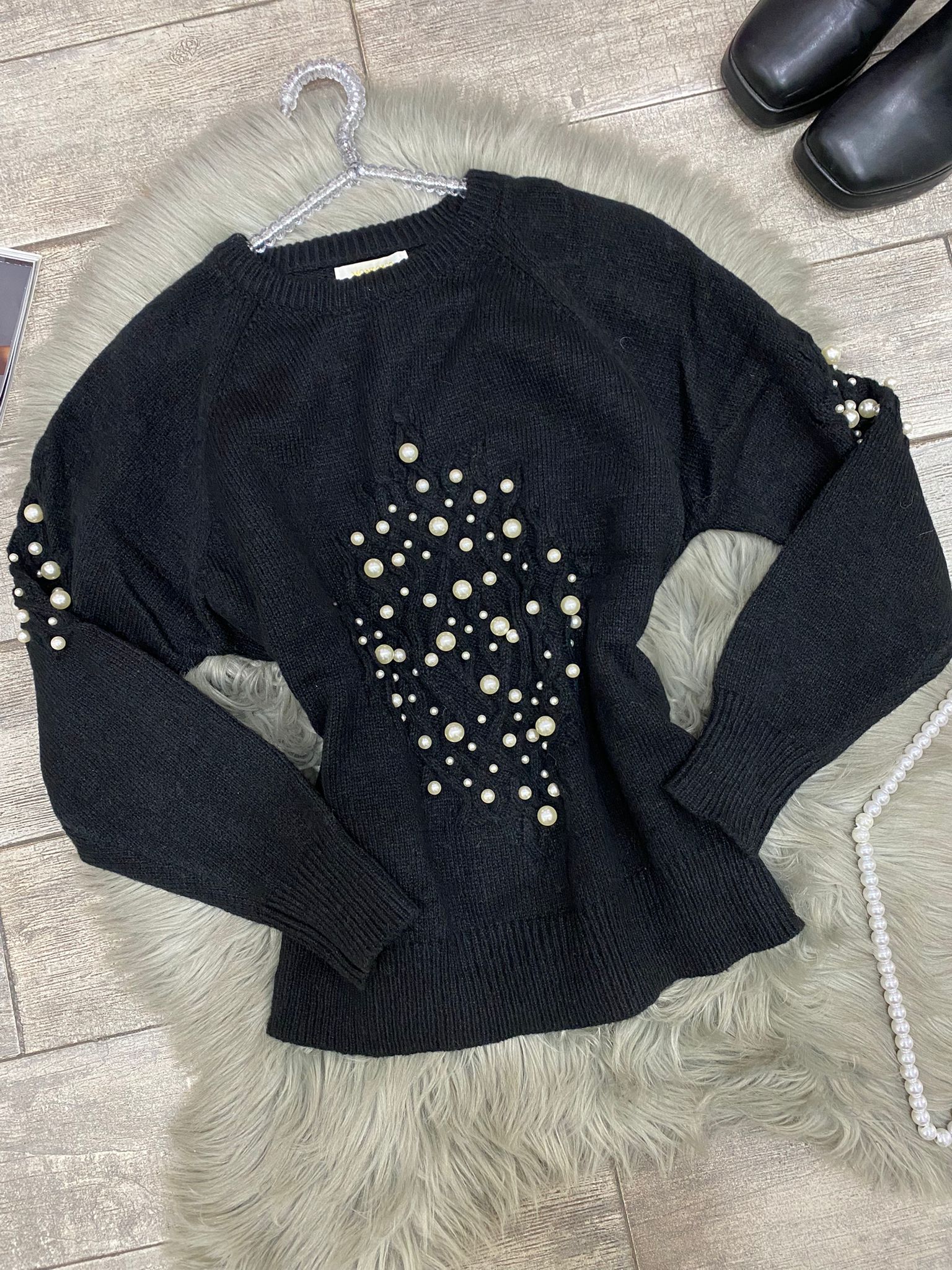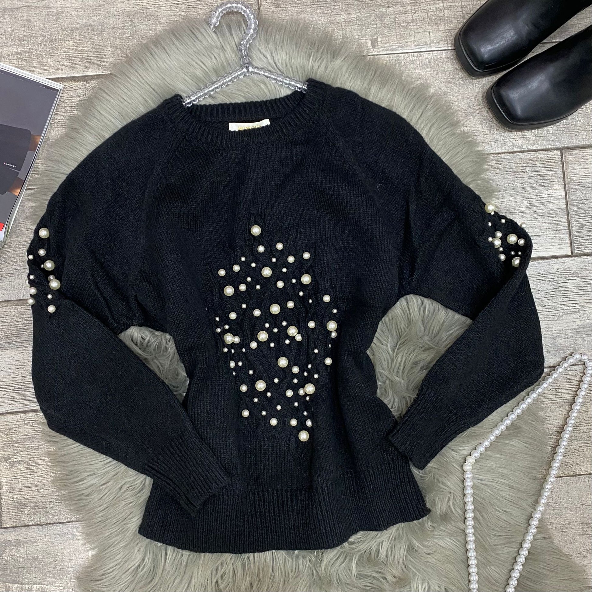 Maglioncino girocollo con perle ricamate sia nella parte centrale che sulle maniche