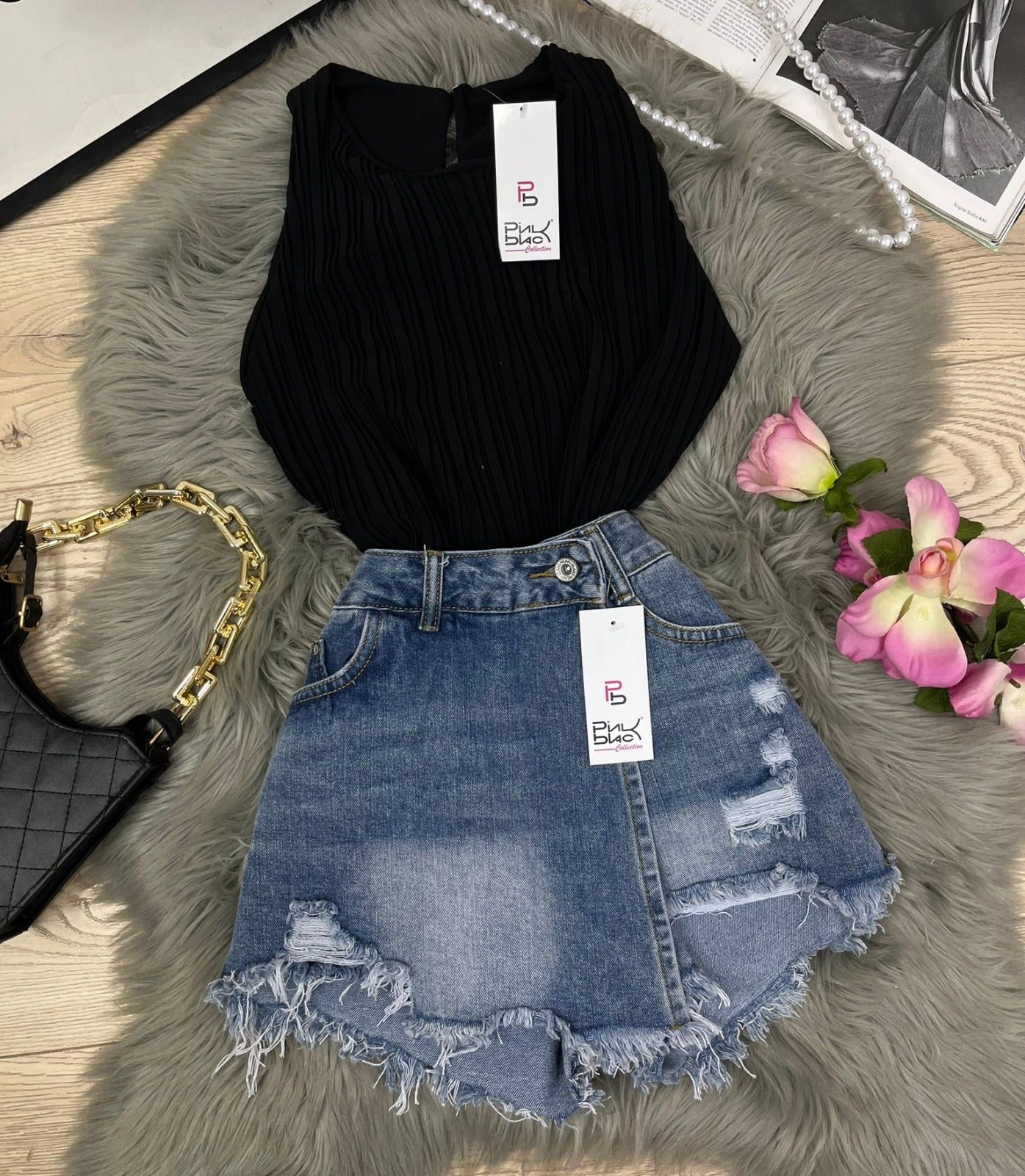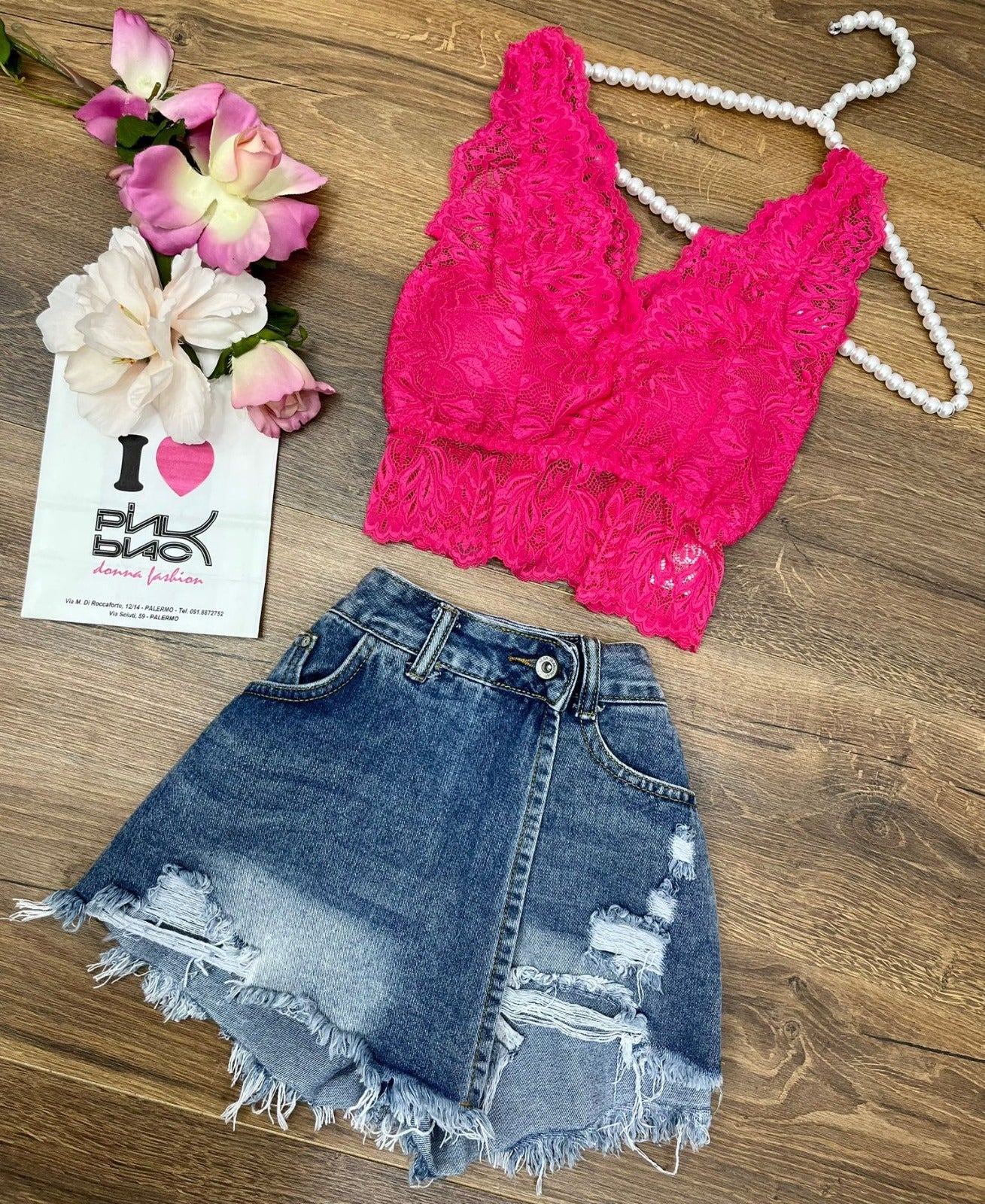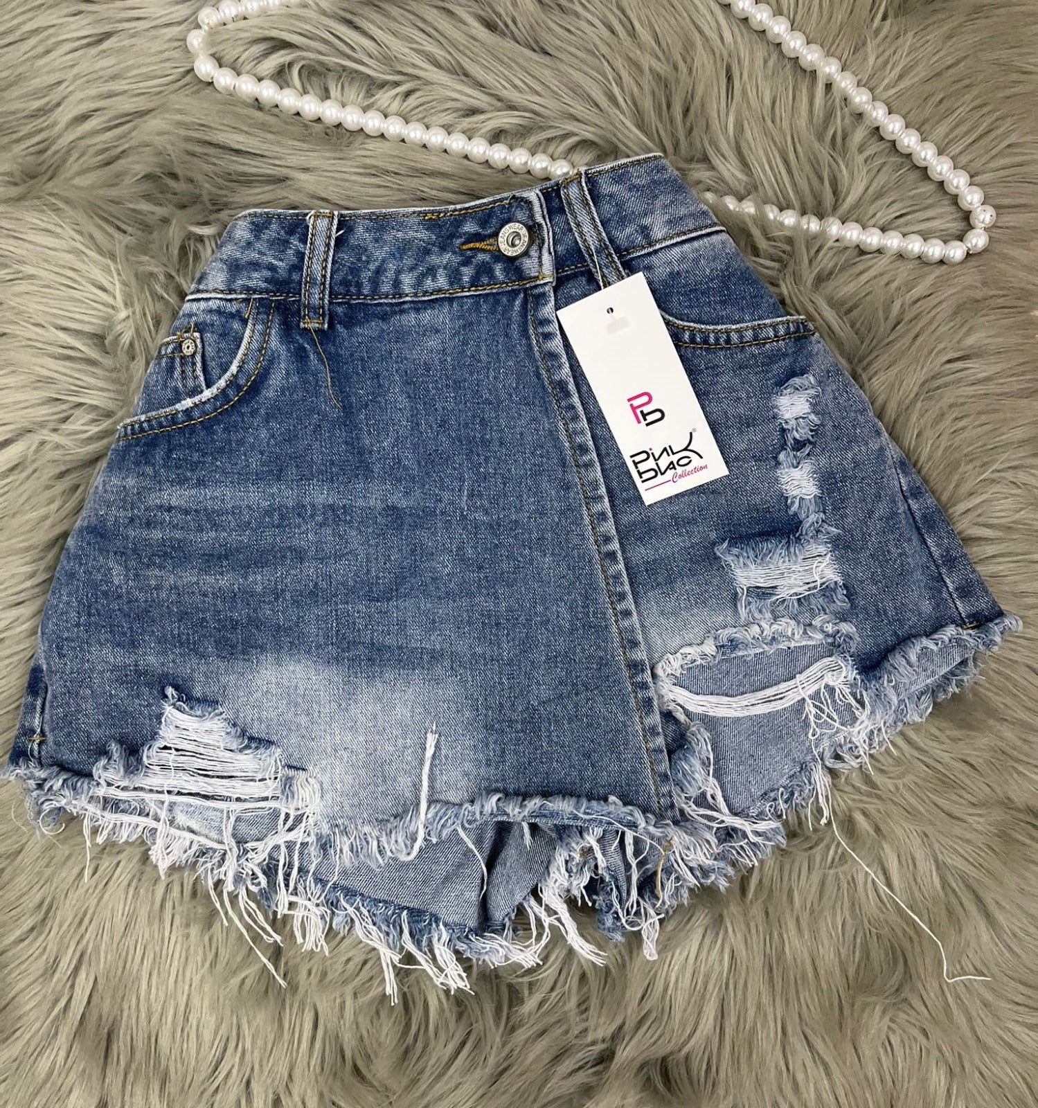 Pantagonna a jeans modello corto asimmetrico con strappi, orlo sfilacciato e tasche. Fabbricato all'estero.
