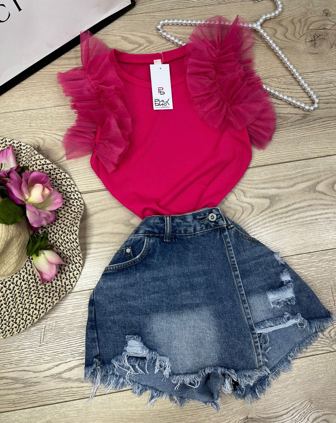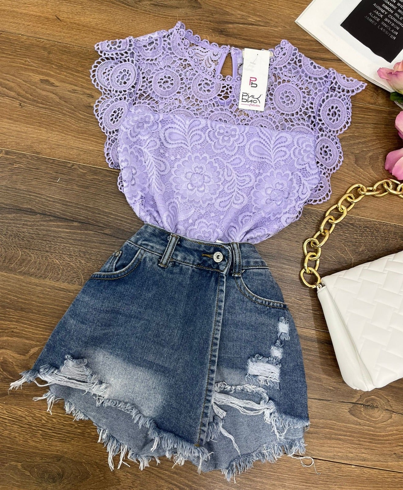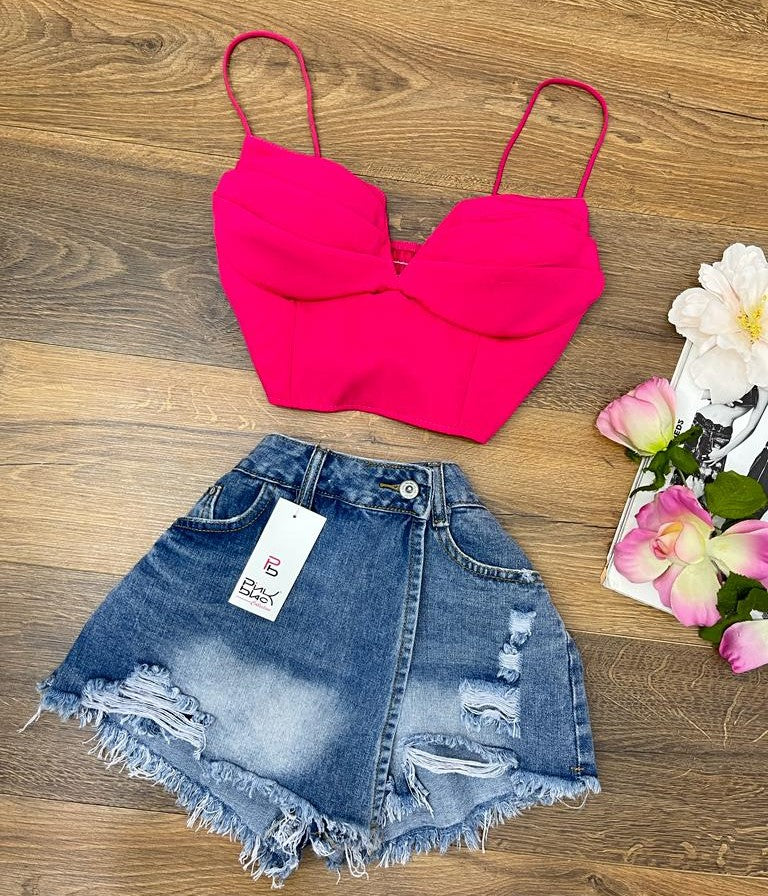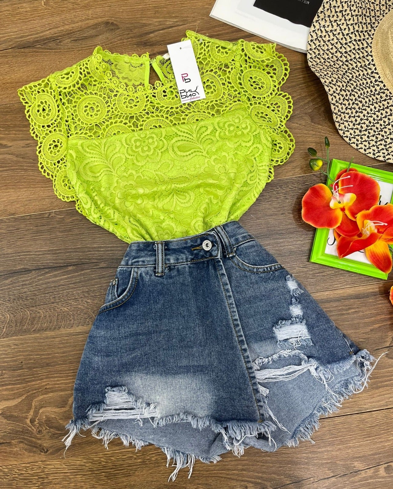 Pantagonna a jeans modello corto asimmetrico con strappi, orlo sfilacciato e tasche. Fabbricato all'estero.
