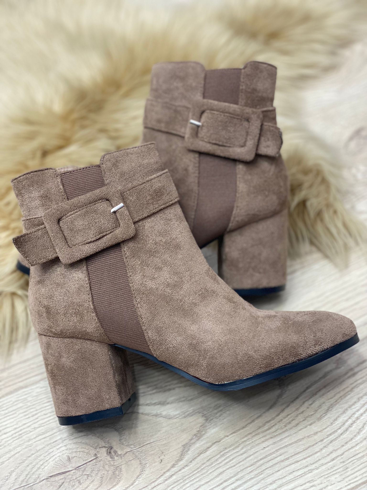 Stivaletto in camoscio con fibbia e tacco comodo.
