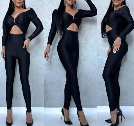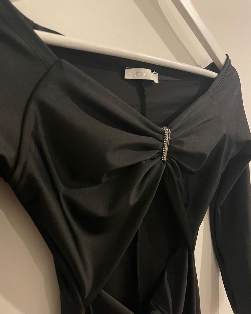 Tuta effetto lycra con aperura centrale e spilla con strass. Fabbricato in Italia.