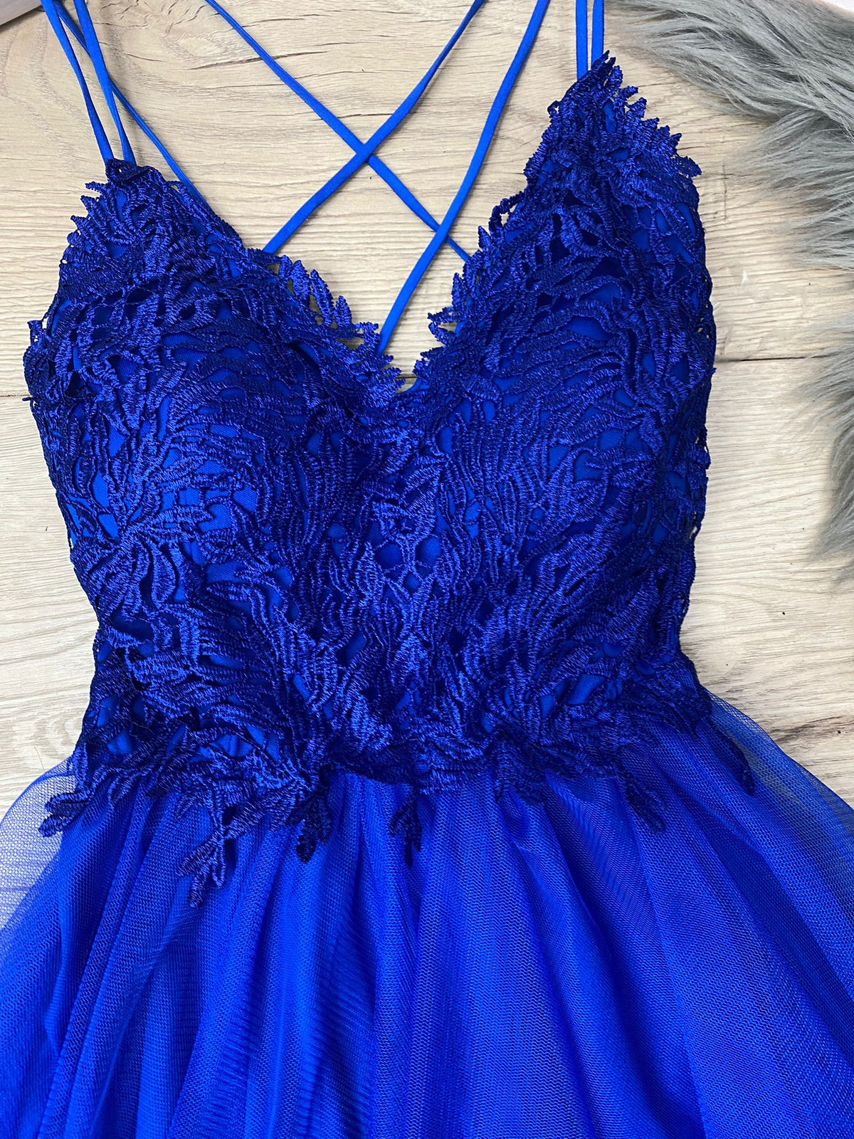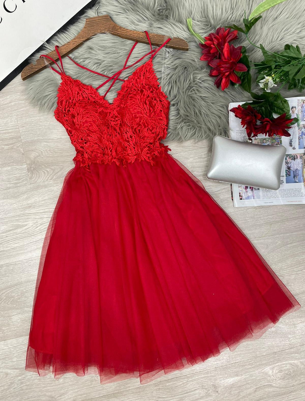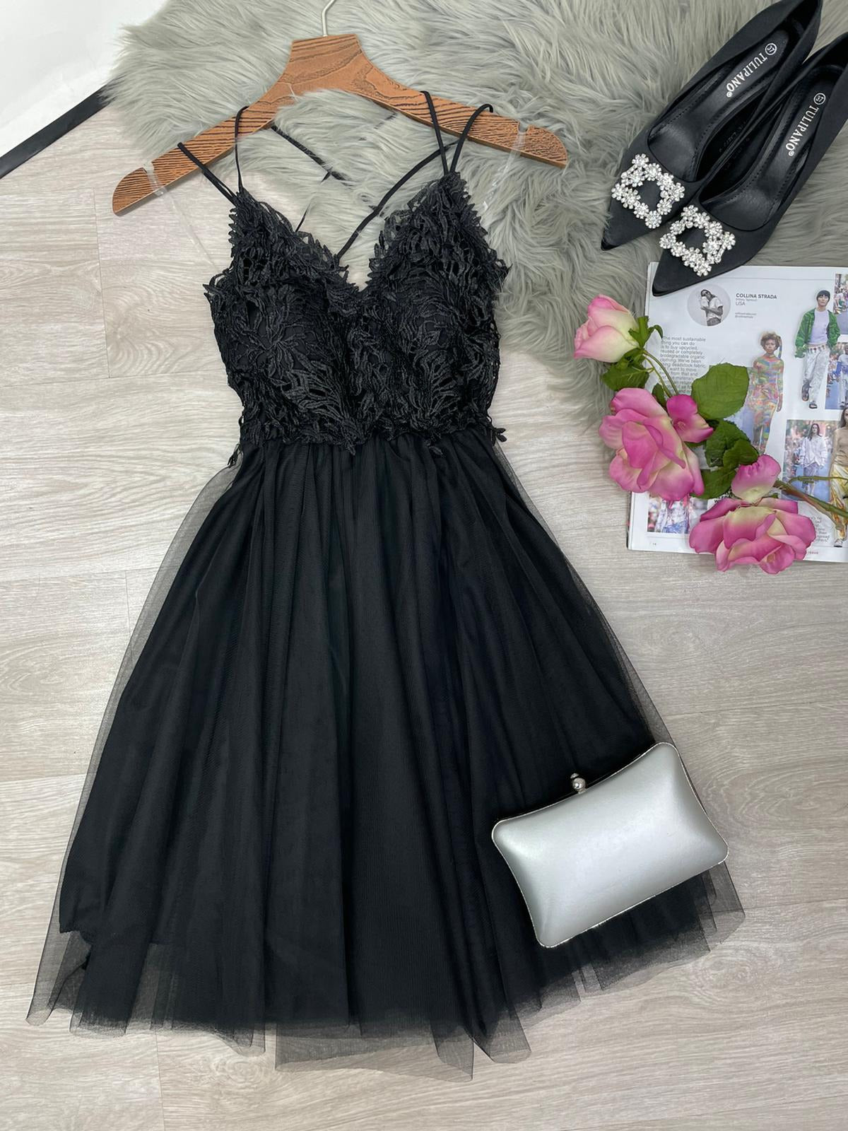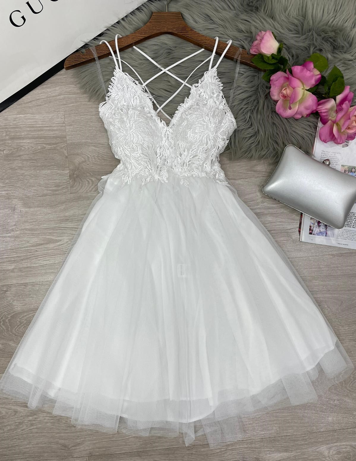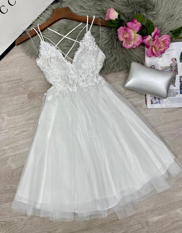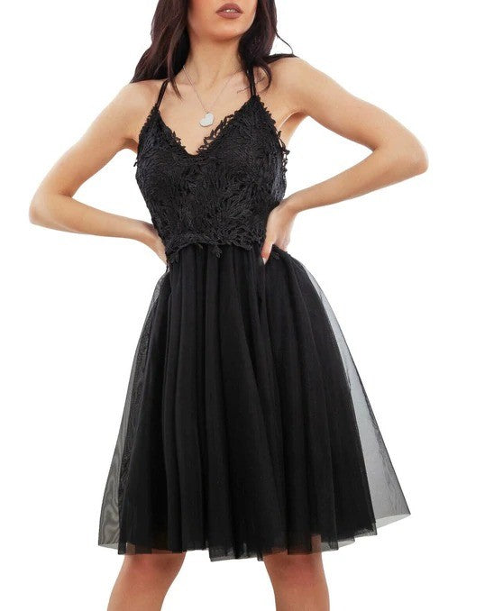 Abito corto con top di pizzo, scollo profondo, incrocio, arricciatura sul retro e coppe preformate. Gonna a campana in tulle. Fabbricato in Italia.