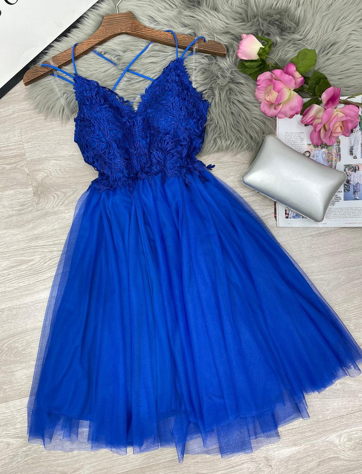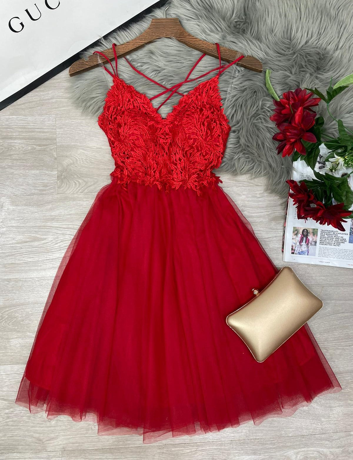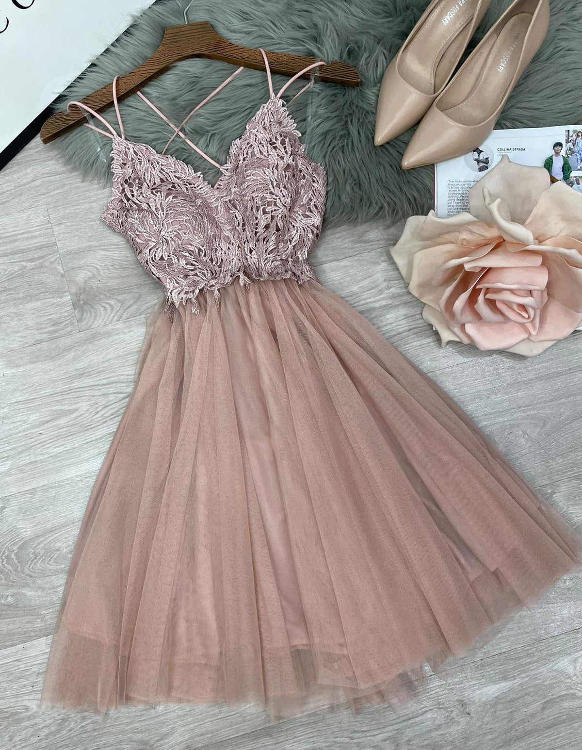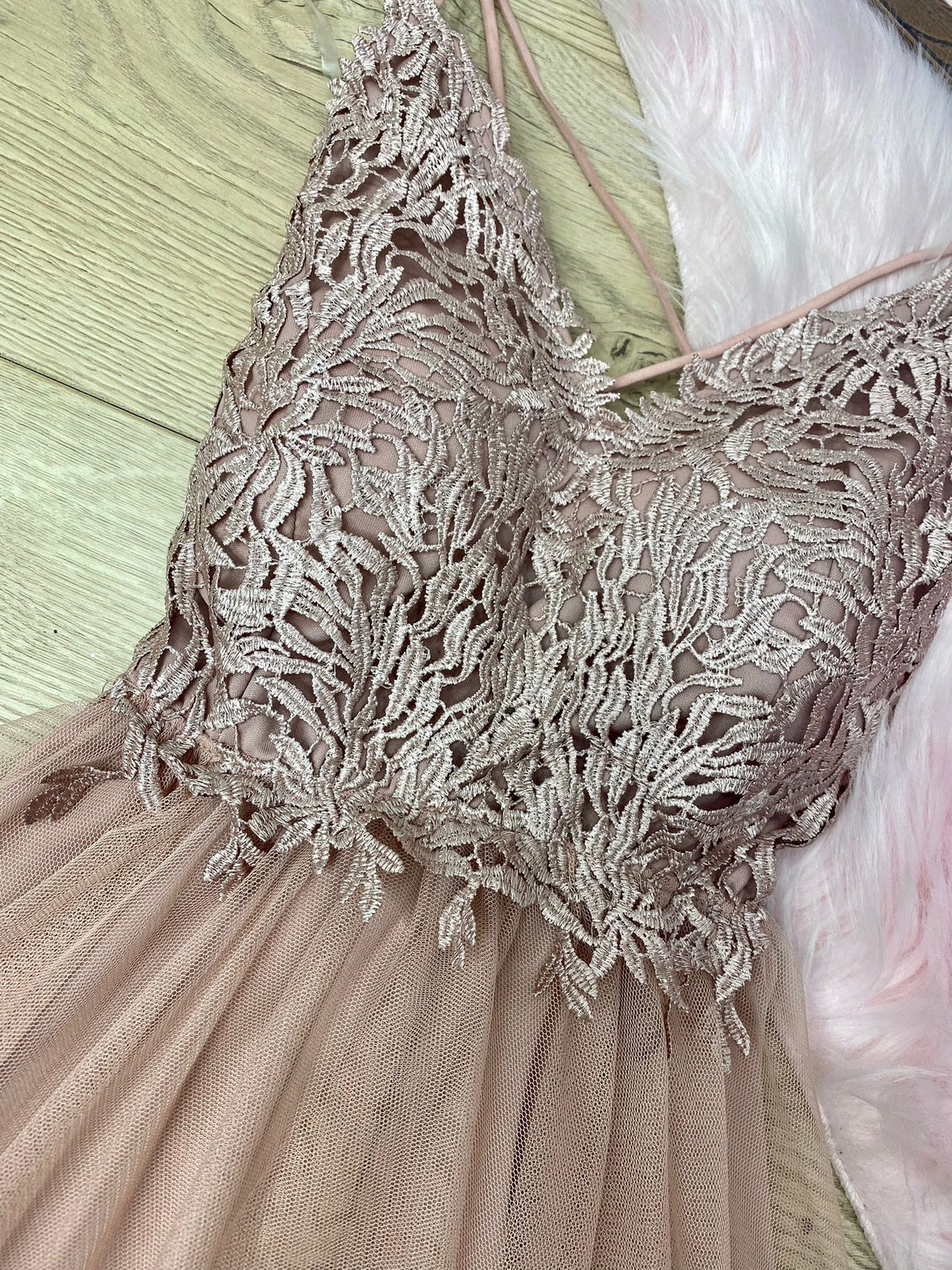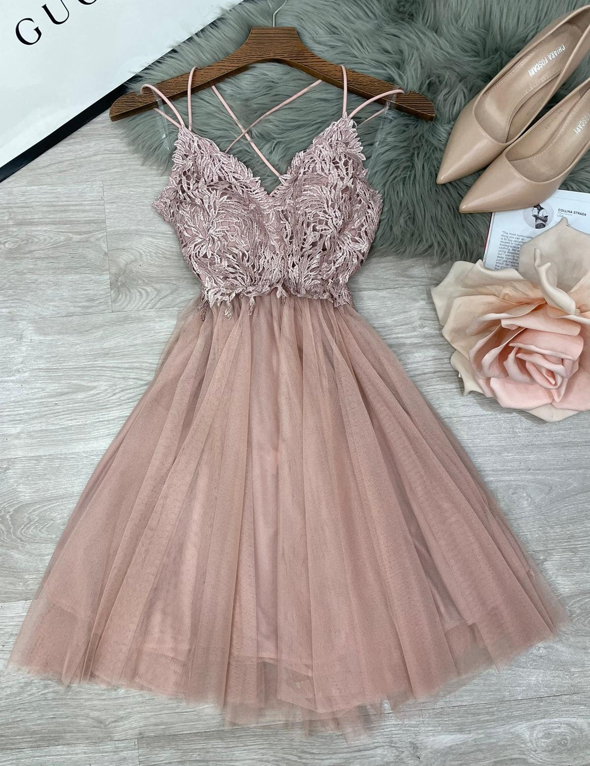 Abito corto con top di pizzo, scollo profondo, incrocio, arricciatura sul retro e coppe preformate. Gonna a campana in tulle. Fabbricato in Italia.