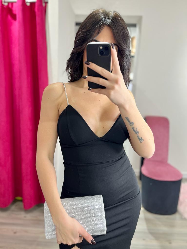 Abito in tessuto scuba crepe con coppe preformate, spalline con strass e spacco. Fabbricato in Italia.
