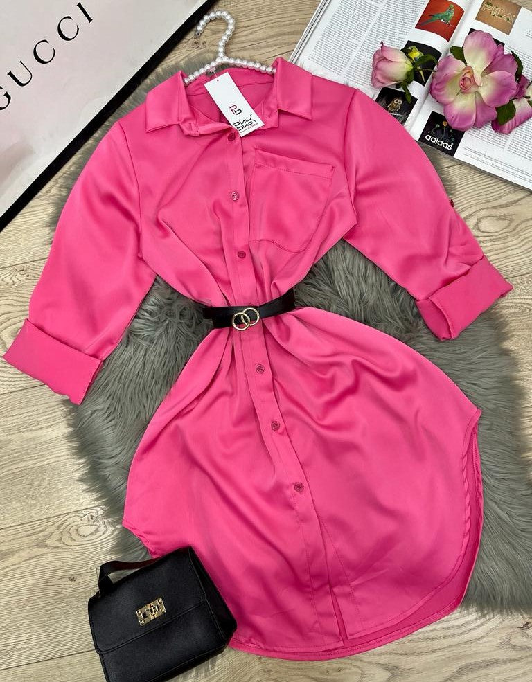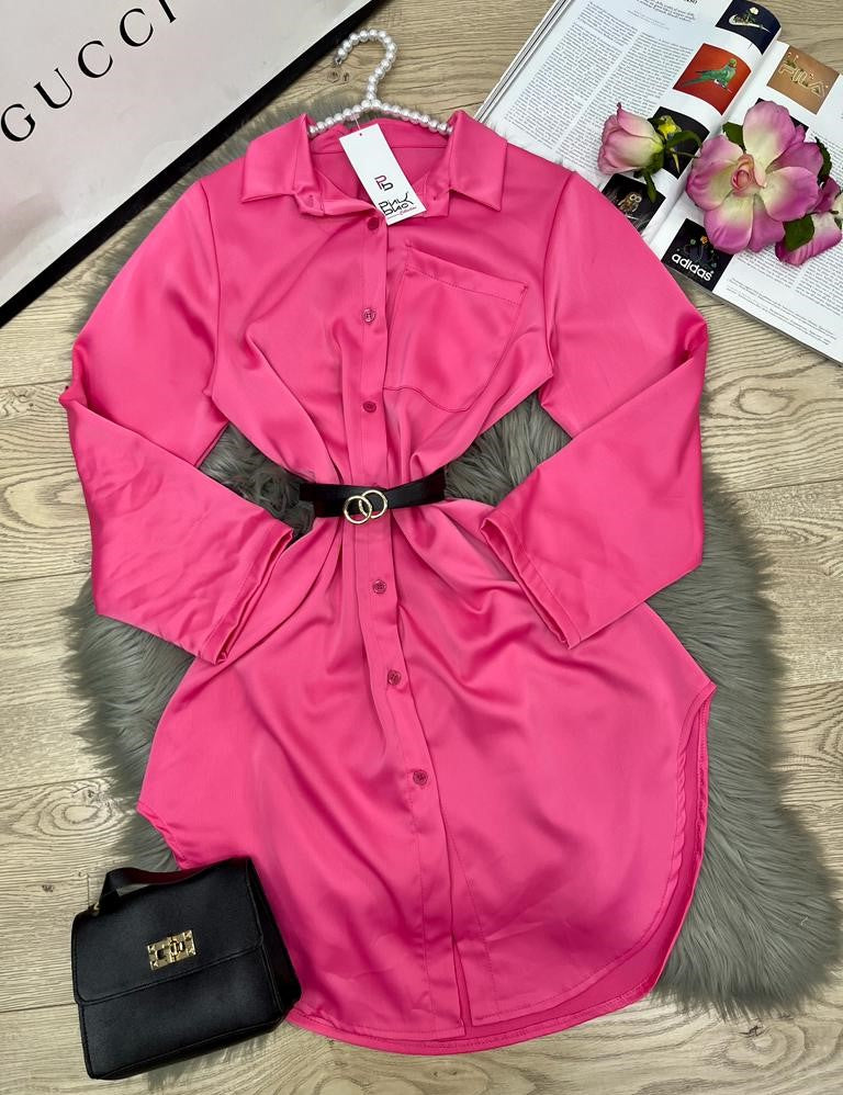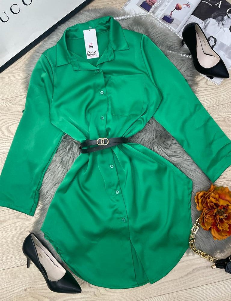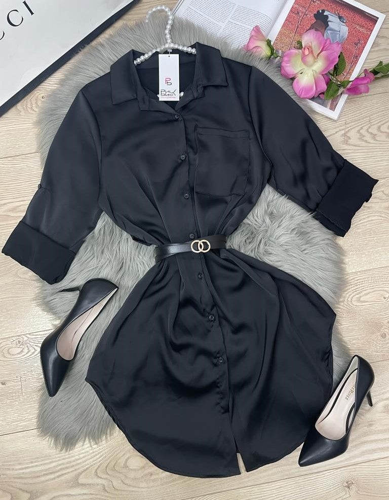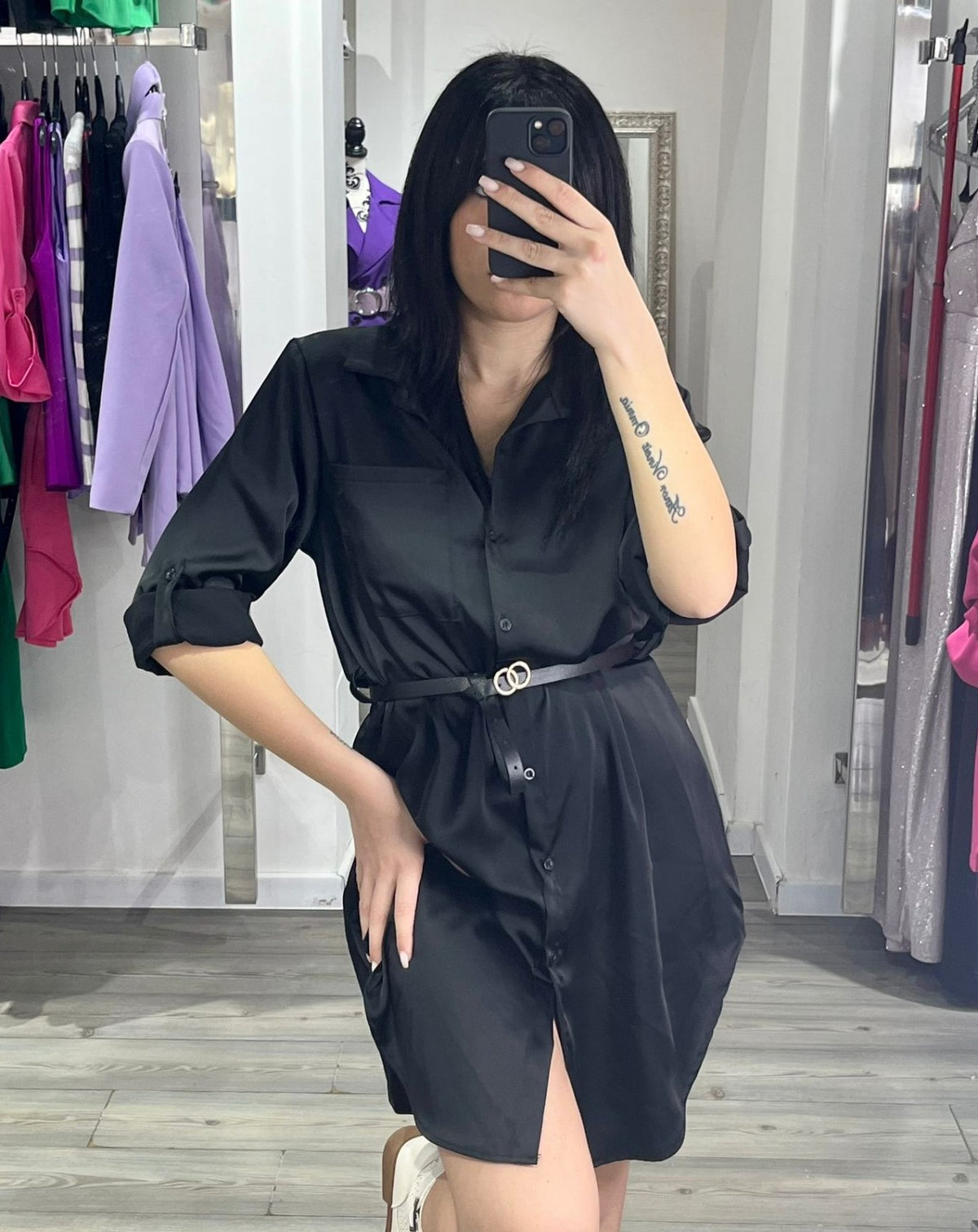 Abito modello chemisier effetto raso con bottoni, maniche con risvolto e cintura inclusa. Fabbricato in Italia.