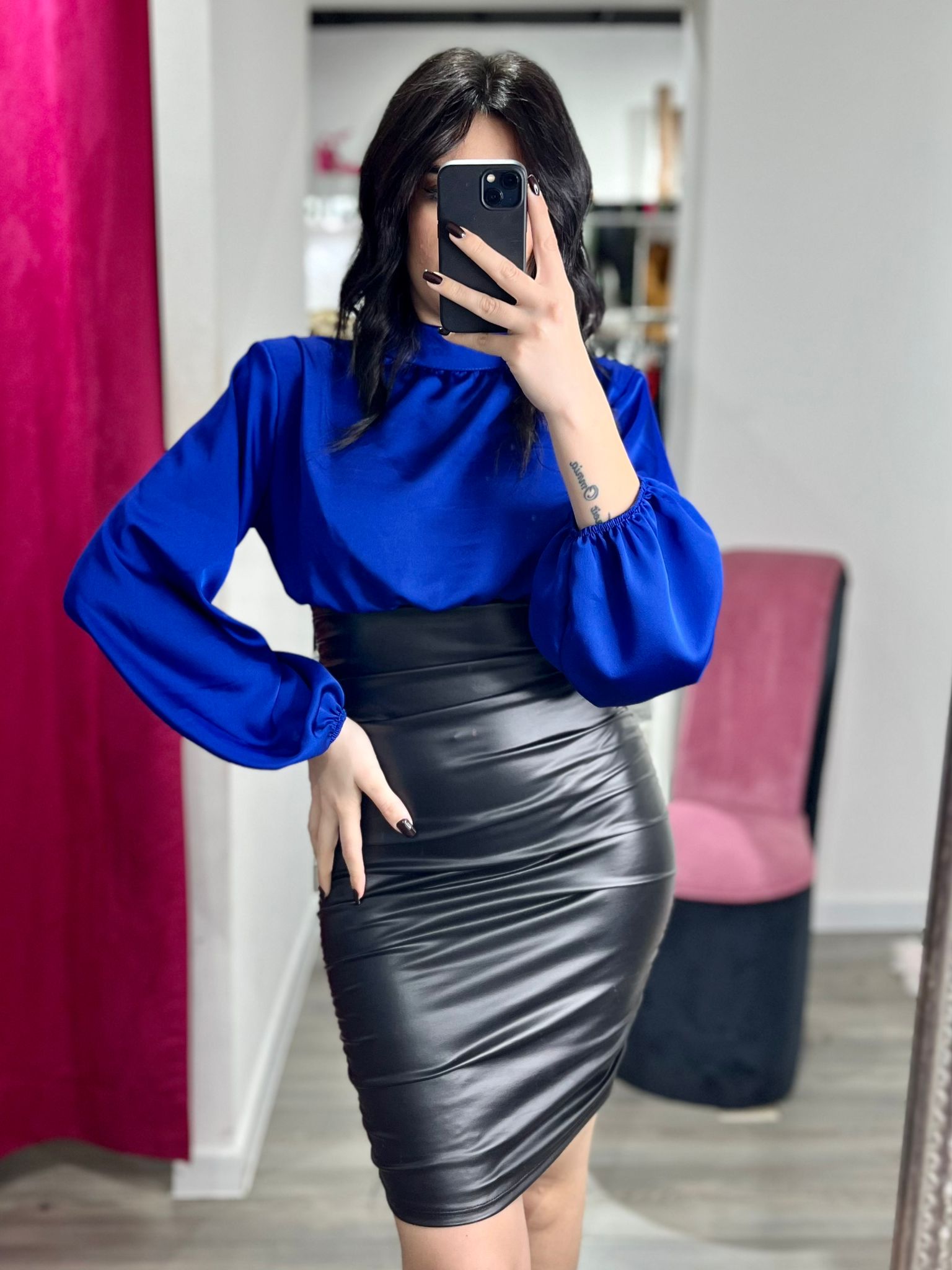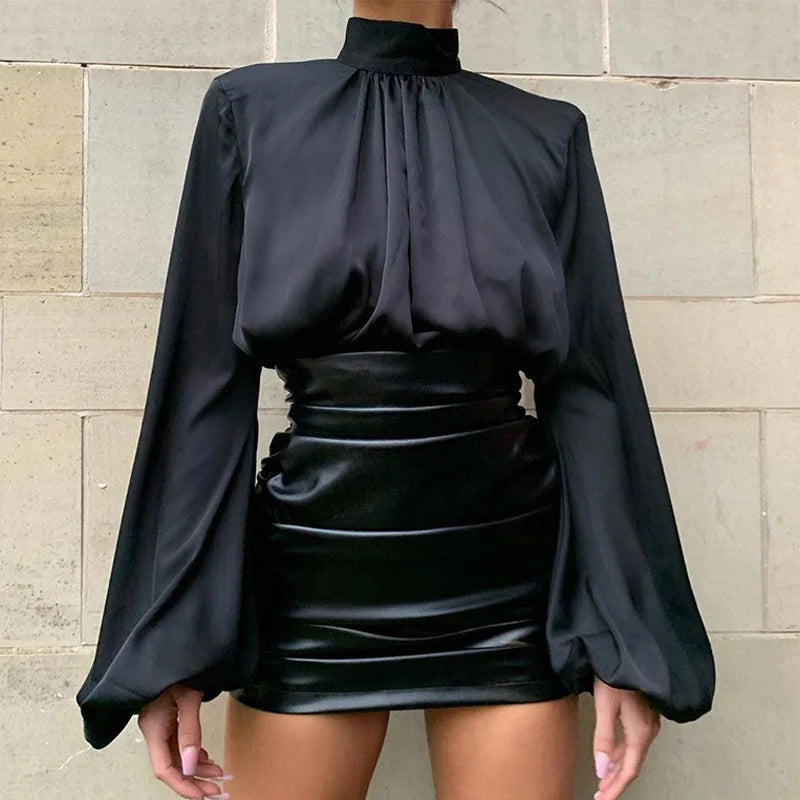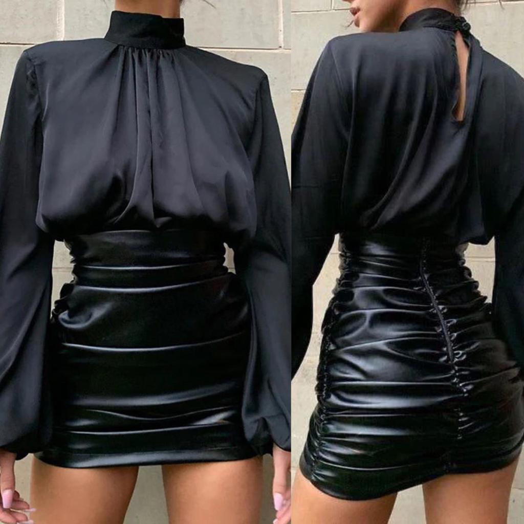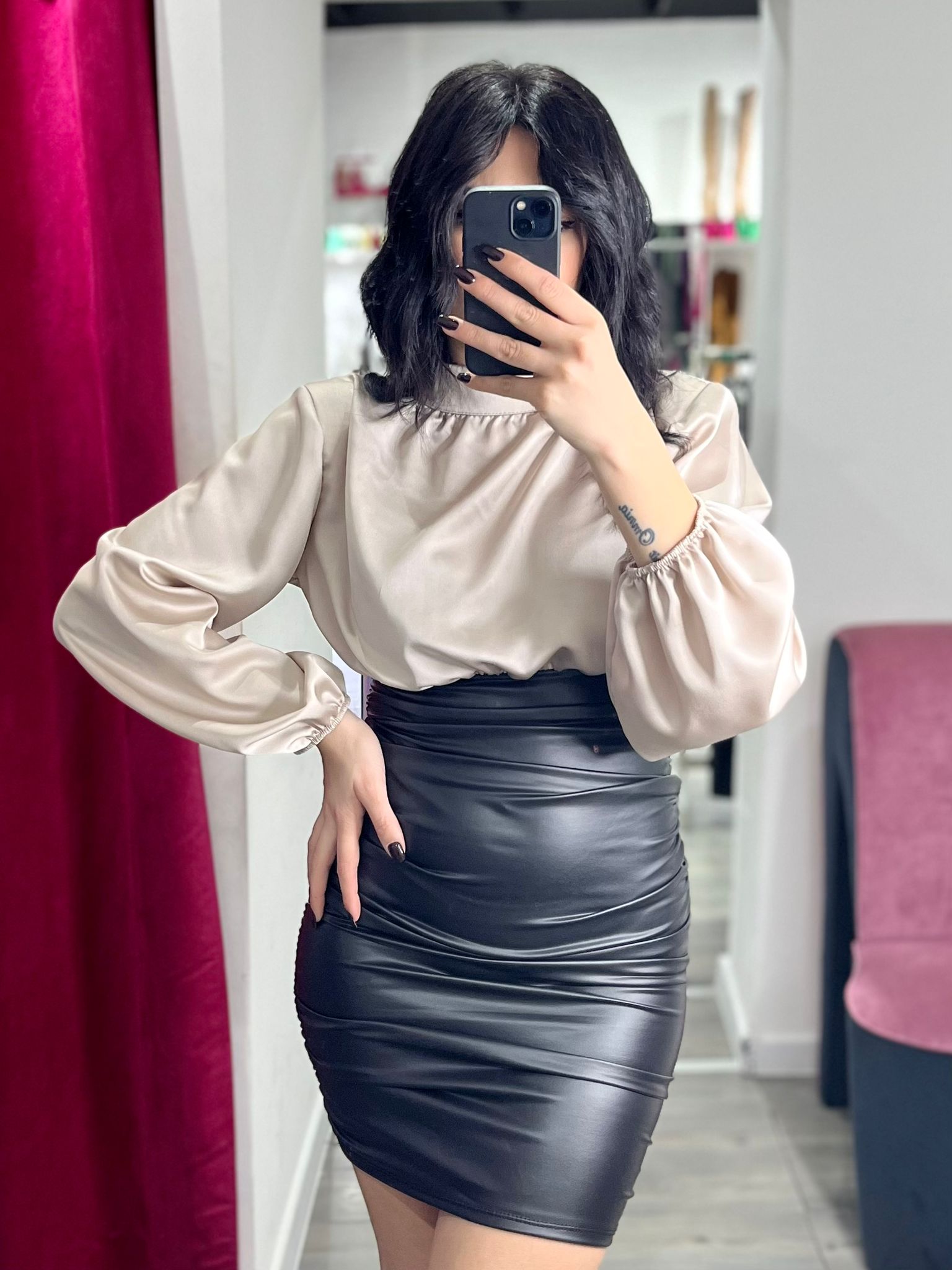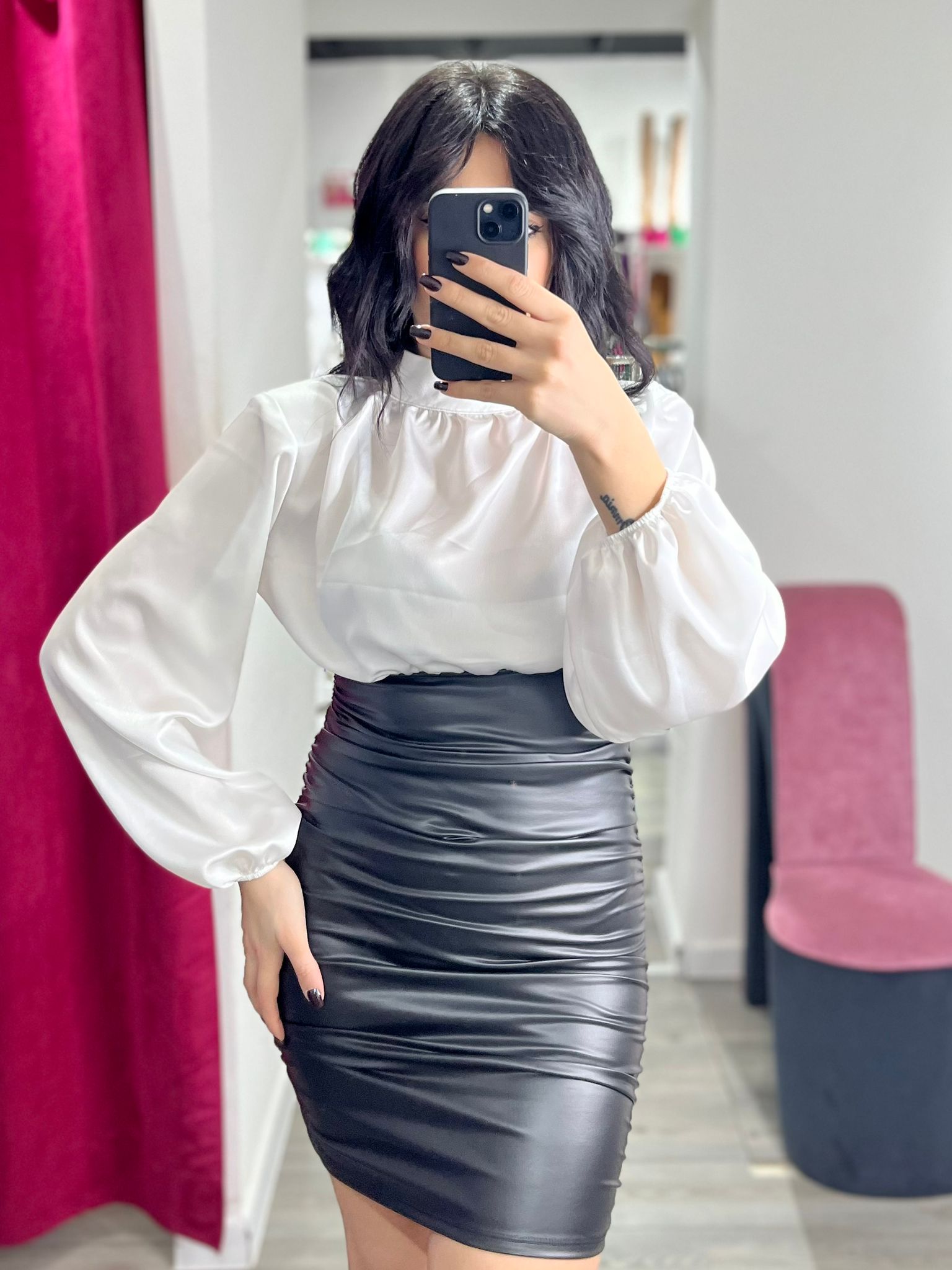 Abito in raso ed ecopelle, manica a palloncino e gonna drappeggiata. Fabbricato in Italia.