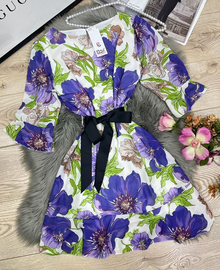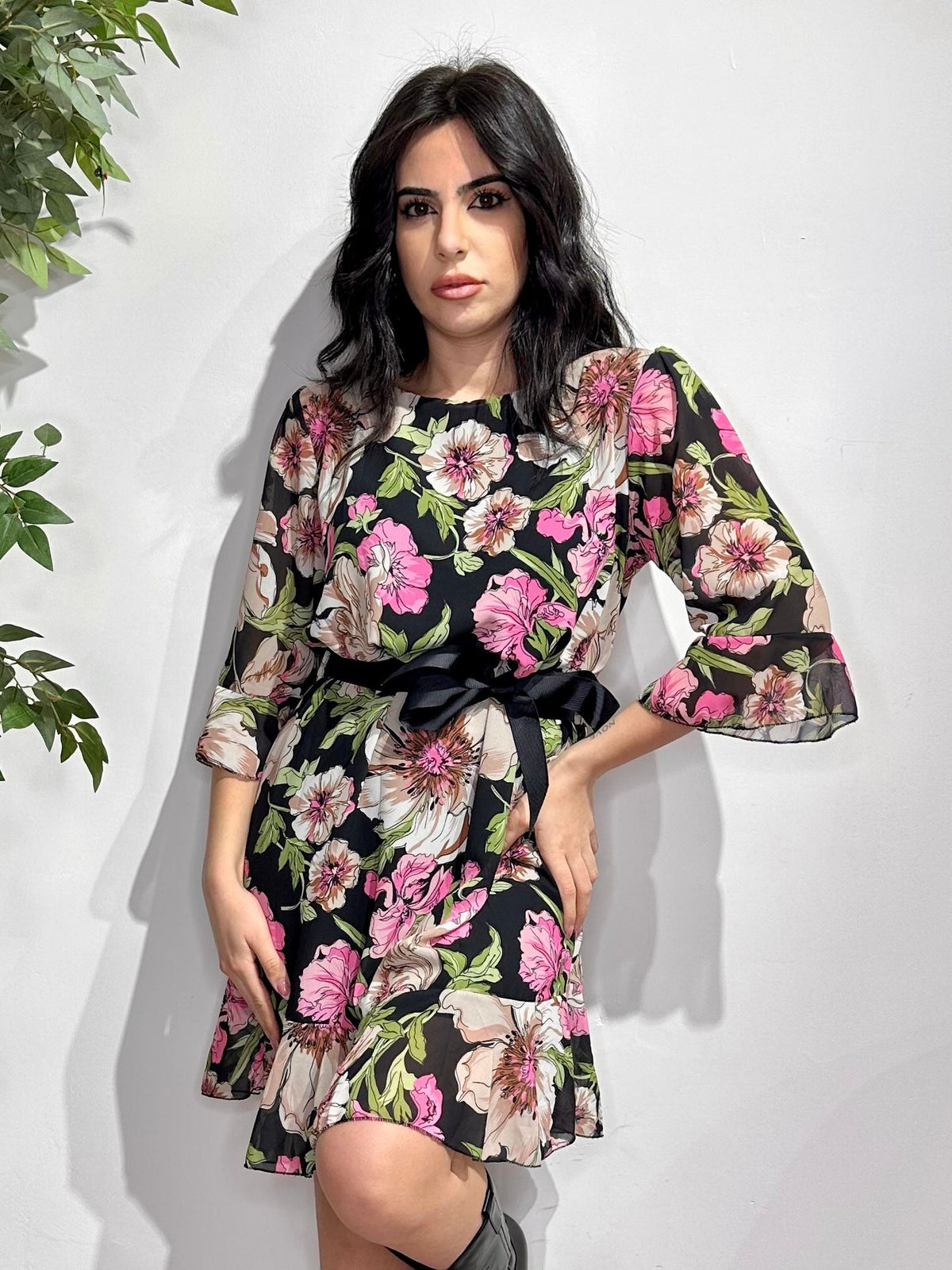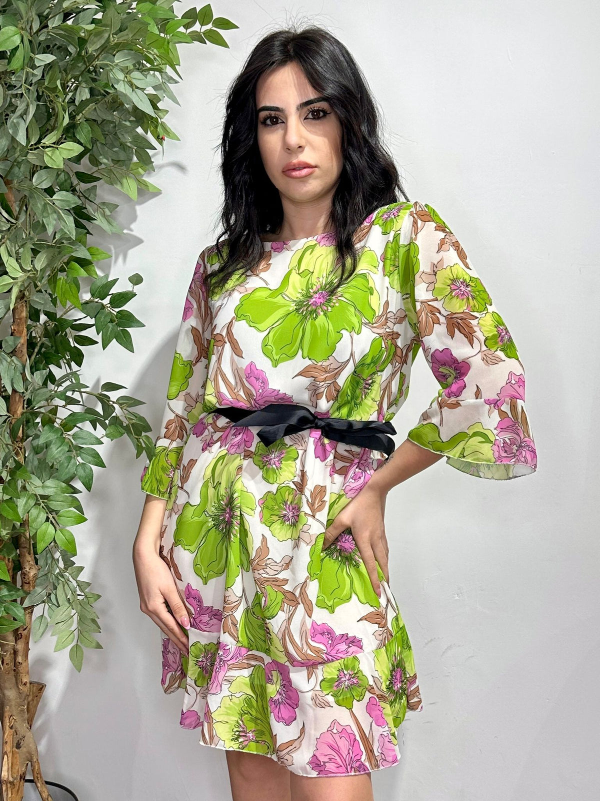 Abito in chiffon con fantasia floreale e cintura in nastro inclusa. Fabbricato in italia.