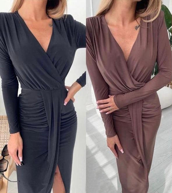 Abito lungo in tessuto strutturato con gonna drappeggiata e spacco. Fabbricato in Italia.