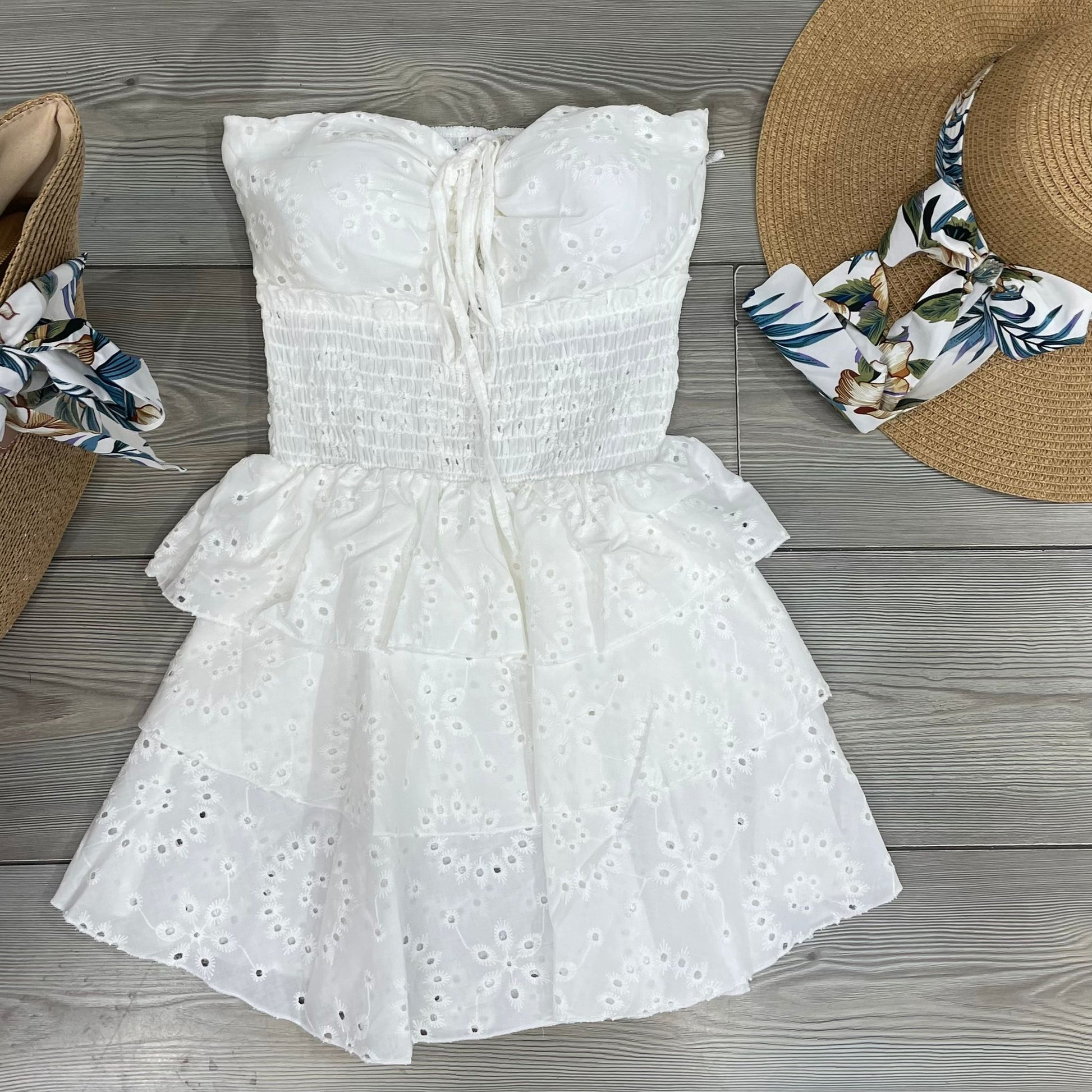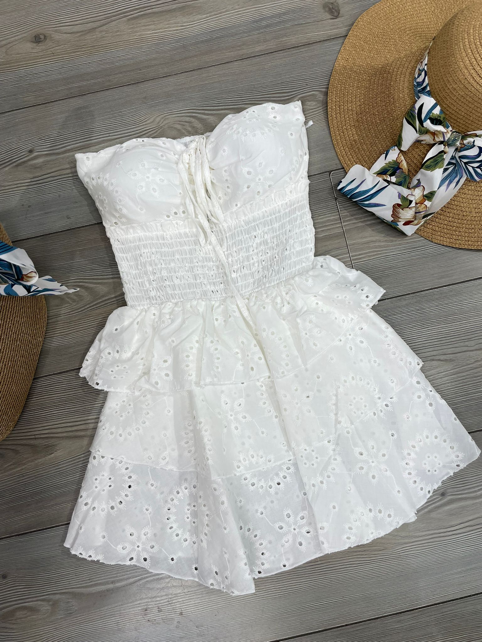 Abito corto effetto pizzo san gallo con scollatura a fascia, coppette preformate e fascia elastica sul retro.