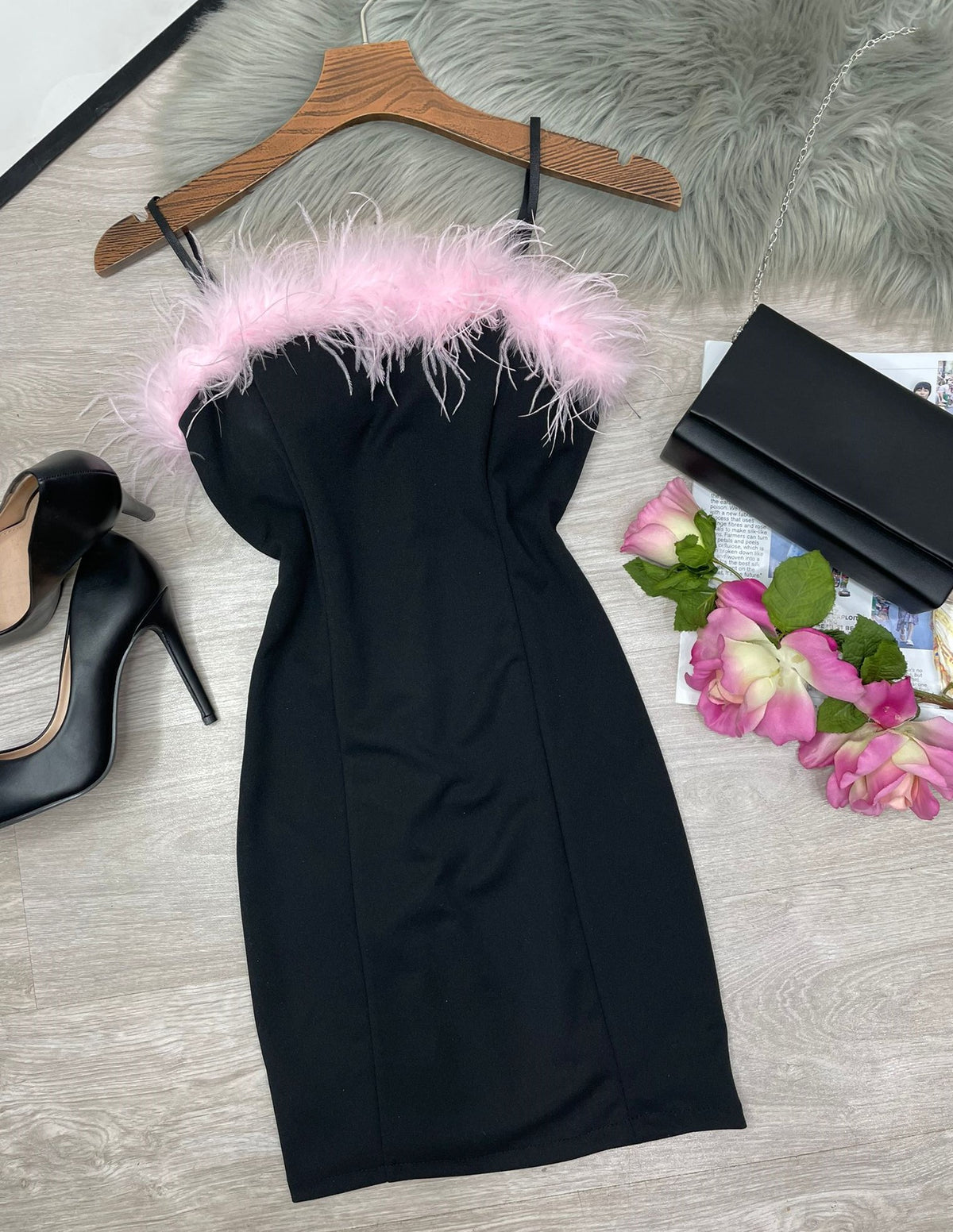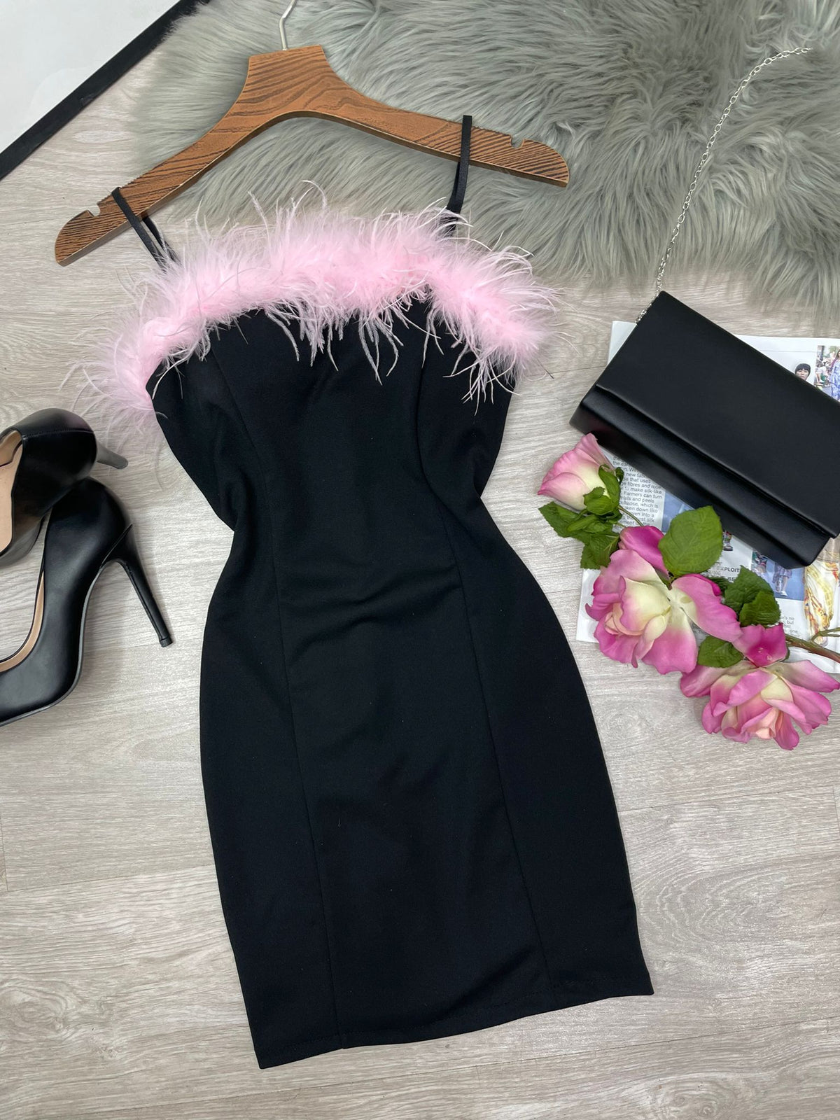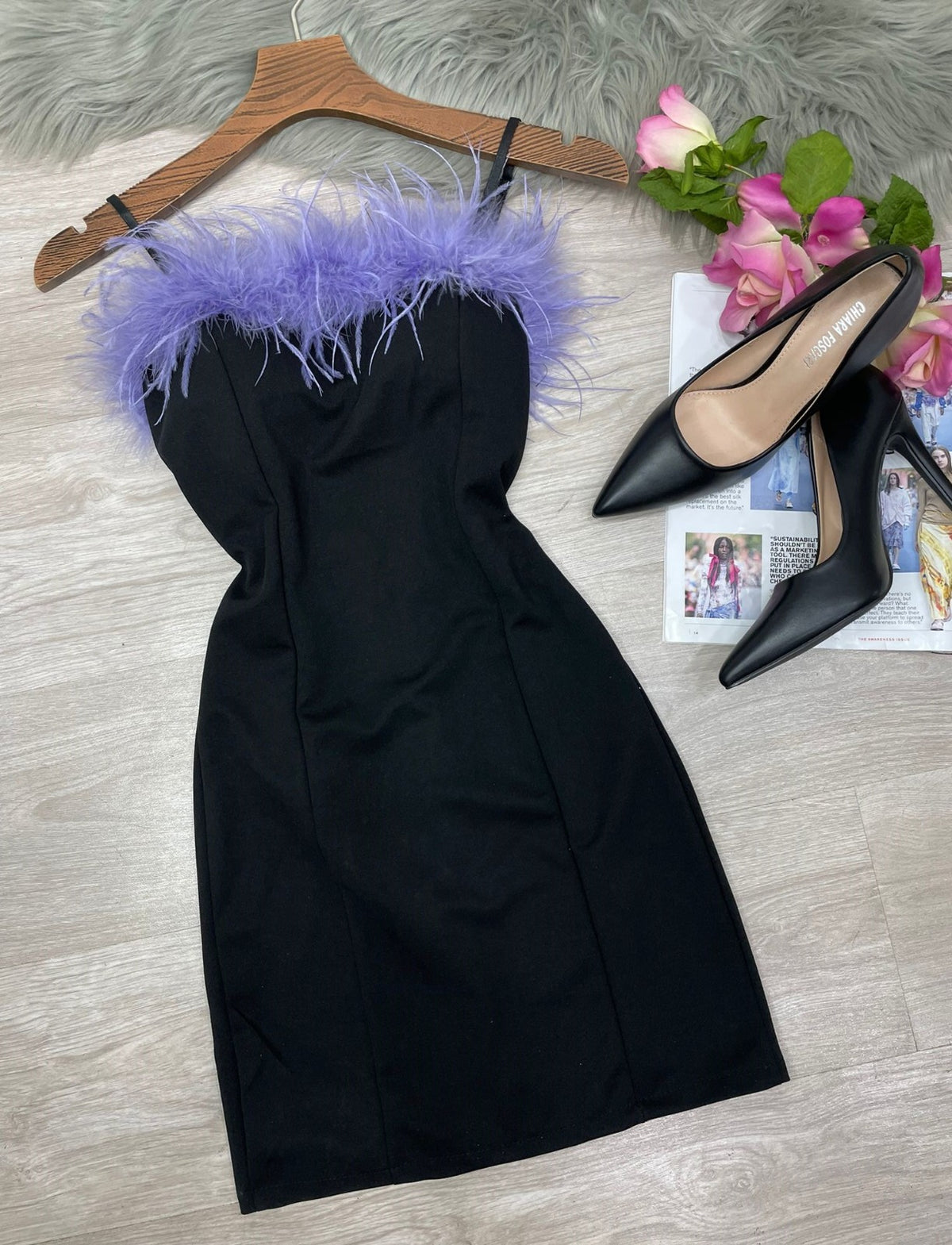 Abito in tessuto scuba crepe con piume, coppe preformate, spalline regolabili e cerniera posteriore. Fabbricato in Italia.