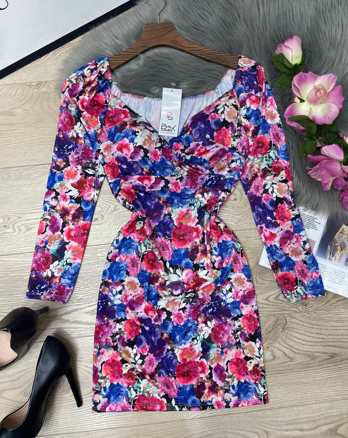 Abito in leggero tessuto strutturato con fantasia floreale, coppe preformate e manica lunga. Fabbricato in Italia.