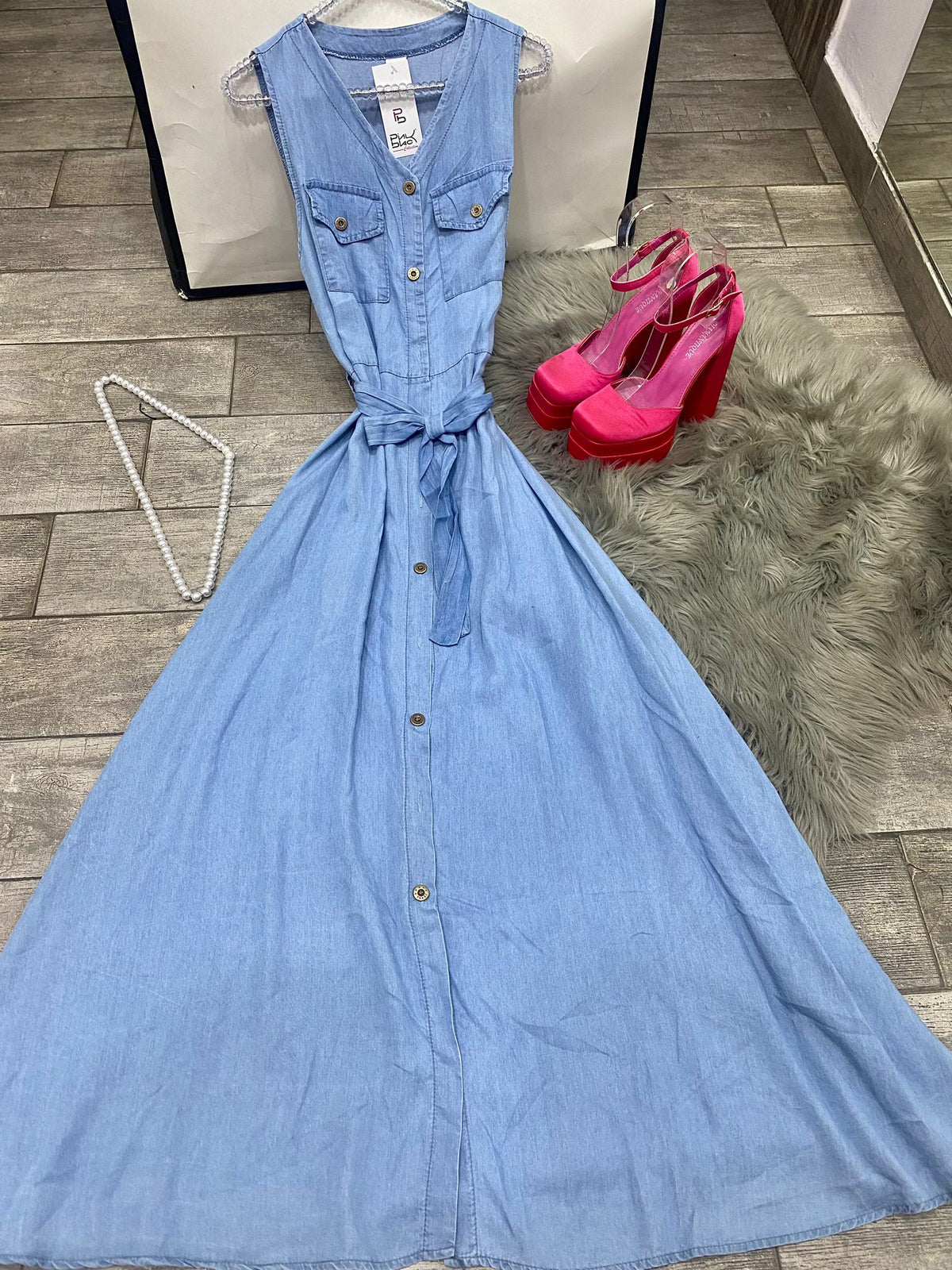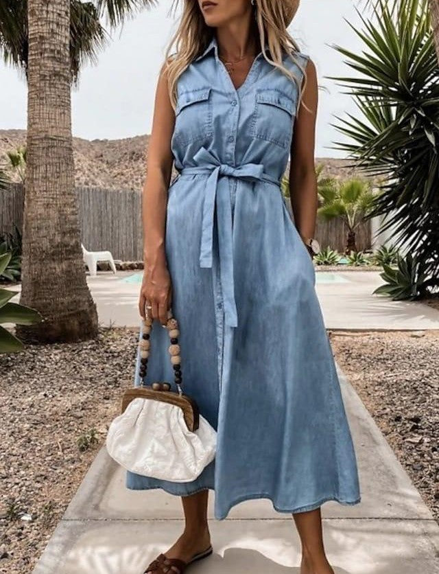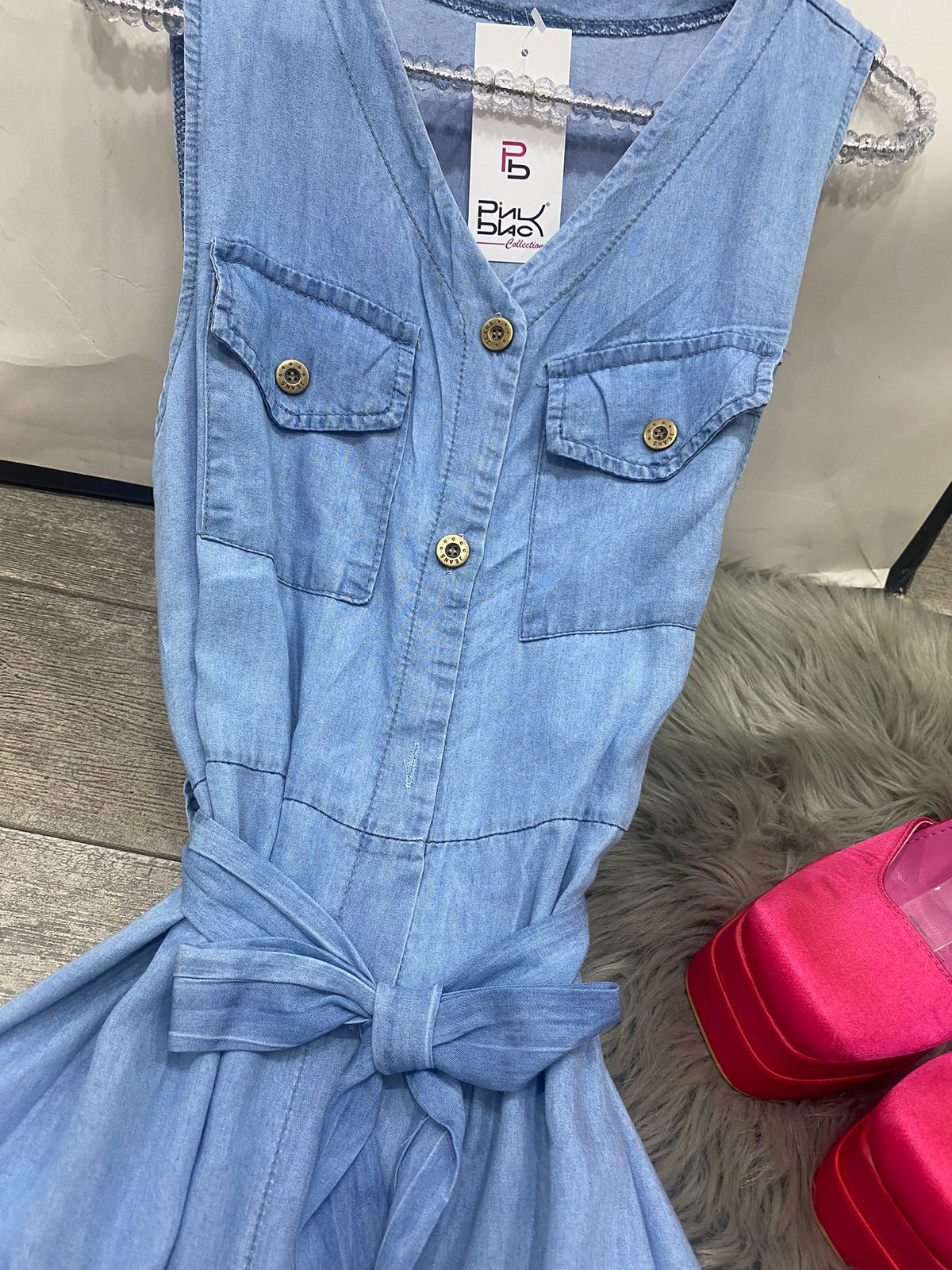 Abito modello camicione in jeans chambray  smanicato con bottoni centrali e  cintura inclusa. Fabbricato in Italia.