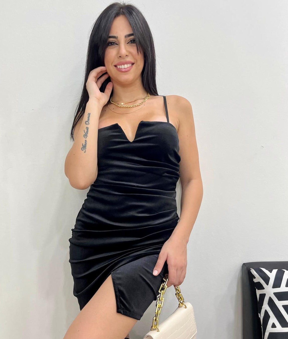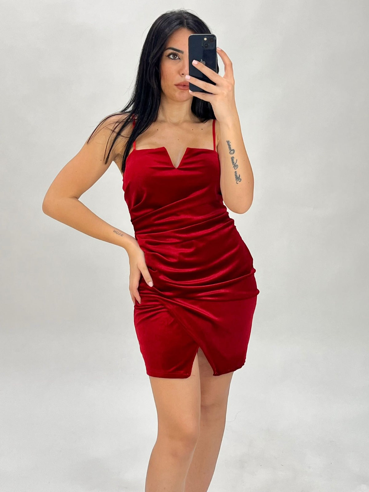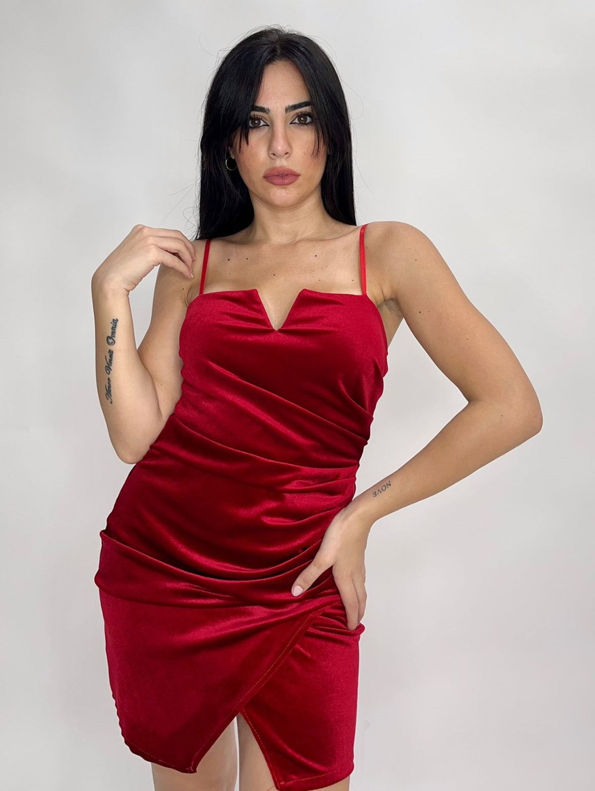 Abito in ciniglia con coppe preformate, spalline reoglabili e gonna a portafoglio con drappeggio. Fabbricato in Italia.