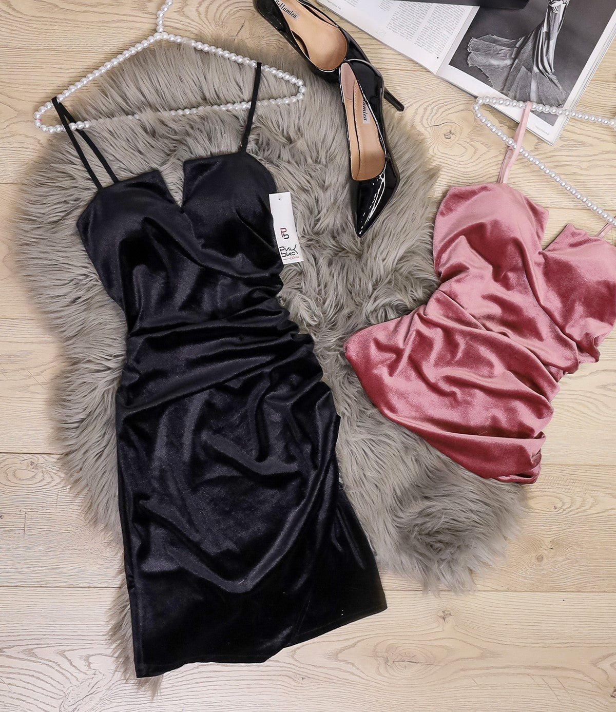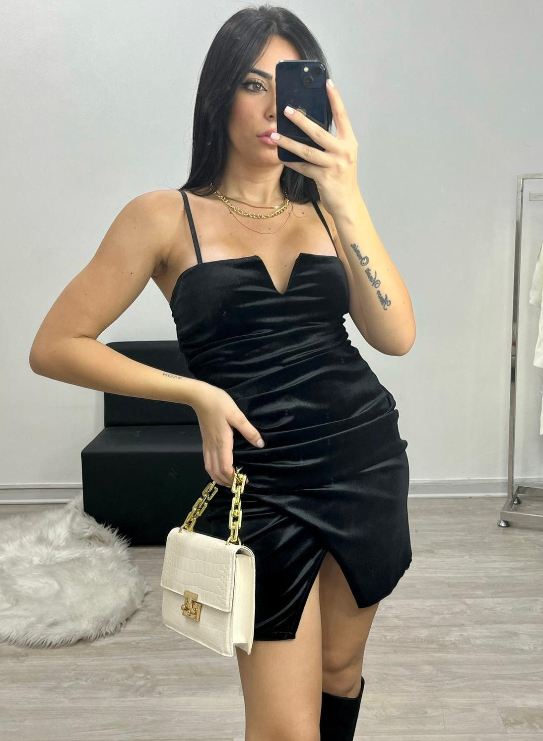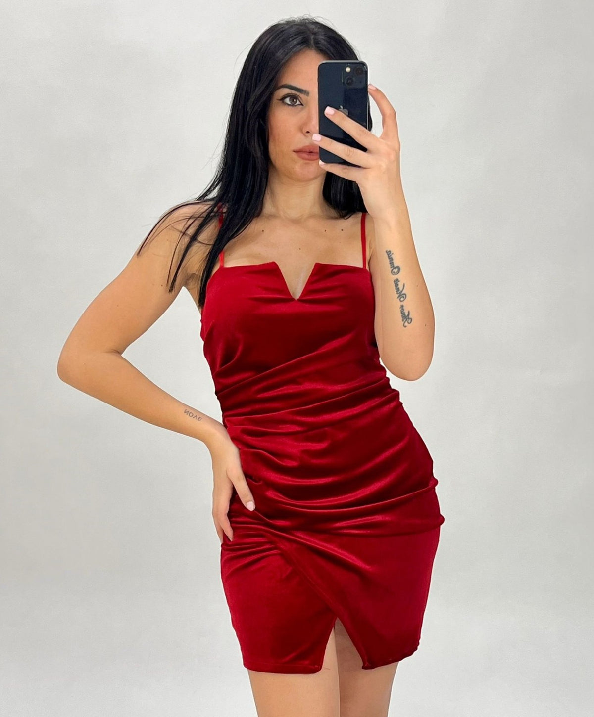 Abito in ciniglia con coppe preformate, spalline reoglabili e gonna a portafoglio con drappeggio. Fabbricato in Italia.