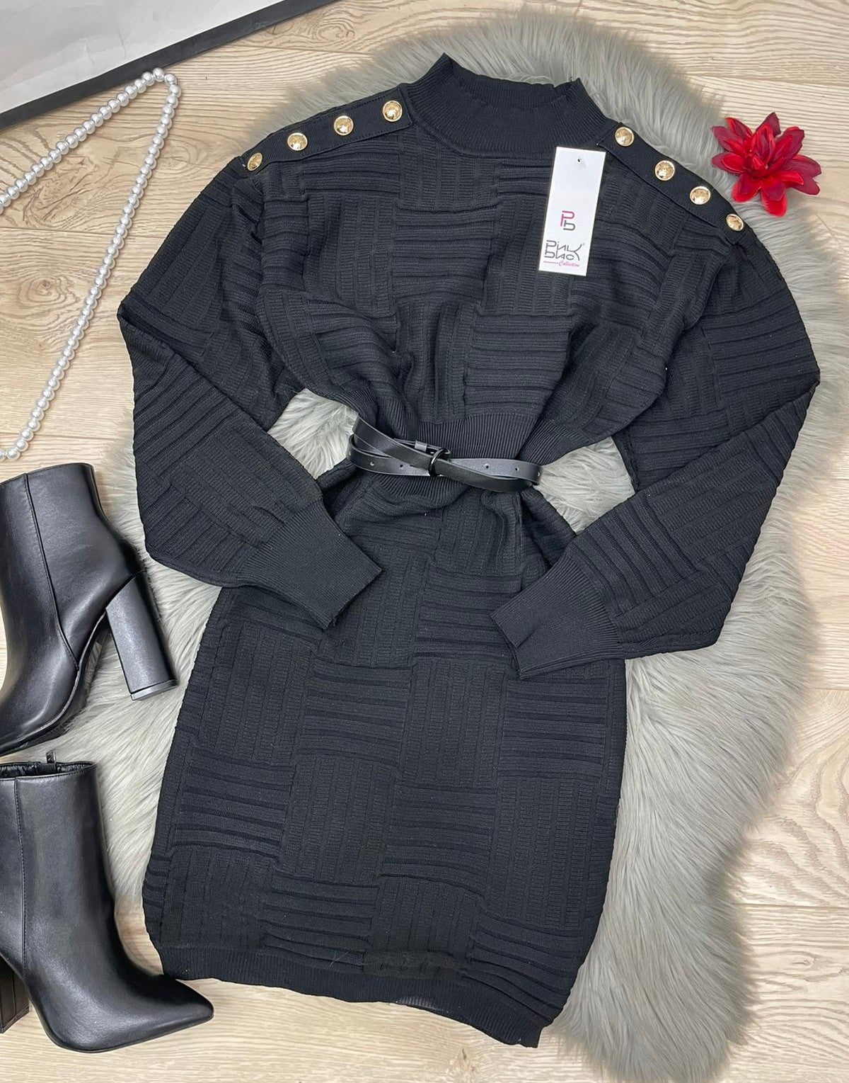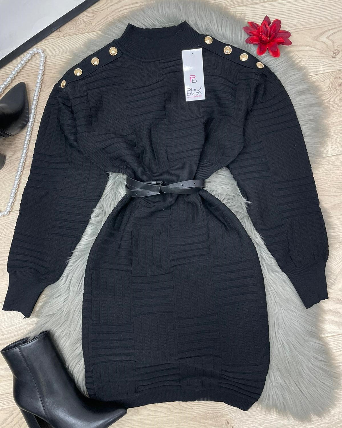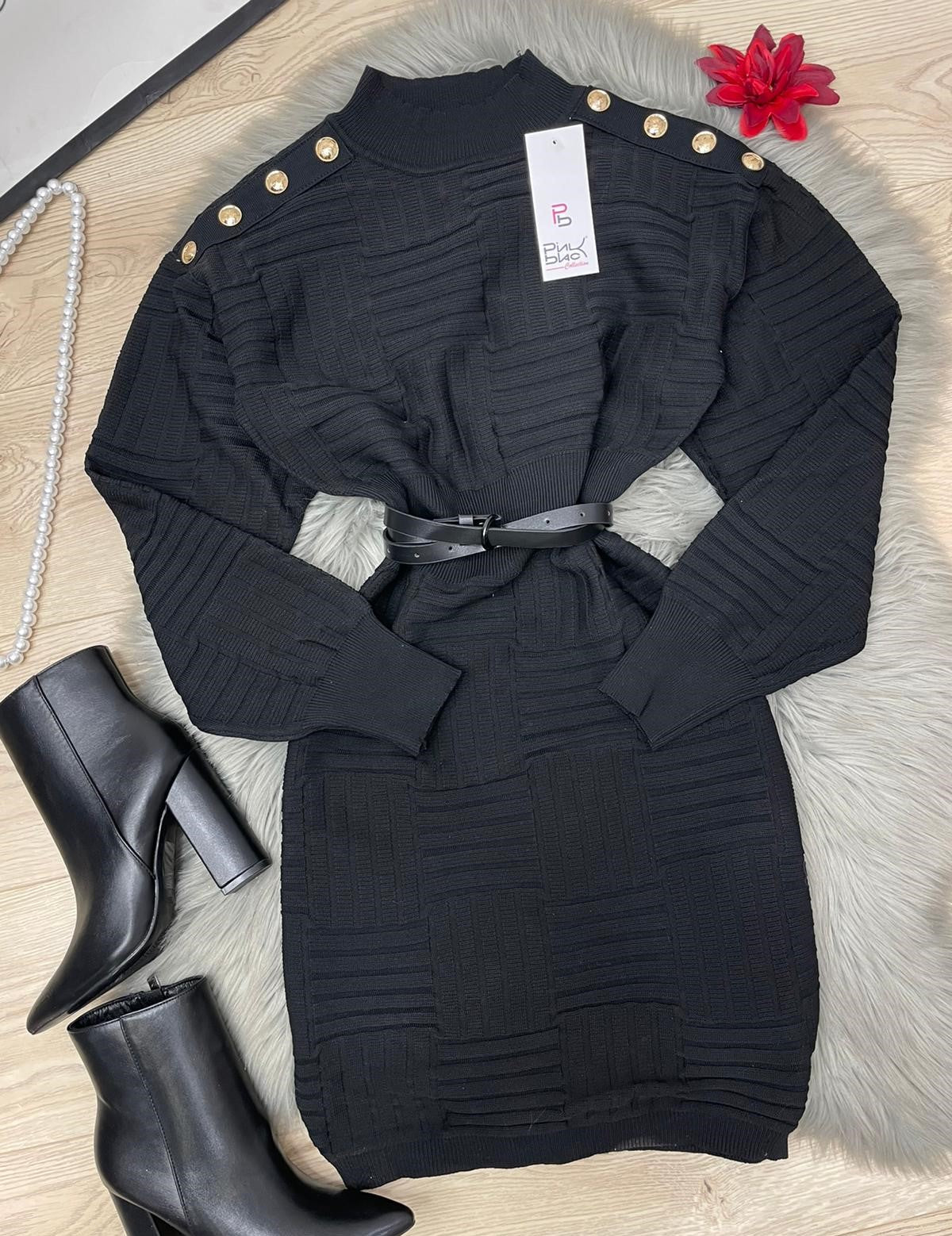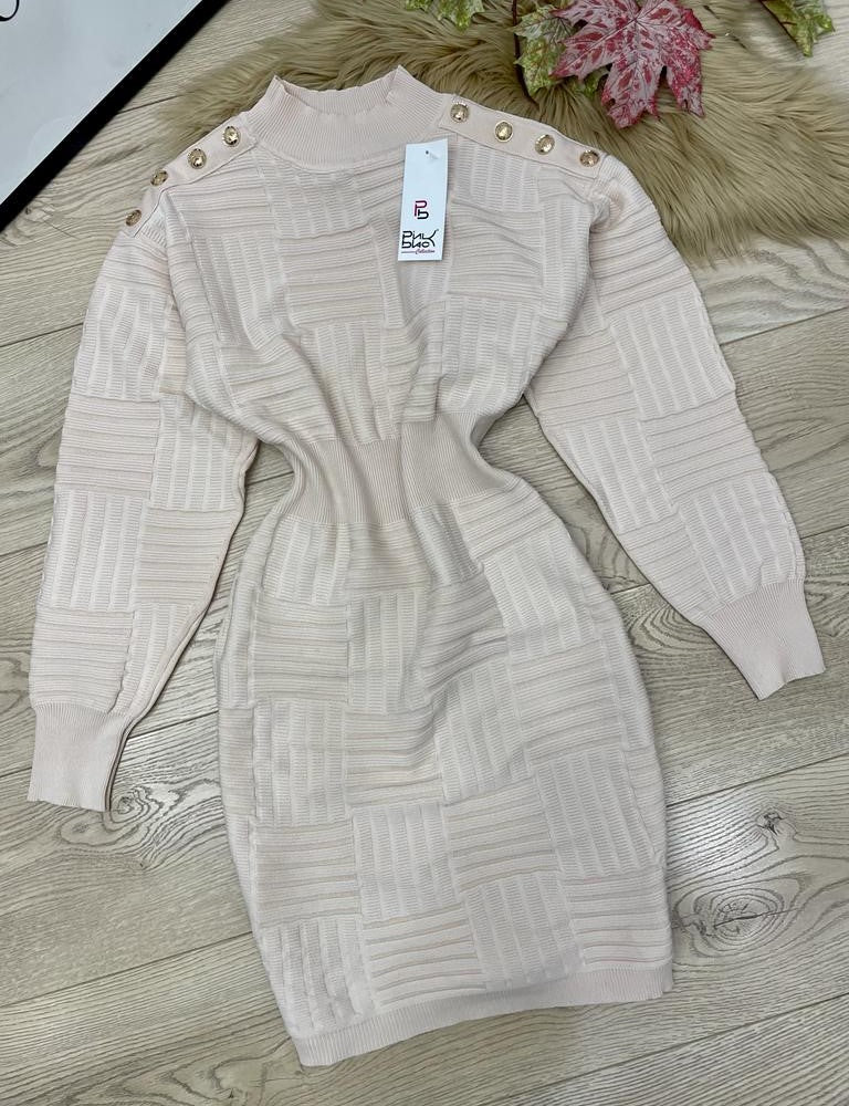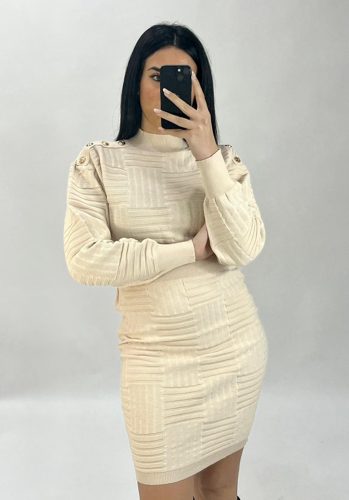 Abito in viscosa con applicazione di bottoni e fascia elastica in vita. Fabbricato in all'estero.