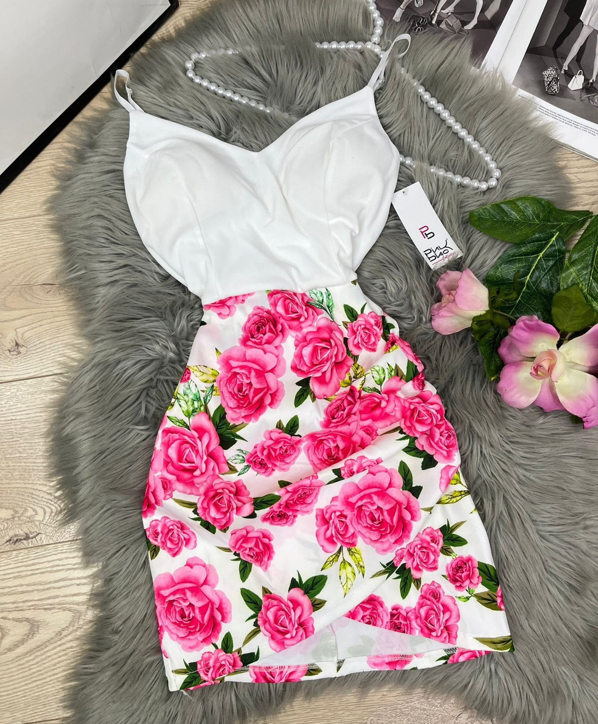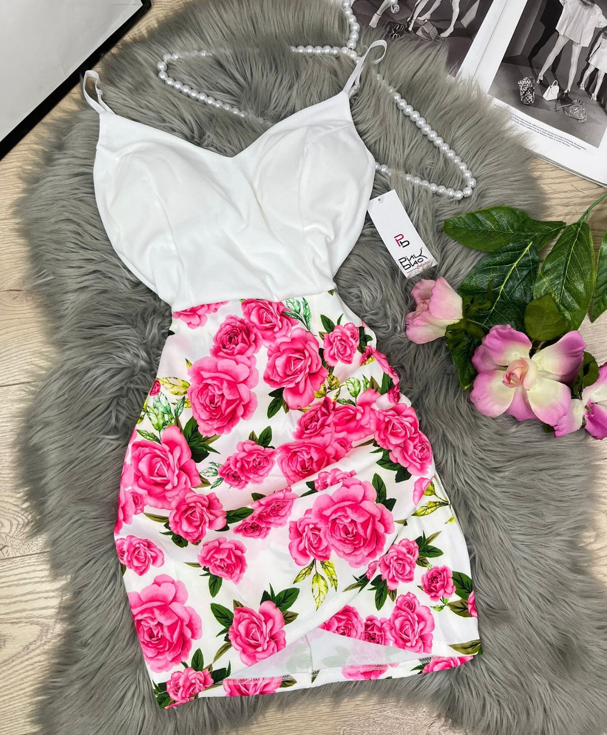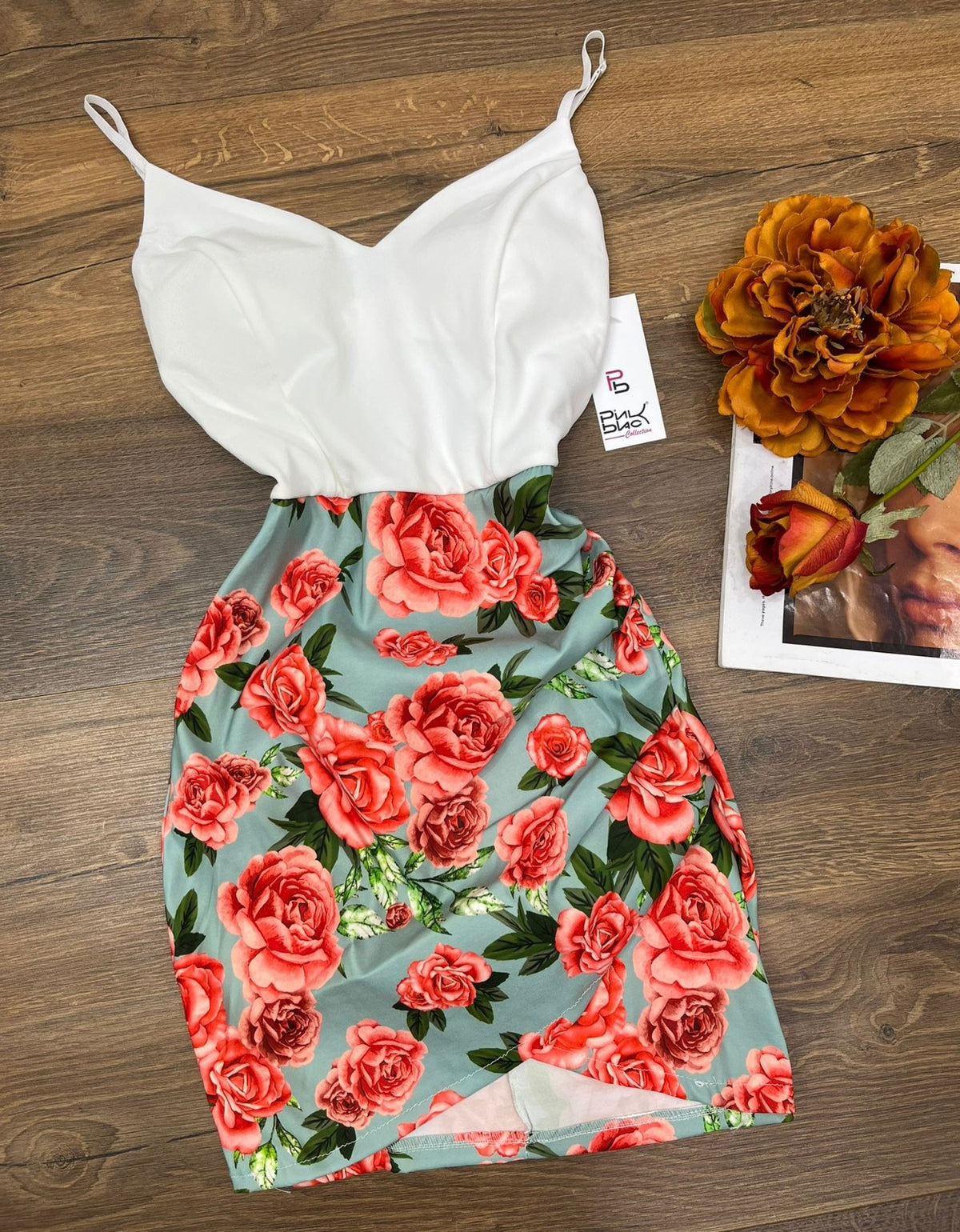 Abito in tessuto scuba crepe con fantasia floreale, coppe preformate, spalline regolabili e gonna a portafoglio con drappeggio. Fabbricato in Italia.